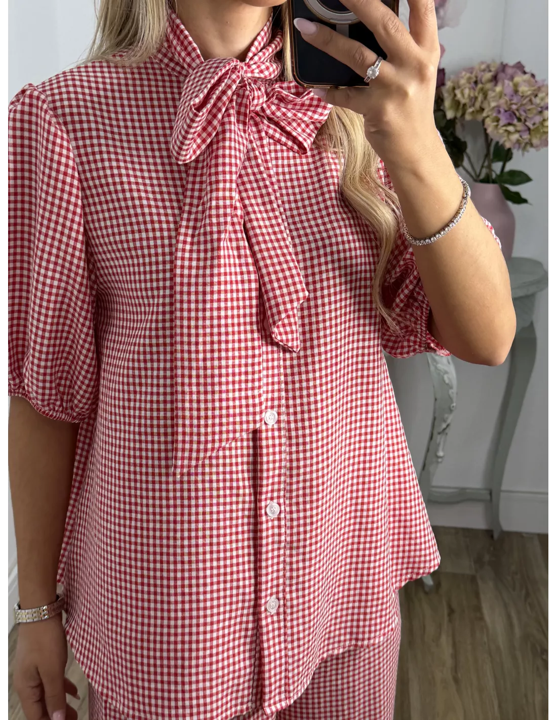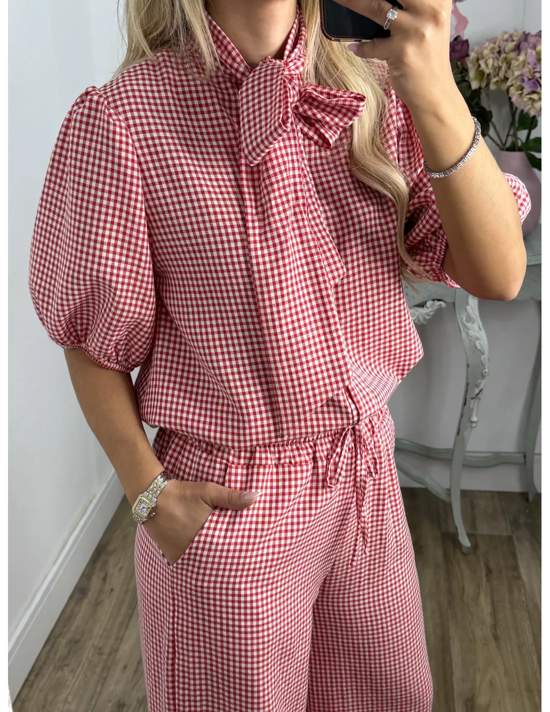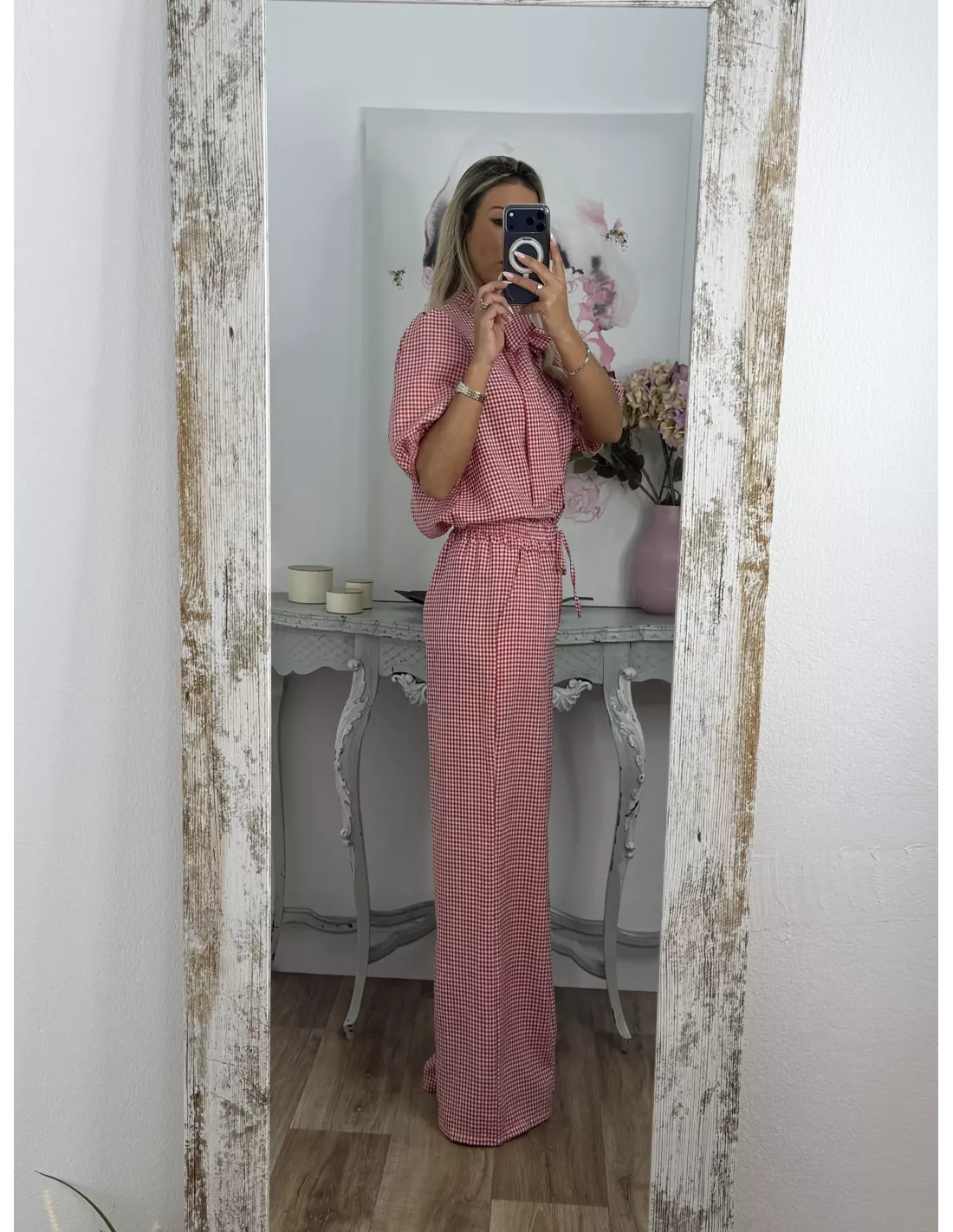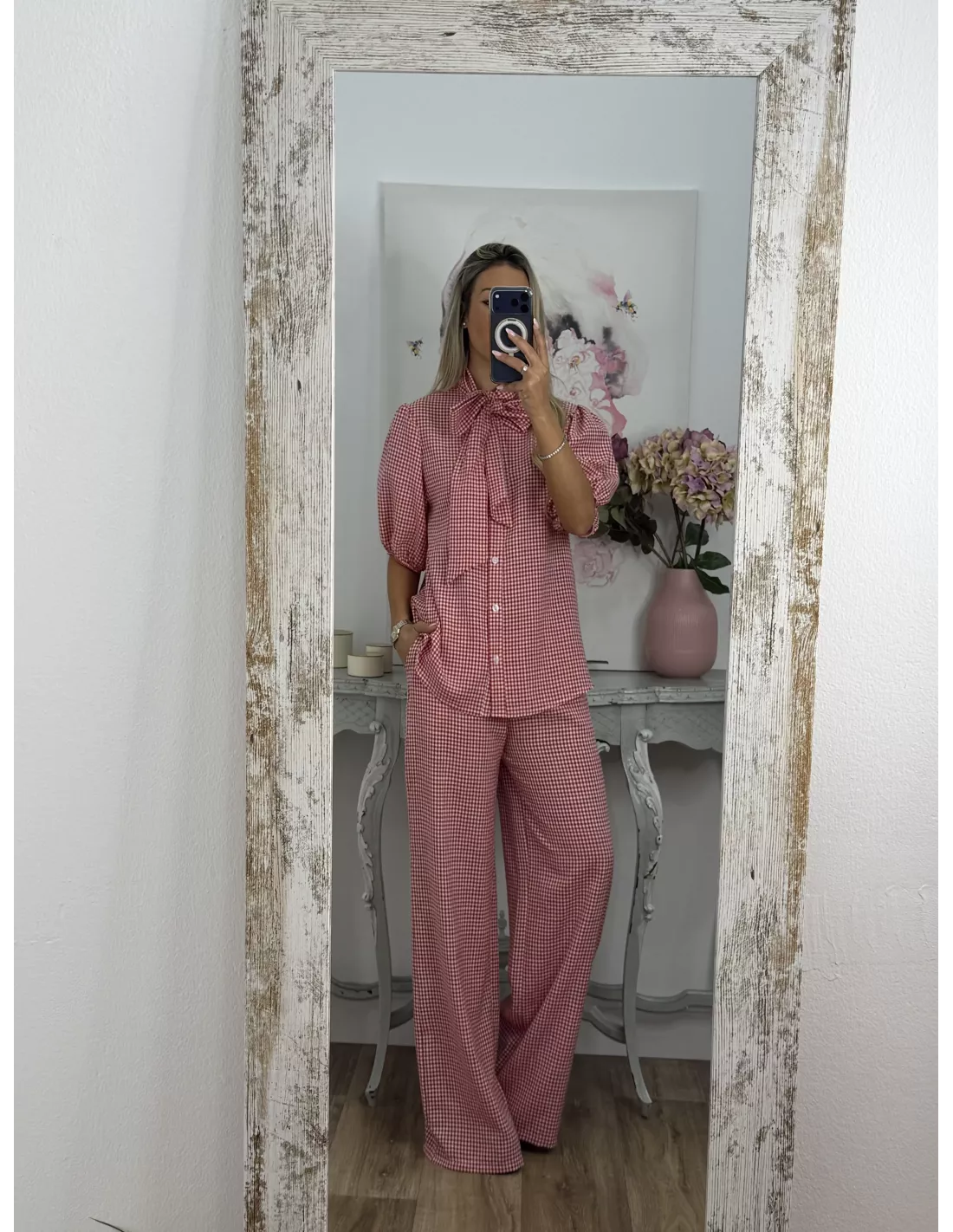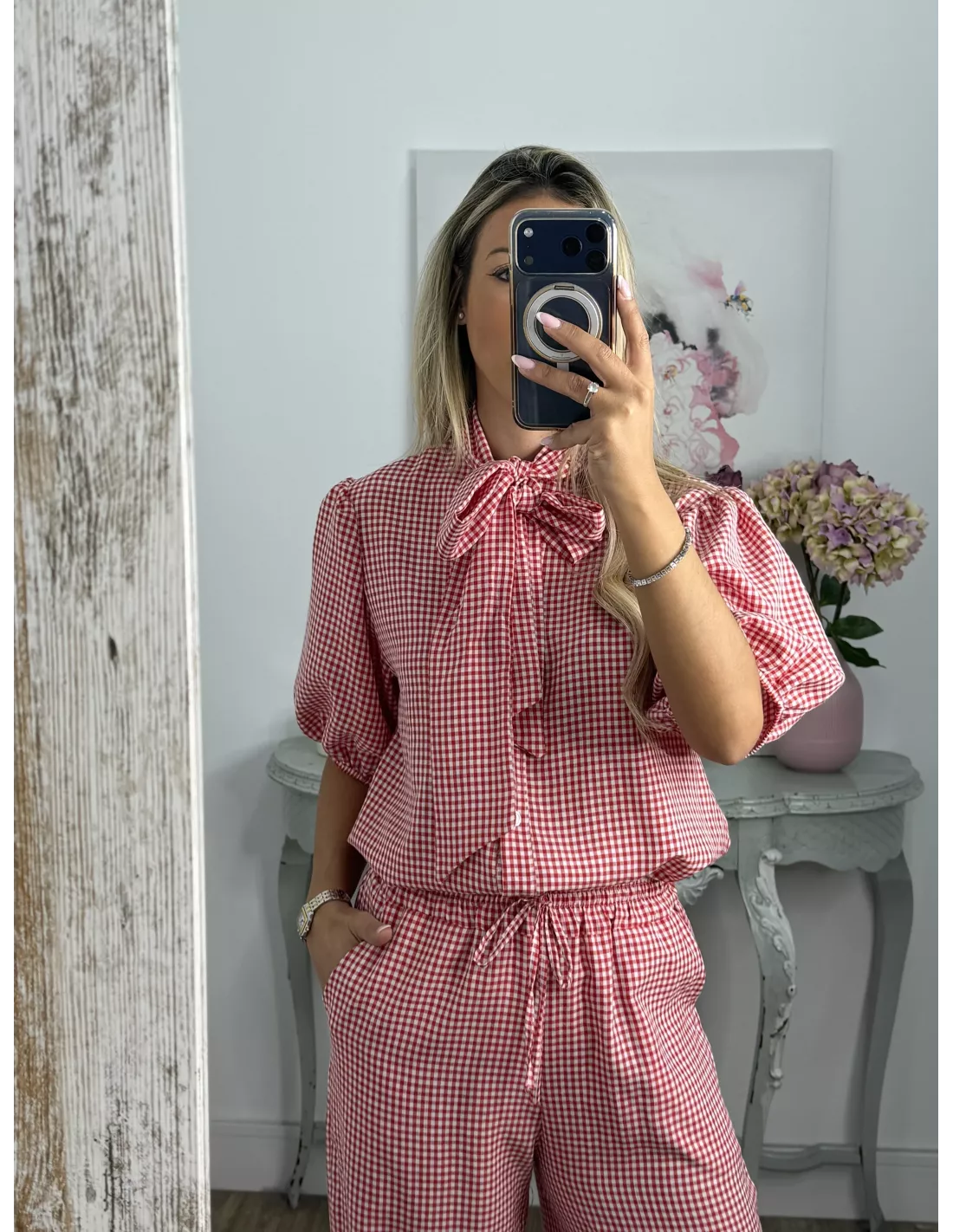 Conjunto de camisa y pantalón de cuadro Vichy. La camisa abotonada manga farol y con lazada en el cuello. Pantalón de corte recto con goma en la cintura y bolsillos tipo chino.