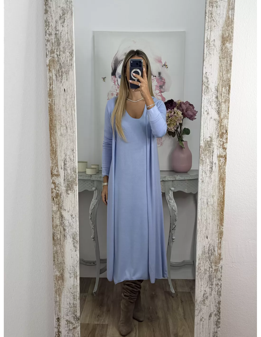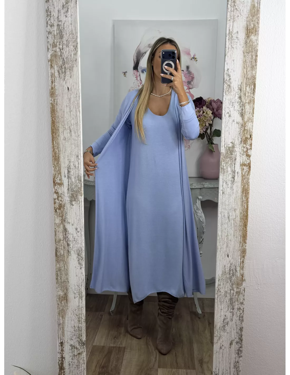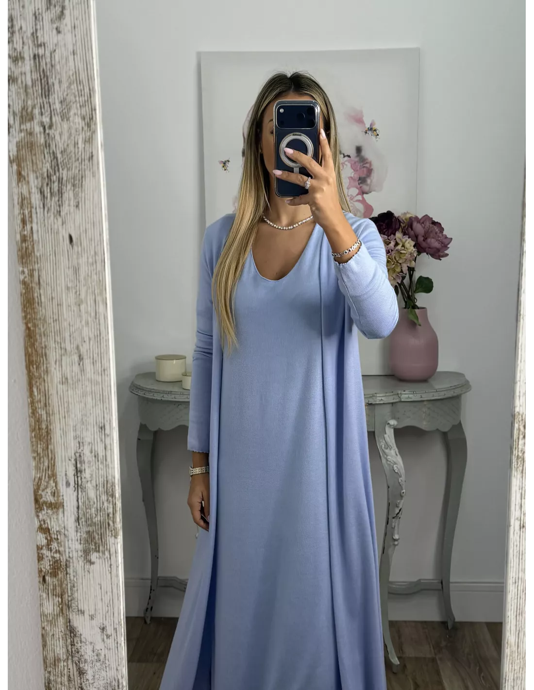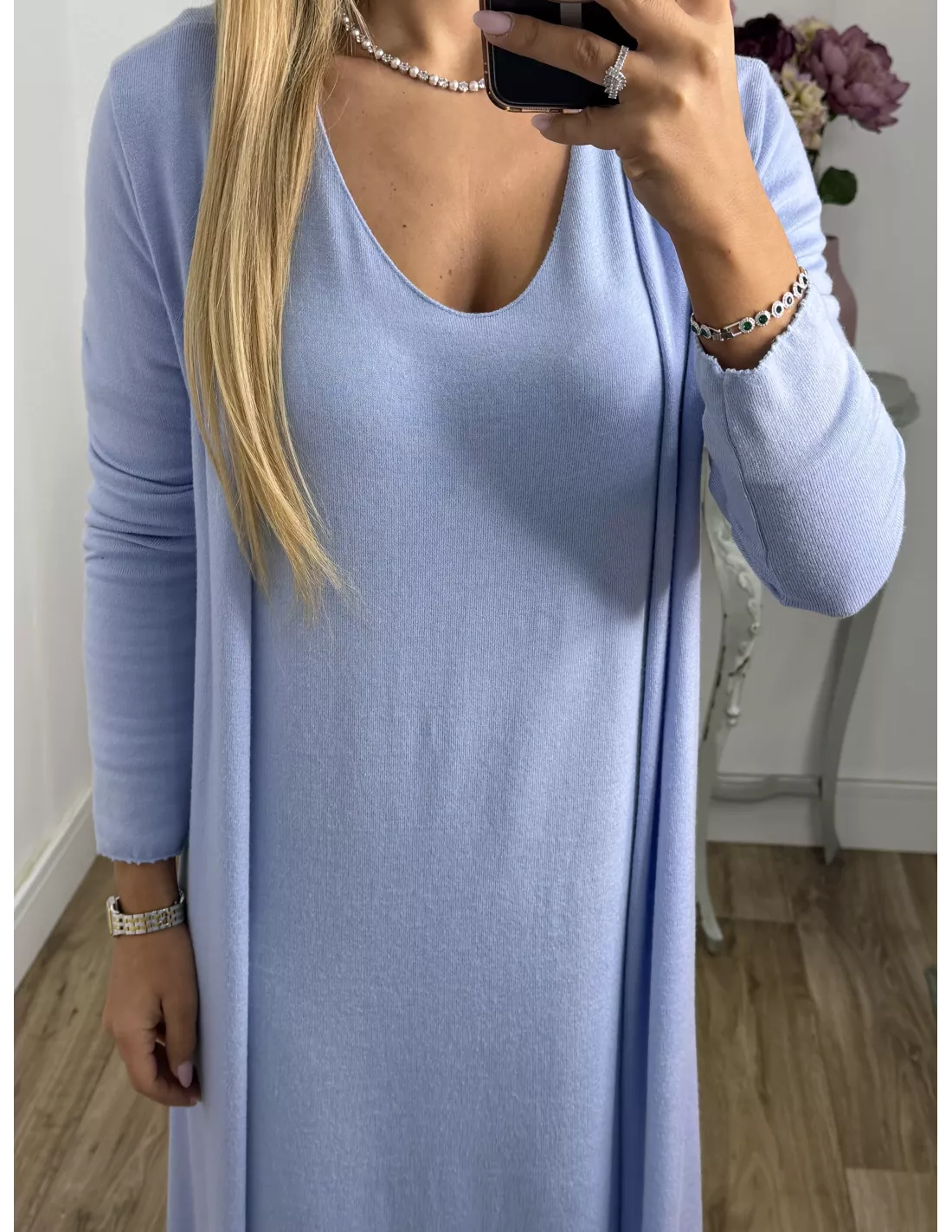Conjunto cardigan y vestido punto azul celeste