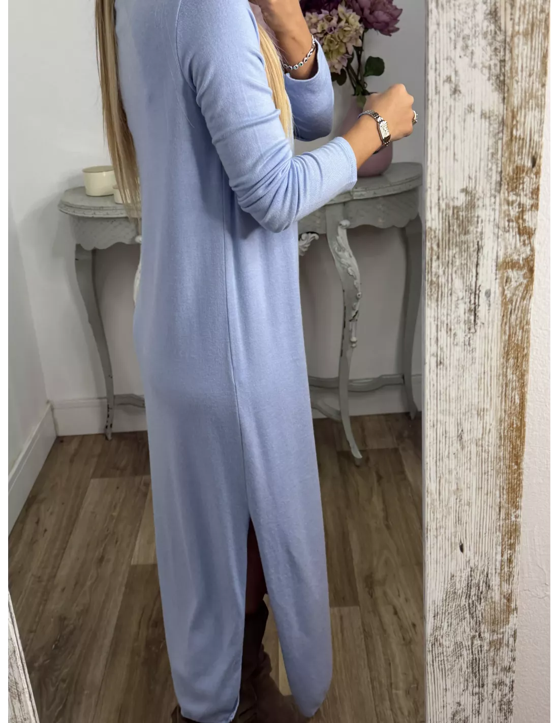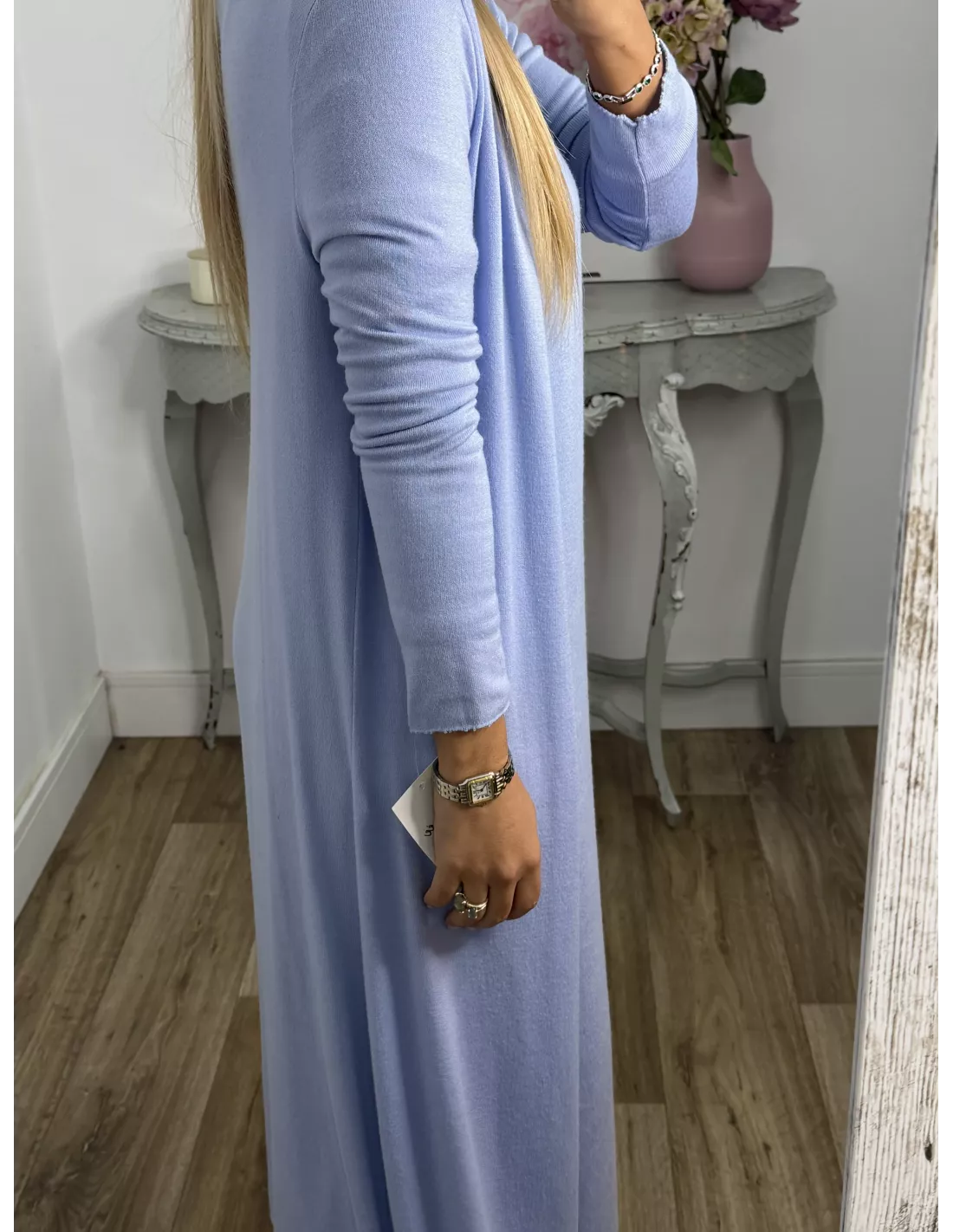 Conjunto de cardigan y vestido de punto. El vetiedo es un pelin más largo que el cardiga. El cardigan es a la caida, no lleva botones. El vestido tiene abertura lateral en ambos lados en la parte de abajo y es más largo por detrás.