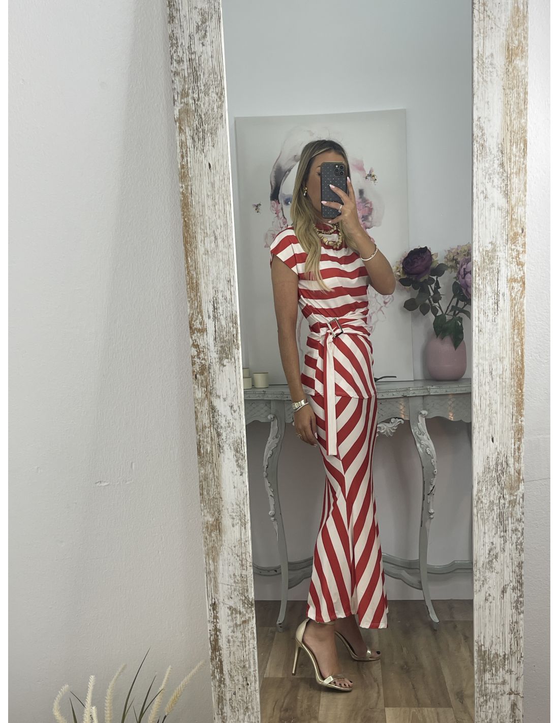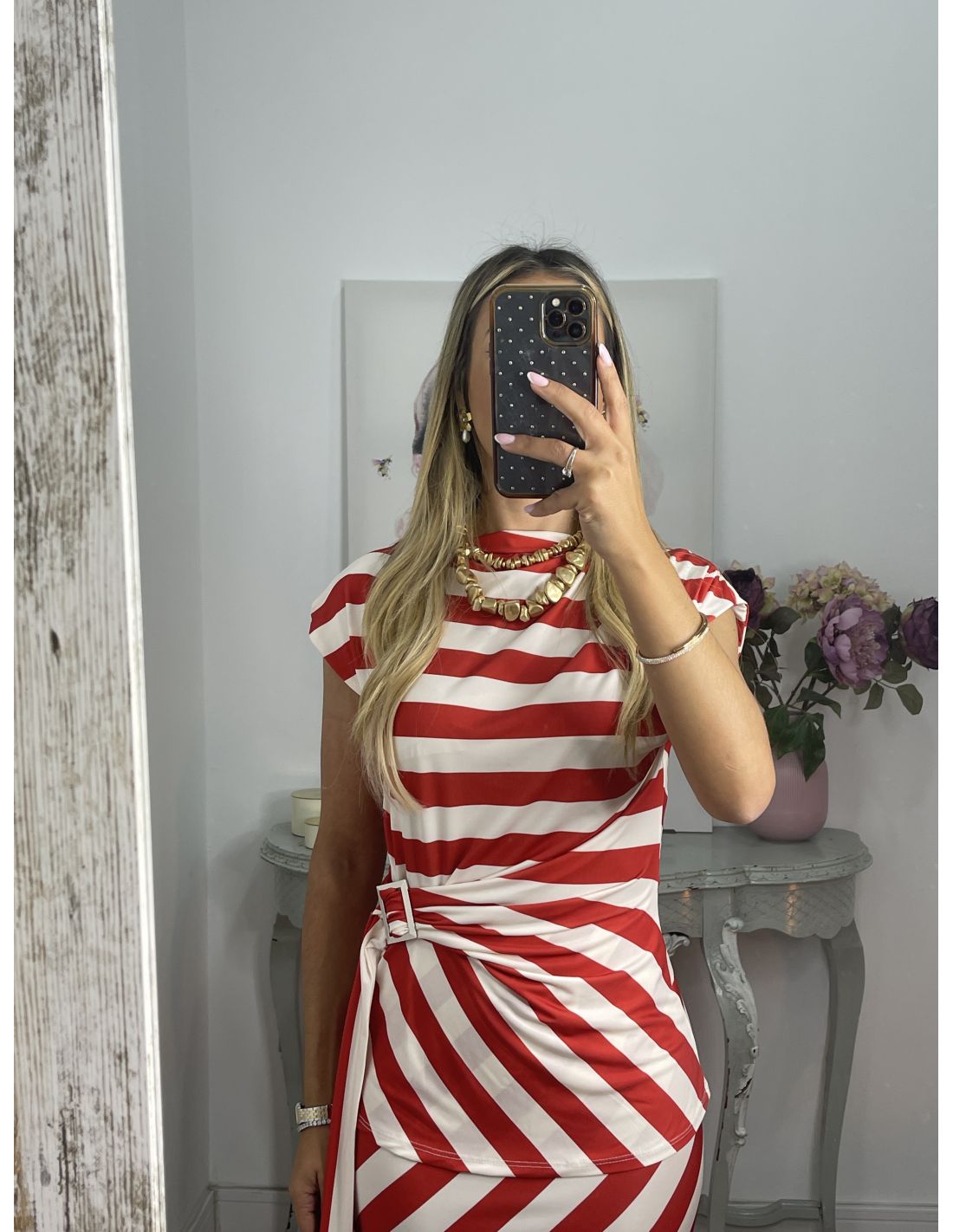 Conjunto de blusa y falda. El tejido es punto de seda o licra fría. La blusa tiene un adorno en la zona de la cintura y disimula la barriga. La falda lleva goma en la cintura y es de corte sirena. No lleva forro.