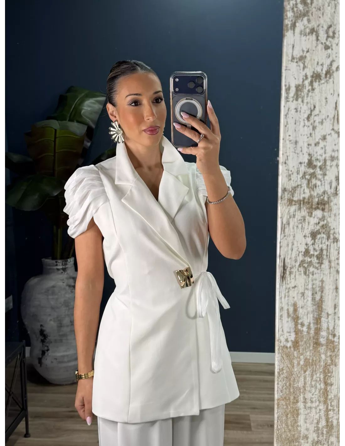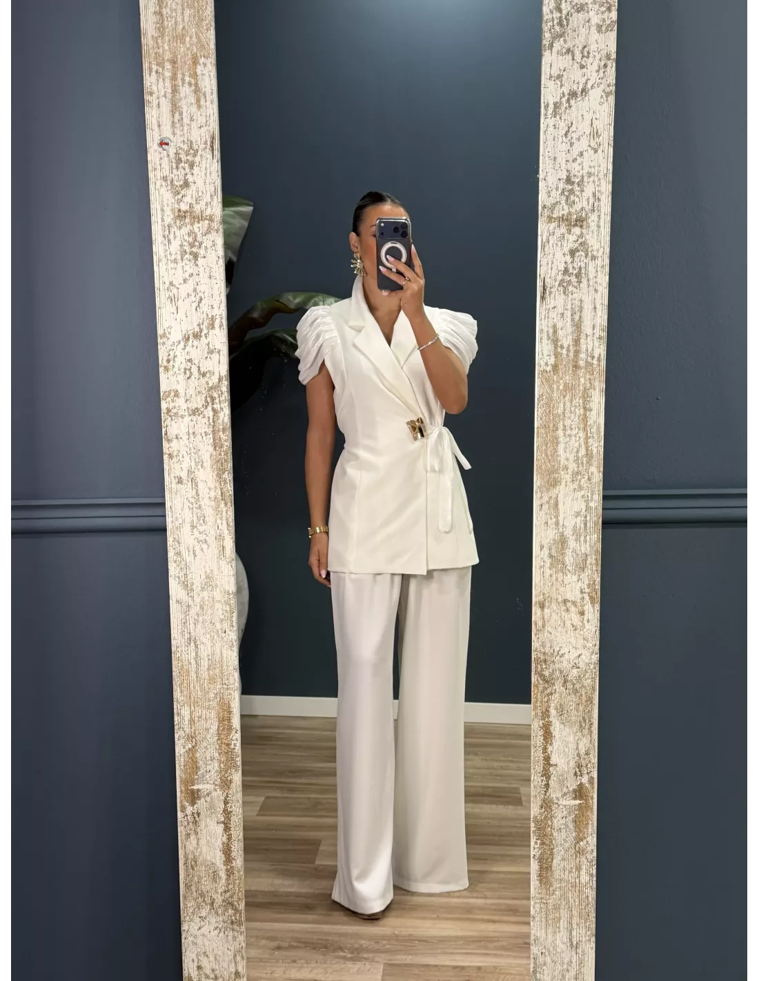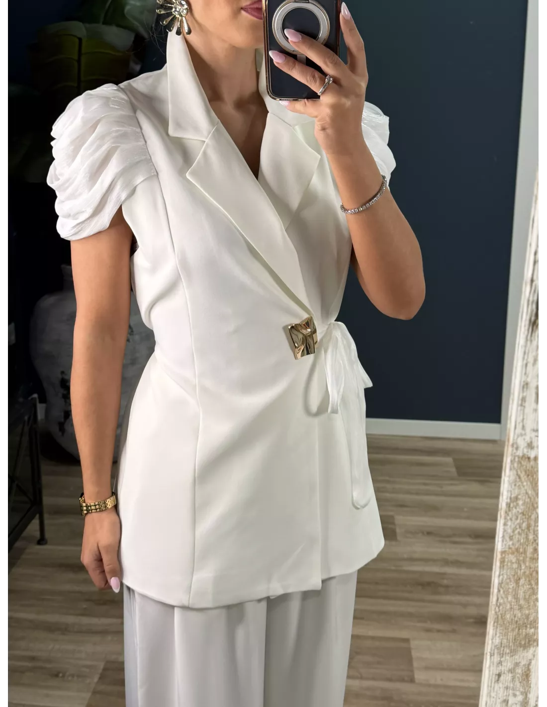 Traje de chaqueta y pantalón. Chaqueta de corte cruzado con detalle dorado. Lleva las mangas en organza. Pantalón de corte recto con pinzas