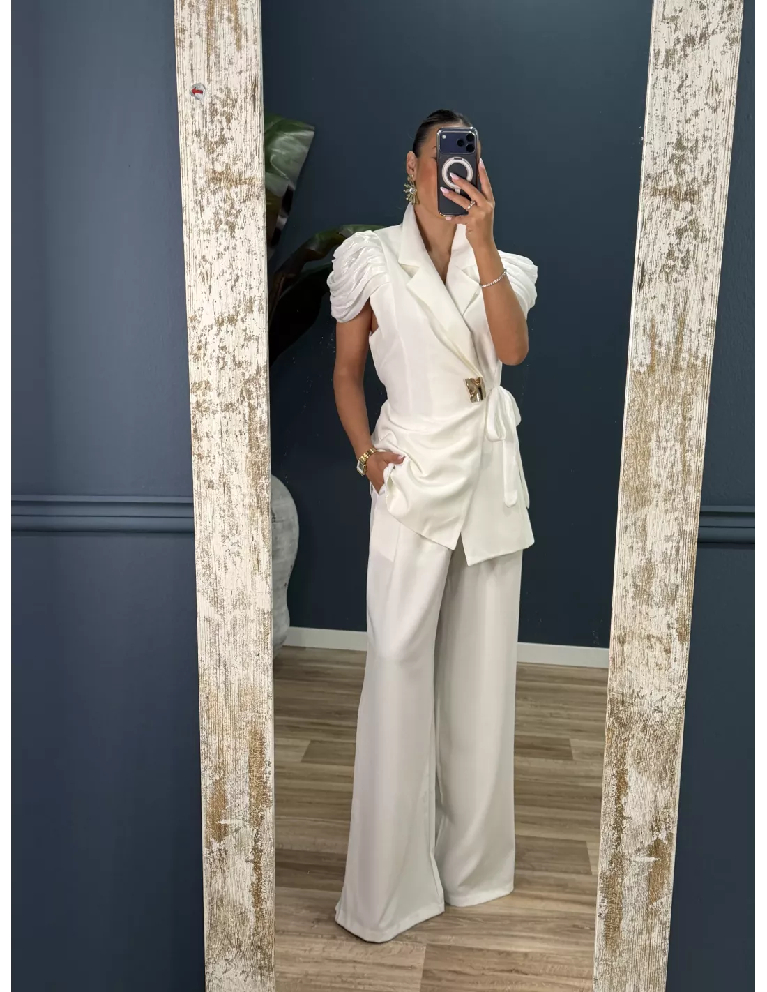 Traje de chaqueta y pantalón. Chaqueta de corte cruzado con detalle dorado. Lleva las mangas en organza. Pantalón de corte recto con pinzas