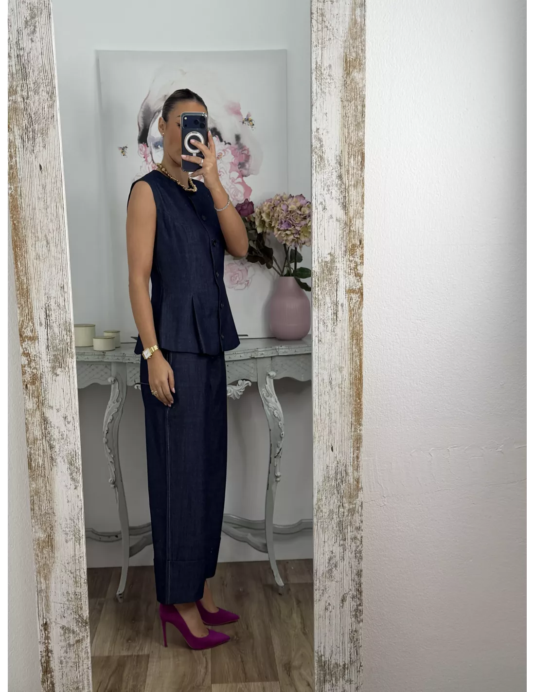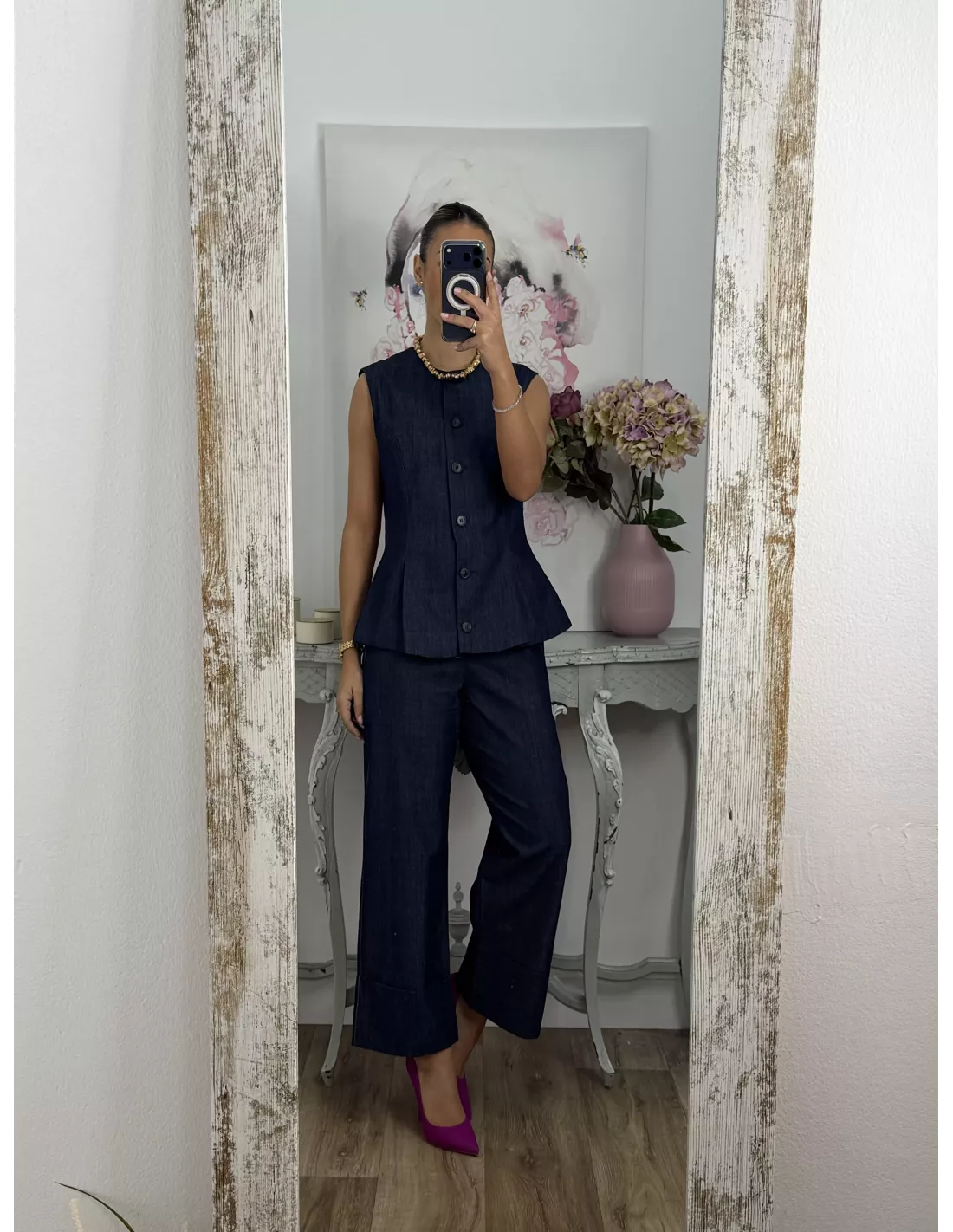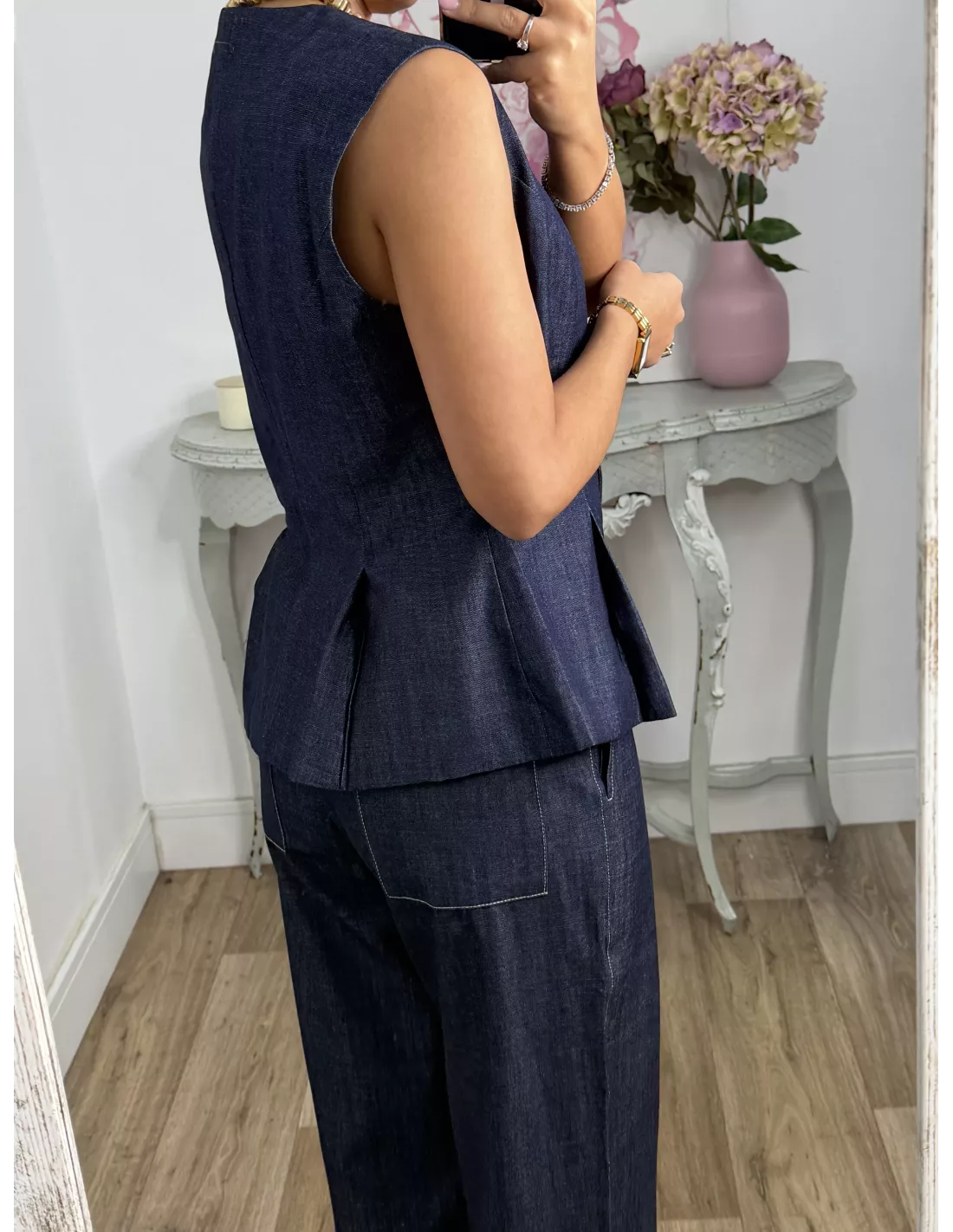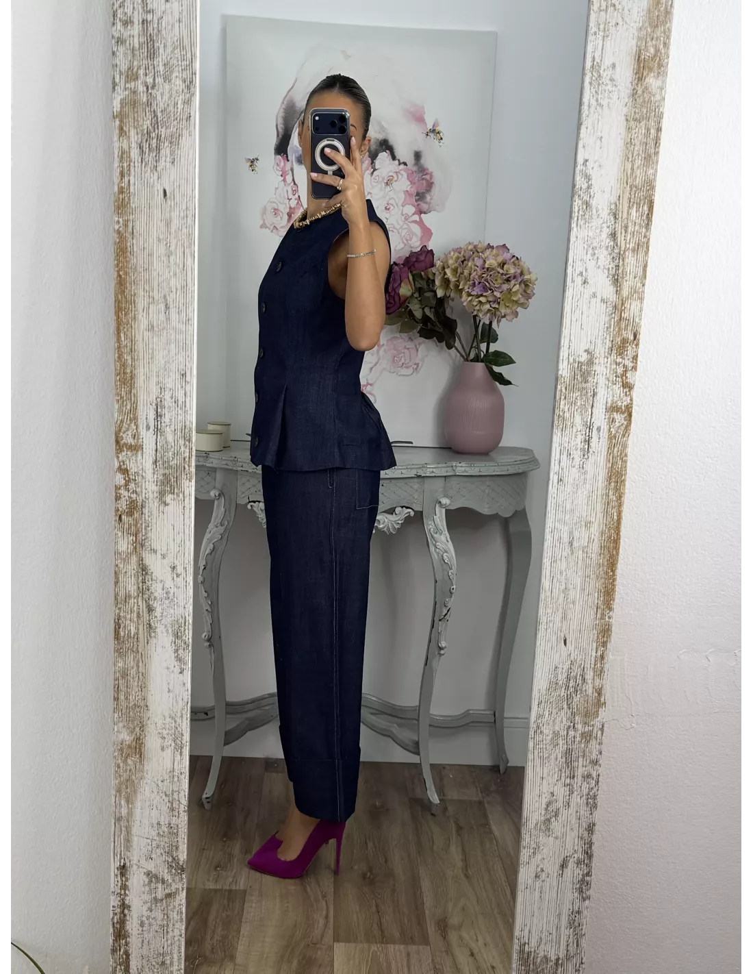 Conjunto de chaleco y pantalón. El chaleco es de cuello a la caja va forrado. Pantalón tipo culotte Con una vuelta abajo y pespuntes en claro.