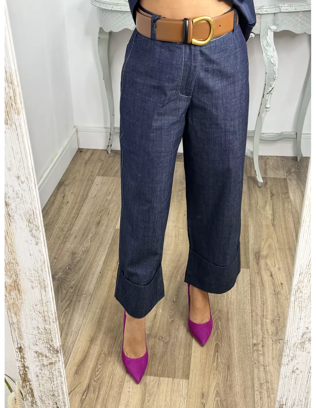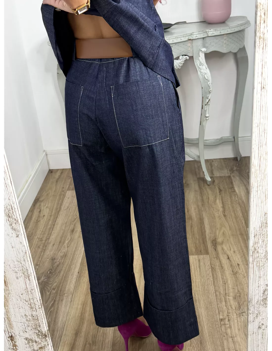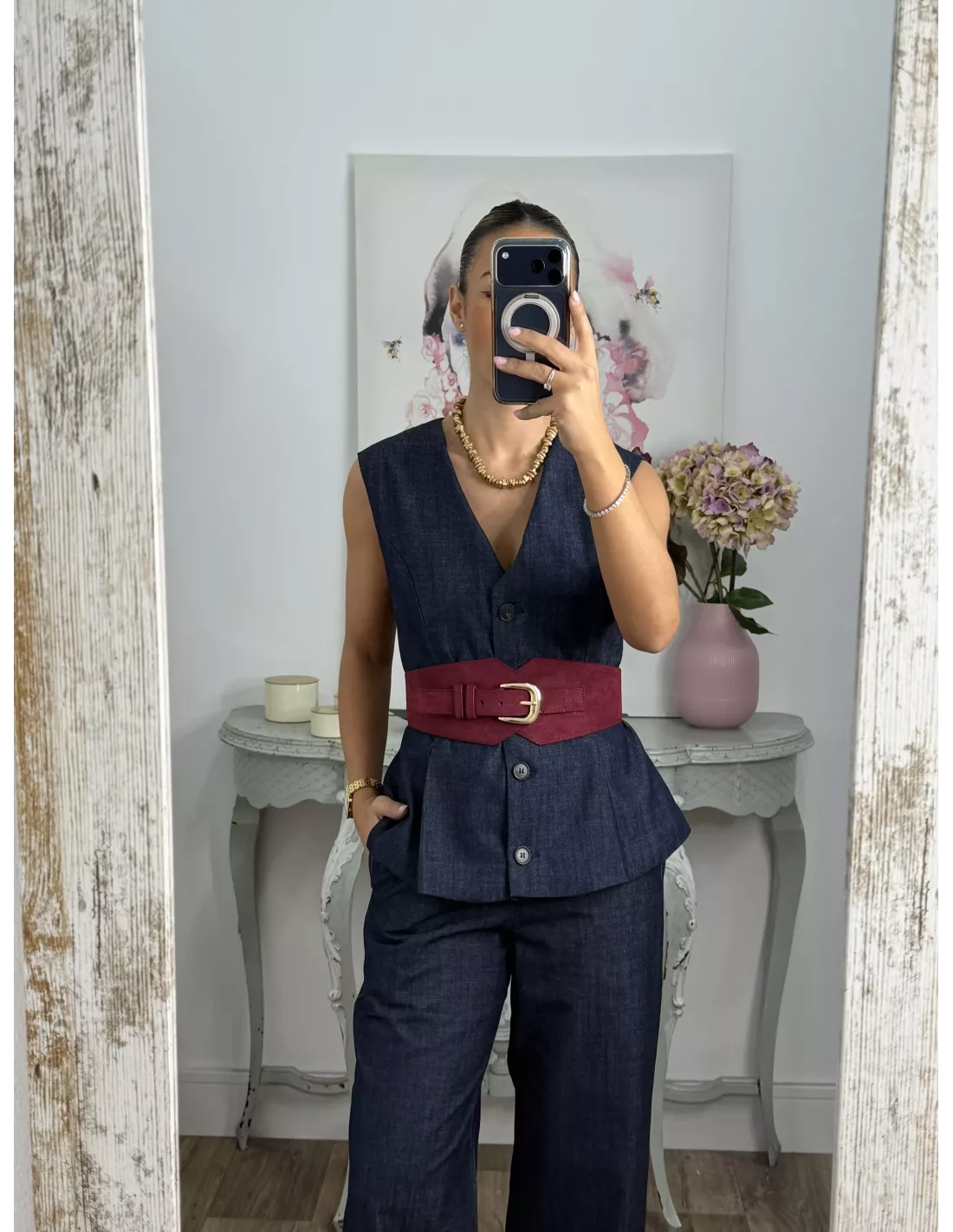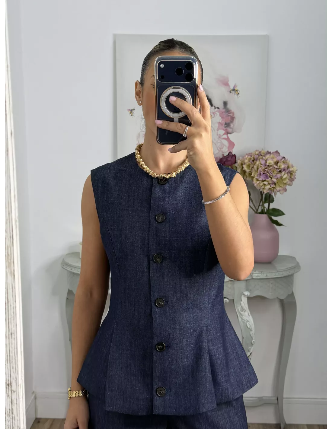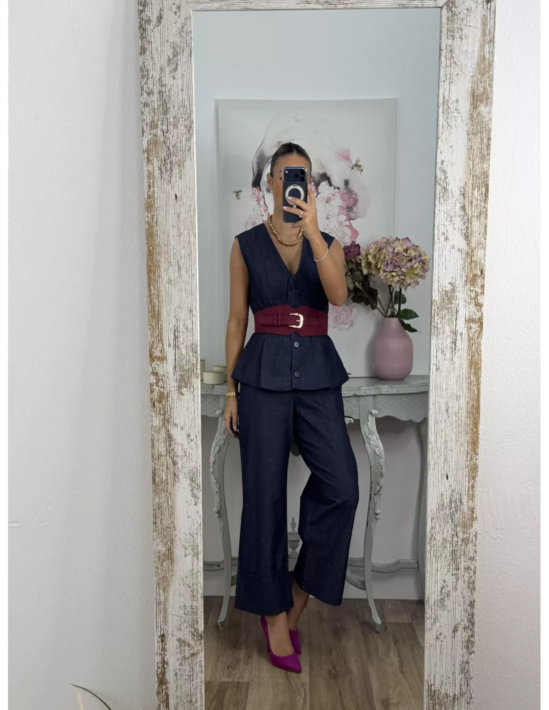 Conjunto de chaleco y pantalón. El chaleco es de cuello a la caja va forrado. Pantalón tipo culotte Con una vuelta abajo y pespuntes en claro.