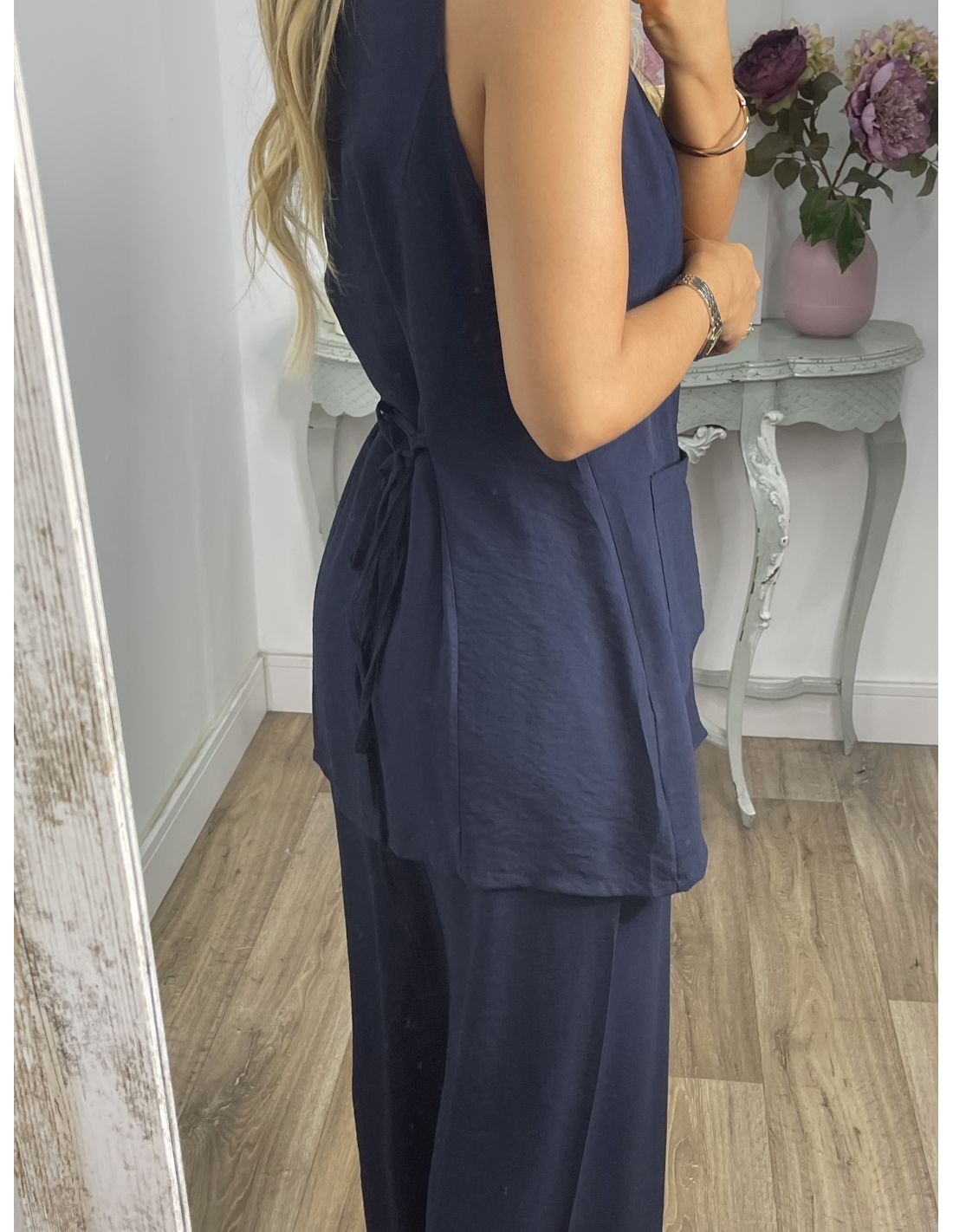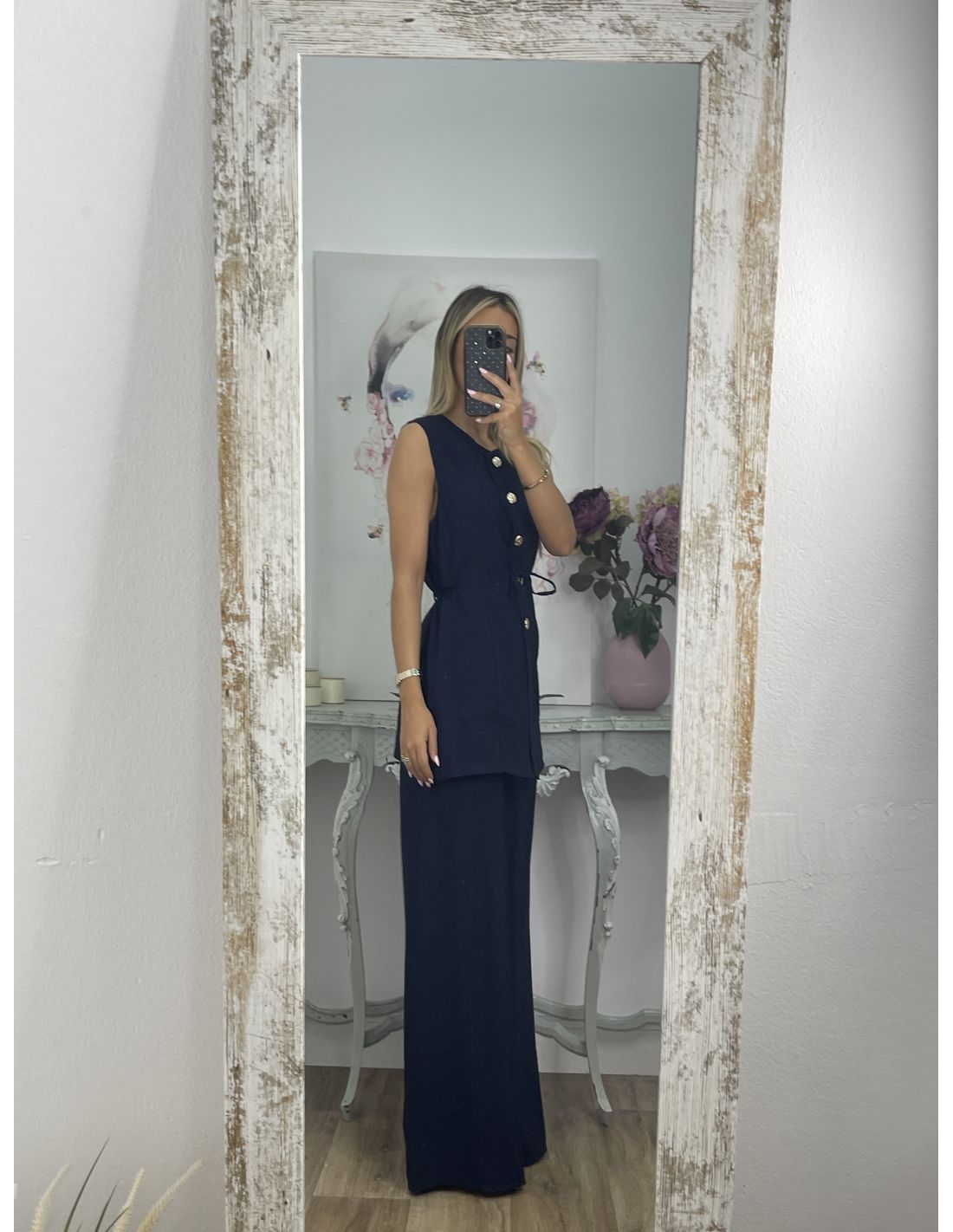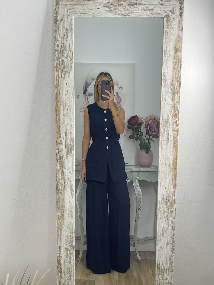 Conjunto de chaleco y pantalón.El chaleco lleva botones dorados tiene bolsillos, no va forrado y trae un cinturón del mismo tejido. Pantalón de pata ancha que llega goma en la cintura.
