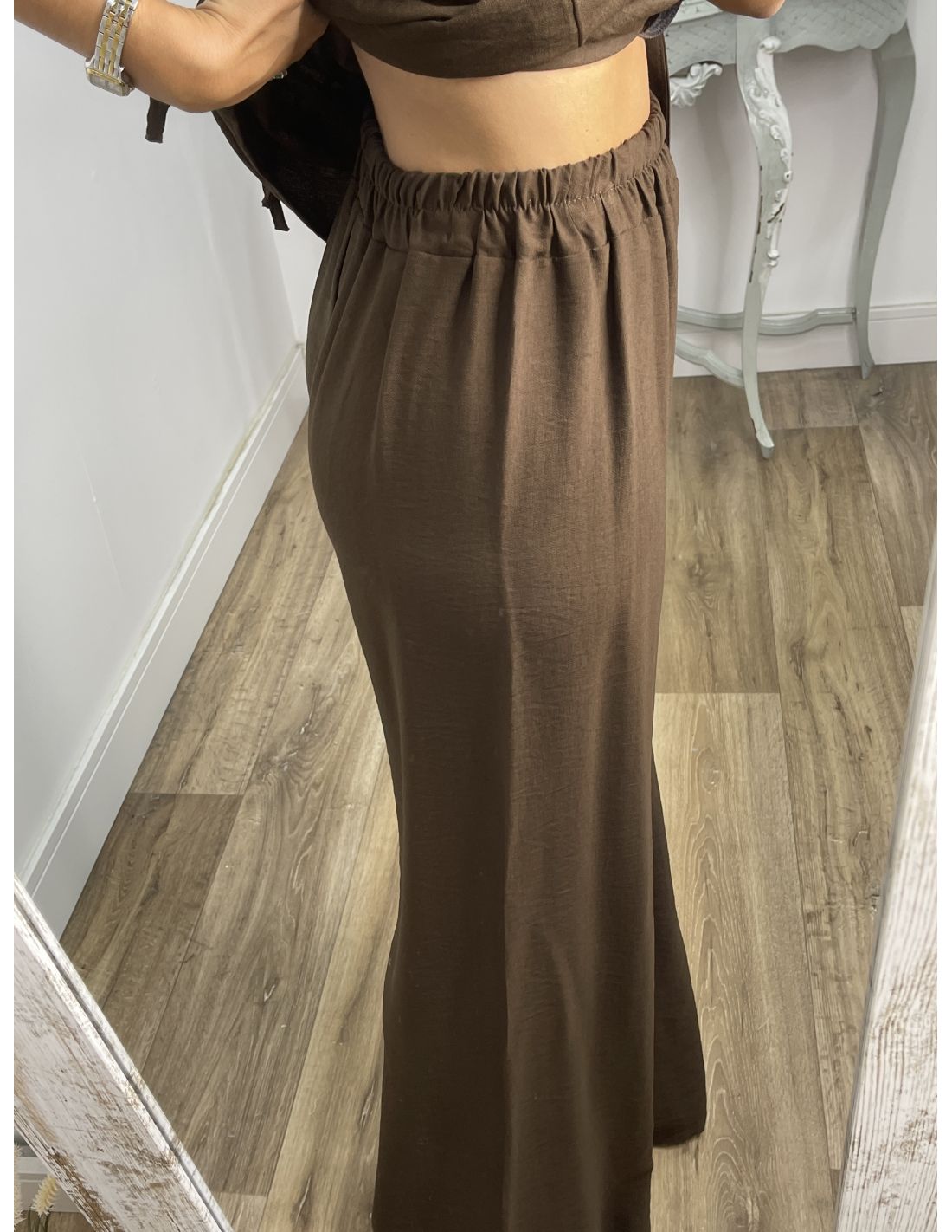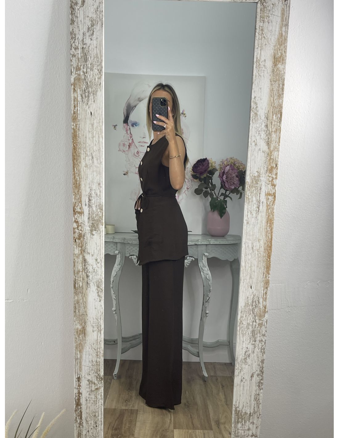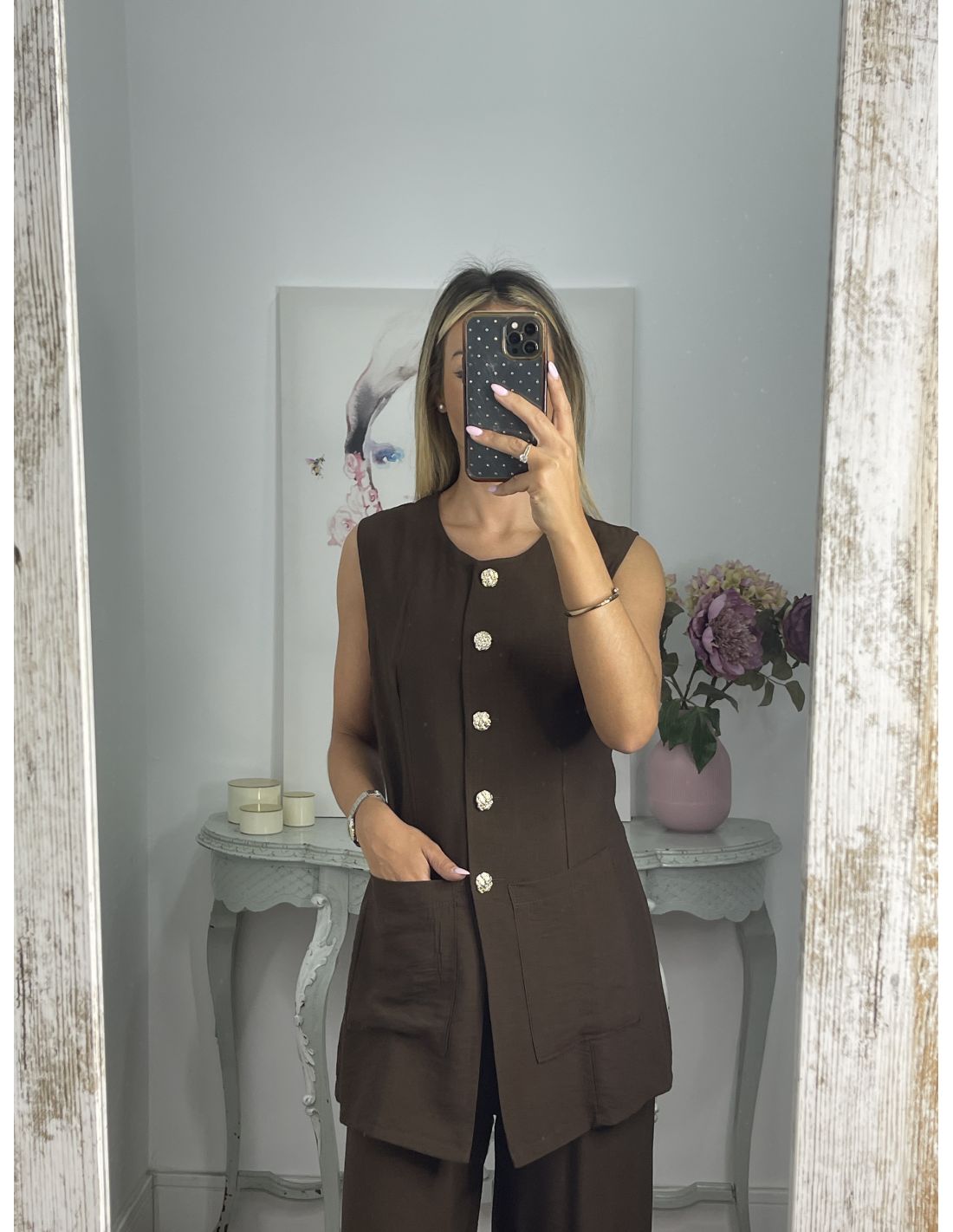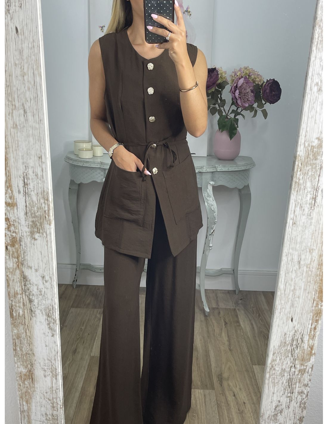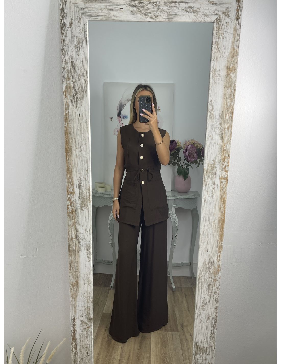 Conjunto de chaleco y pantalón.El chaleco lleva botones dorados tiene bolsillos, no va forrado y trae un cinturón del mismo tejido. Pantalón de pata ancha con goma en la cintura.