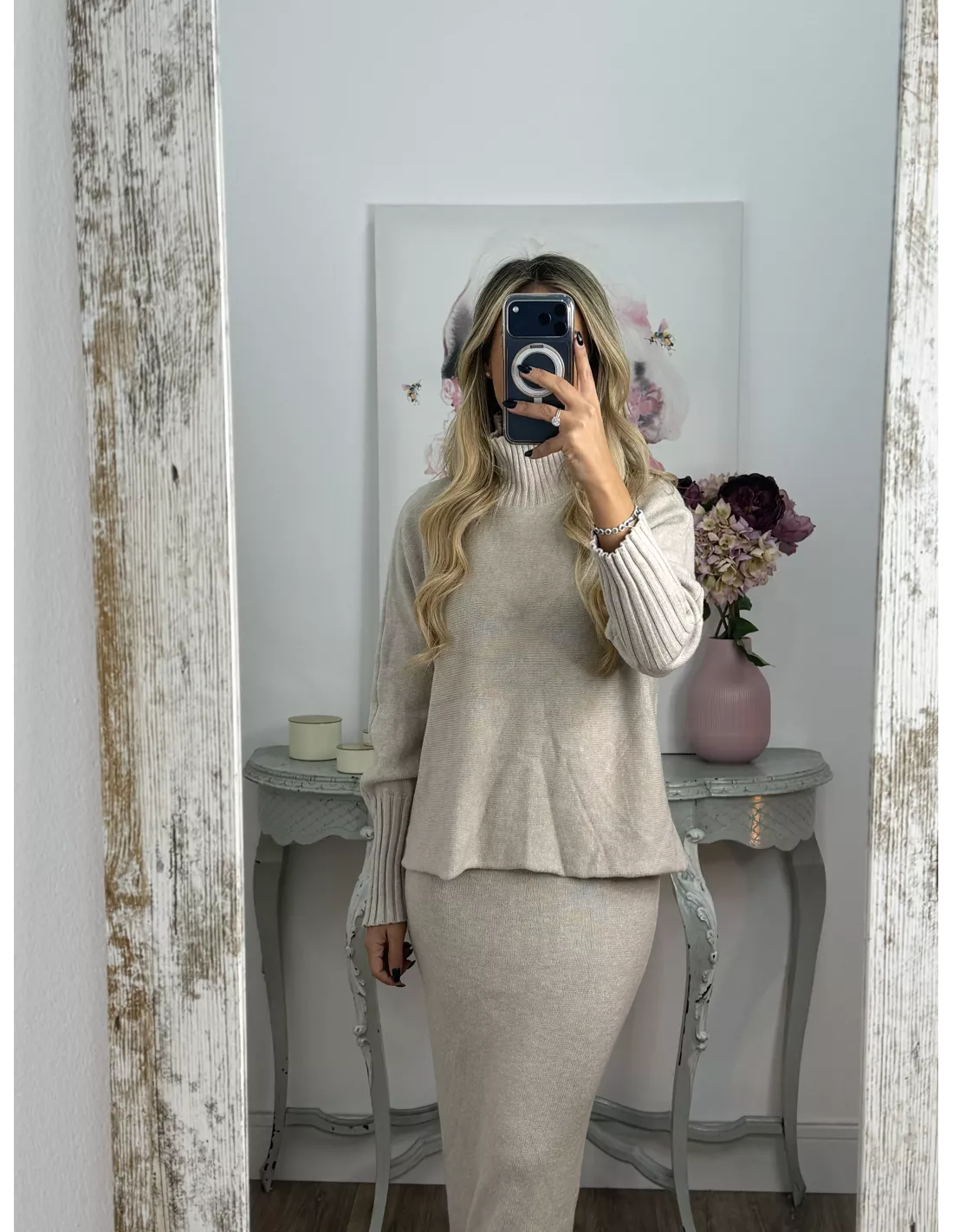 Conjunto de puntos de jersey y falda. El jersey es de cuello chimenea y de corte recto. La falda lleva goma en la cintura y es corte lápiz.