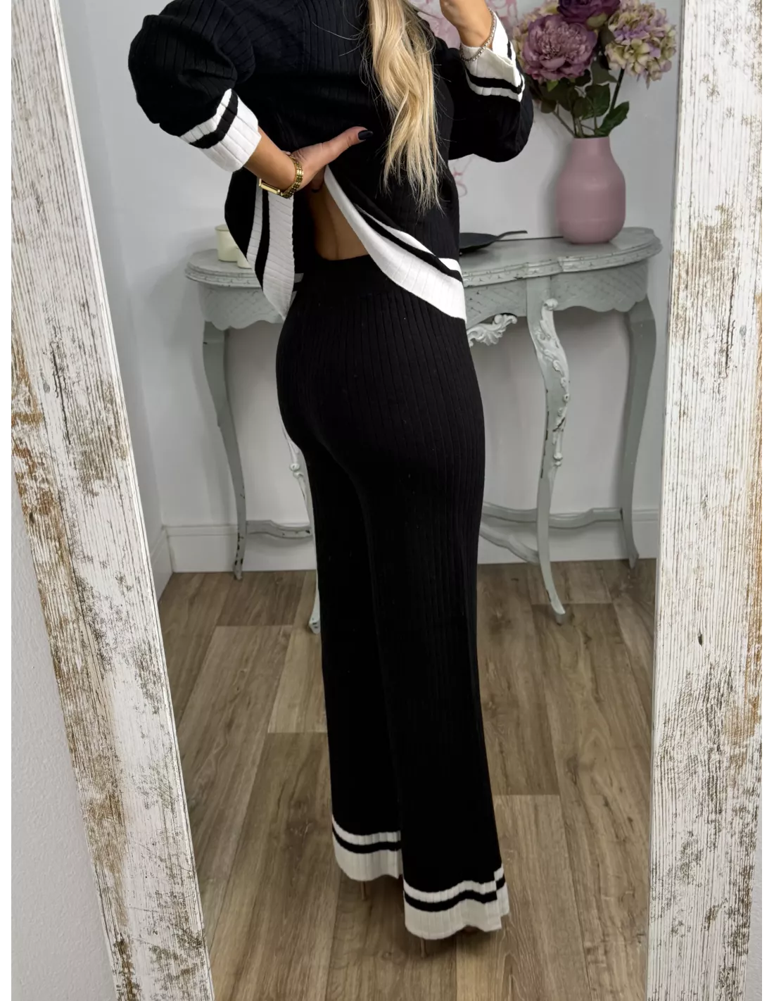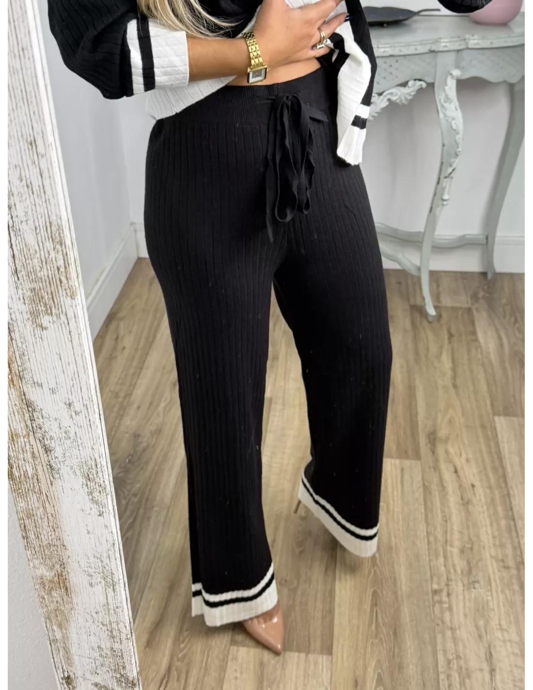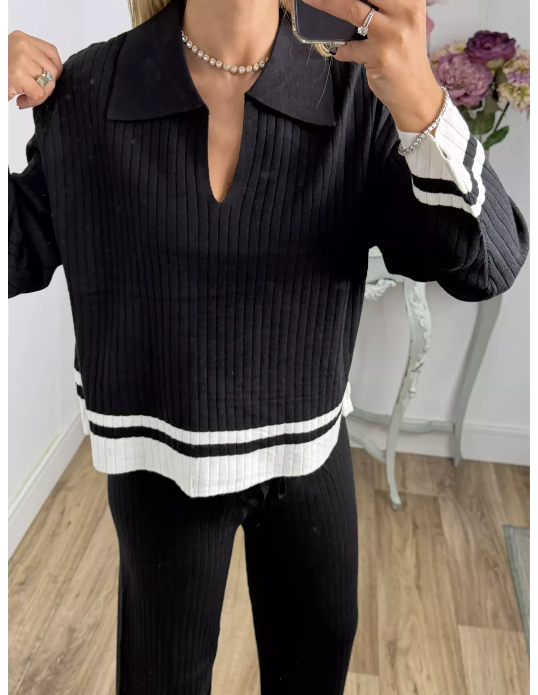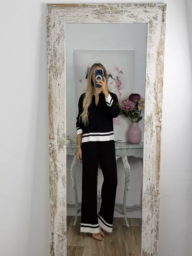 Conjunto de jersey pantalón. El jersey es tipo polo y la parte de abajo lleva una franja en otro color. El pantalón es de corte recto con goma en la cintura, no tiene bolsillos, no se transparenta, el tejido es de punto muy suave.