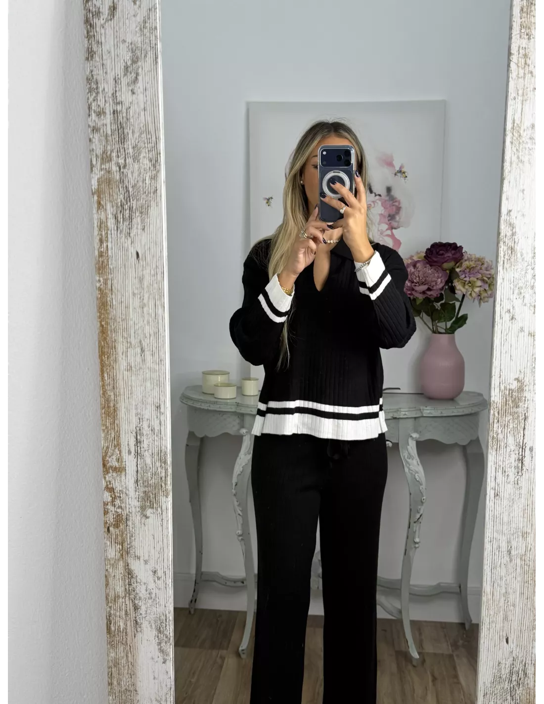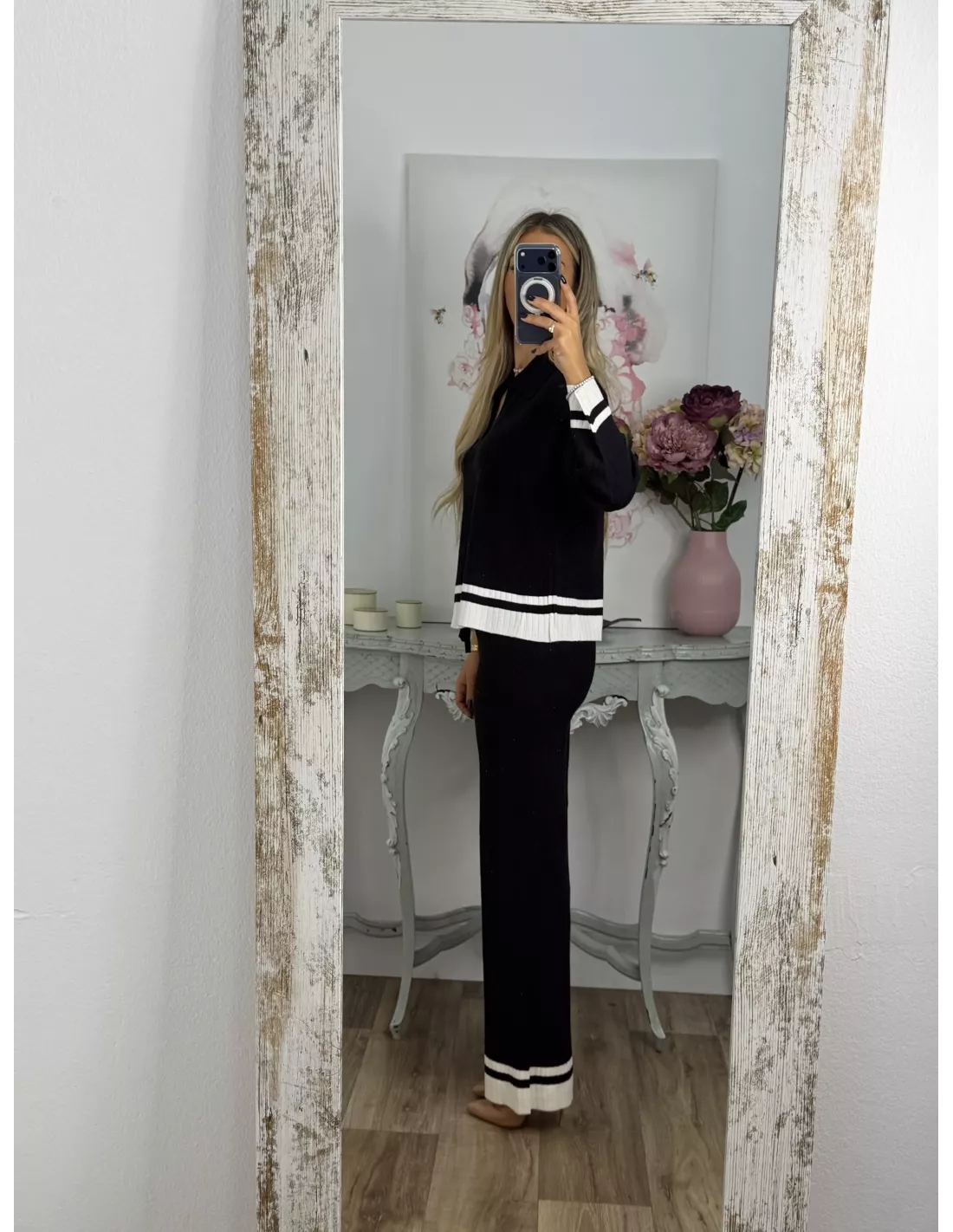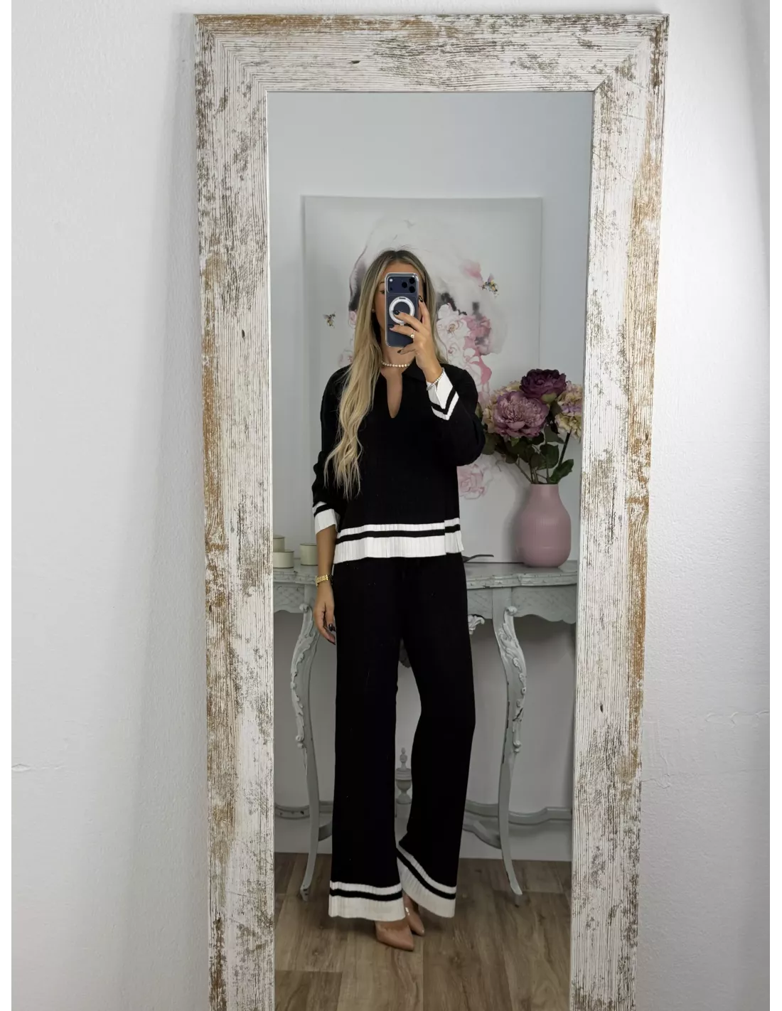 Conjunto de jersey pantalón. El jersey es tipo polo y la parte de abajo lleva una franja en otro color. El pantalón es de corte recto con goma en la cintura, no tiene bolsillos, no se transparenta, el tejido es de punto muy suave.