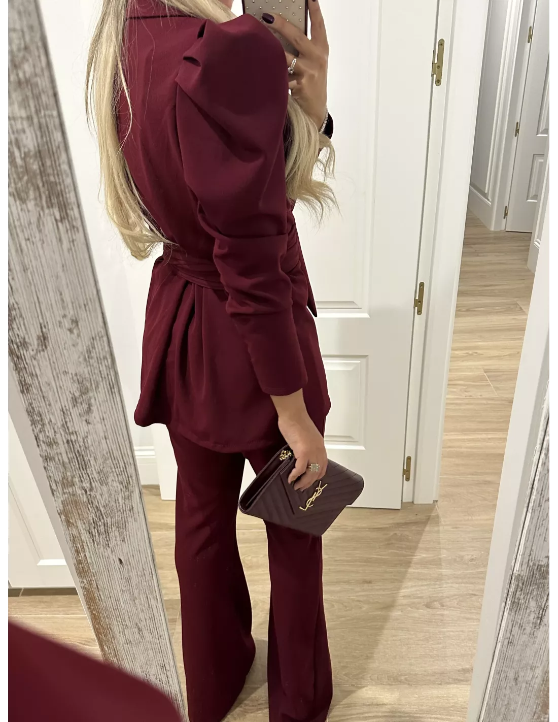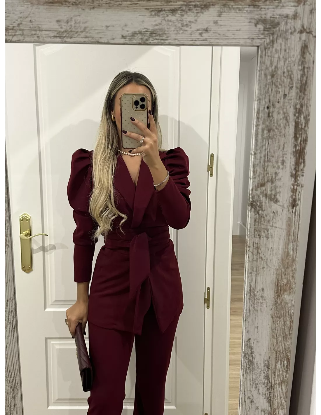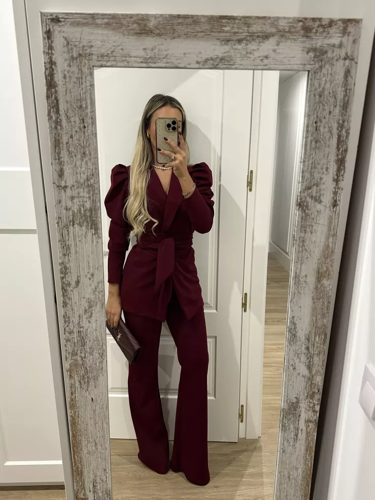 Conjunto de traje de chaqueta y pantalón de campana. La chaqueta no va forrada y no lleva botones, tiene hombreras muy pronunciada. El pantalón es de corte acampanado con goma en la cintura, no tiene bolsillos, no se transparenta ni marca nada.el tejido es punto y no se arruga y es muy cómodo.