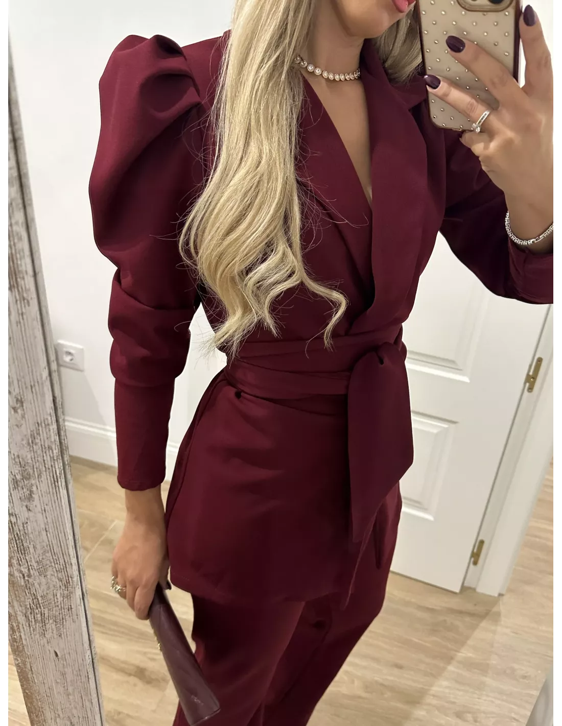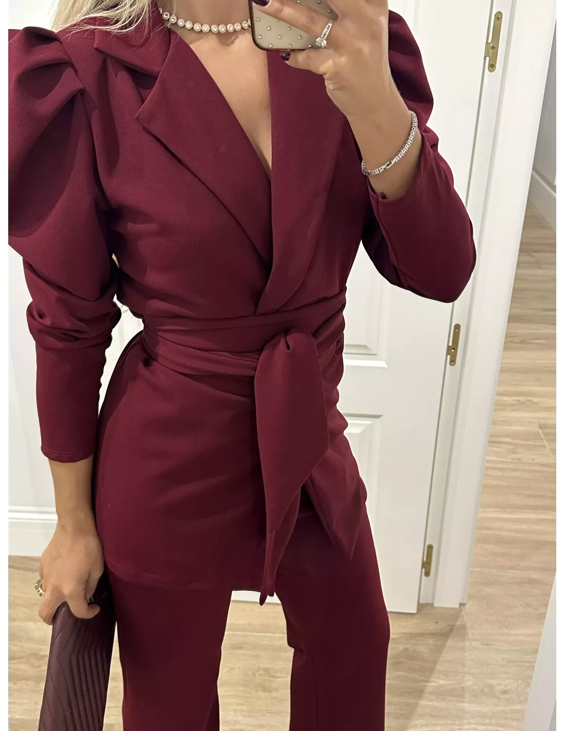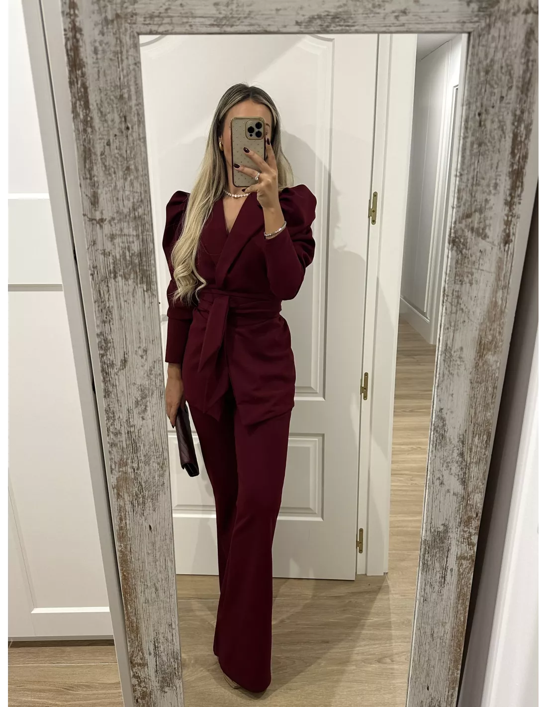 Conjunto de traje de chaqueta y pantalón de campana. La chaqueta no va forrada y no lleva botones, tiene hombreras muy pronunciada. El pantalón es de corte acampanado con goma en la cintura, no tiene bolsillos, no se transparenta ni marca nada.el tejido es punto y no se arruga y es muy cómodo.