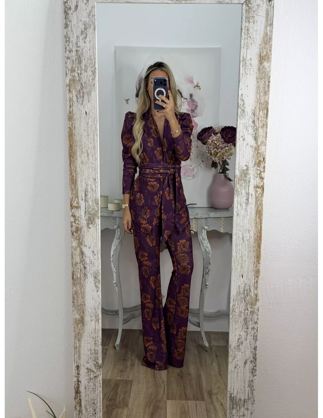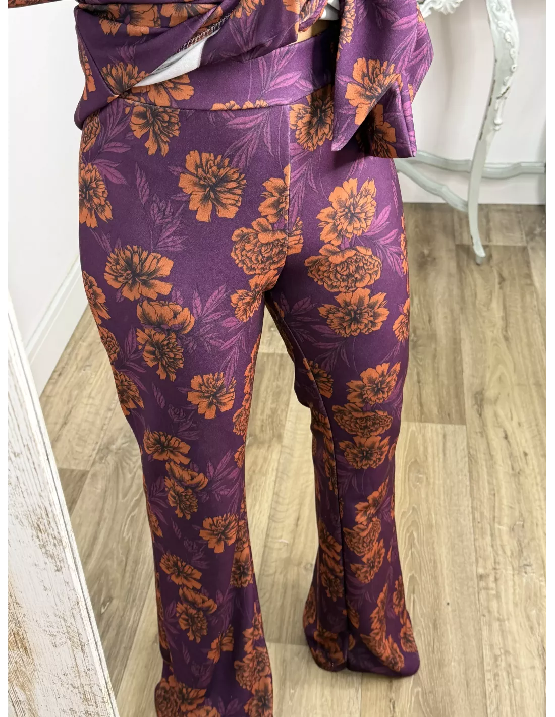 Conjunto de traje de chaqueta y pantalón de campana. La chaqueta no va forrada y no lleva botones, tiene hombreras muy pronunciada. El pantalón es de corte acampanado con goma en la cintura, no tiene bolsillos, no se transparenta ni marca nada.el tejido es punto y no se arruga y es muy cómodo.