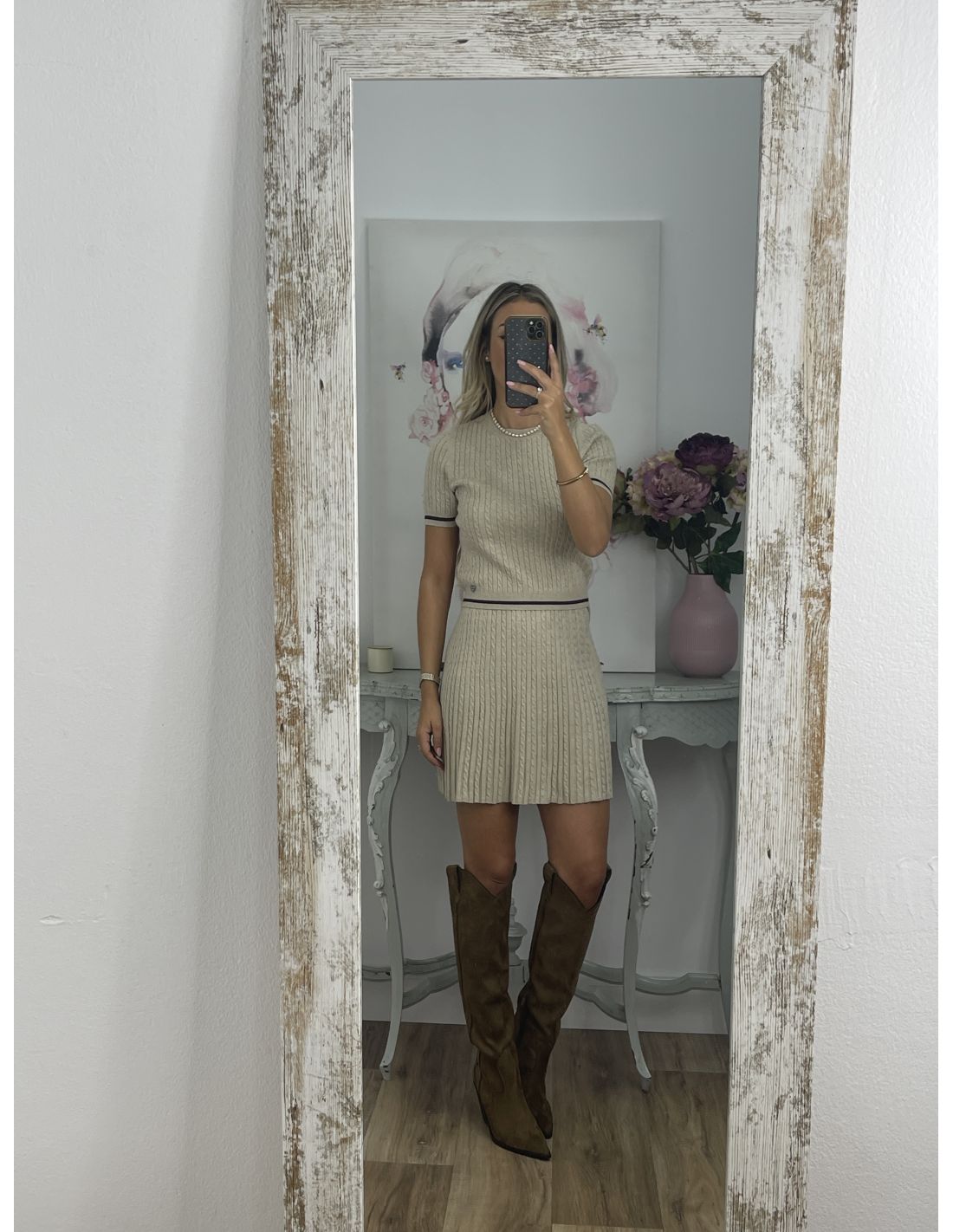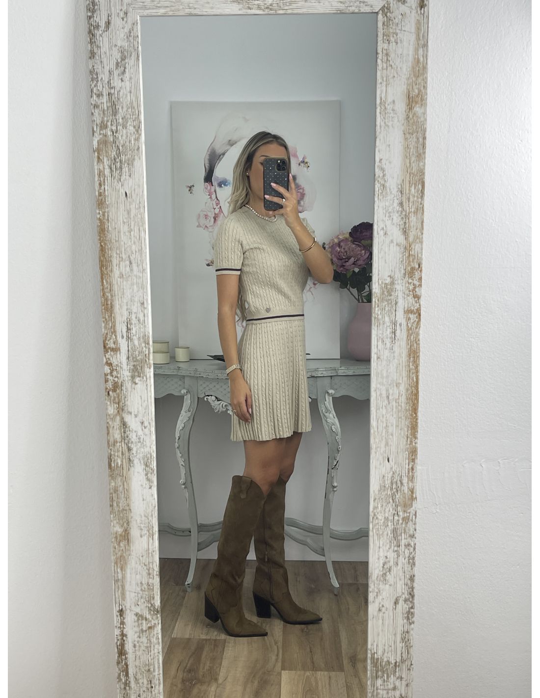 Conjunto de jersey y falda de punto trenzado. El jersey es de cuello a la caja y manga corta. La falda lleva goma en la cintura.