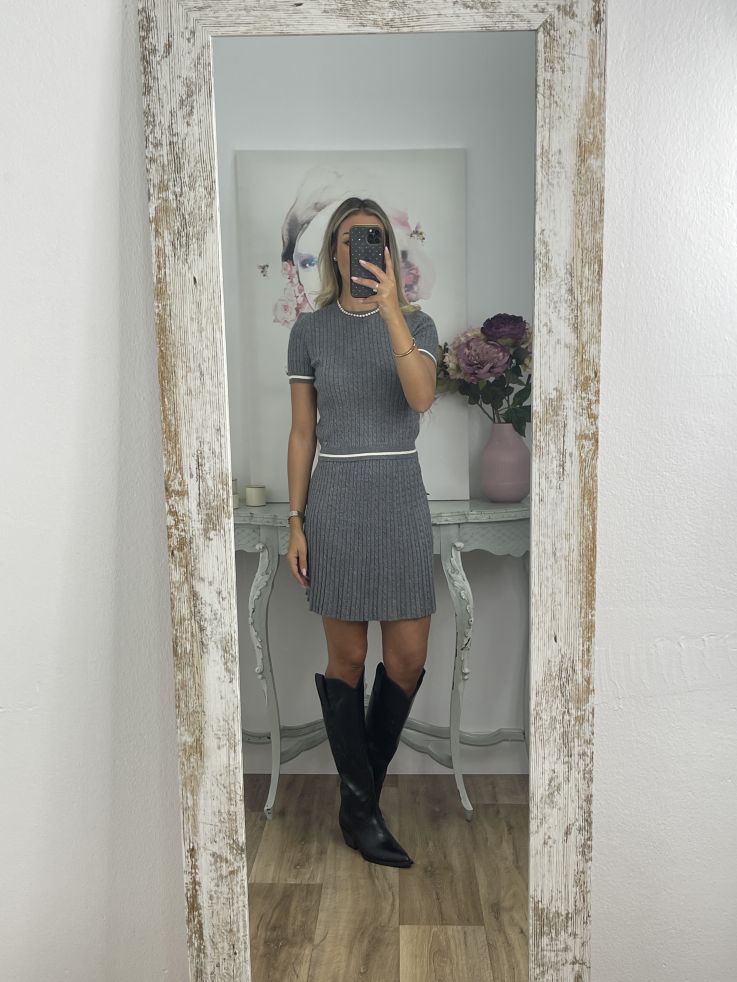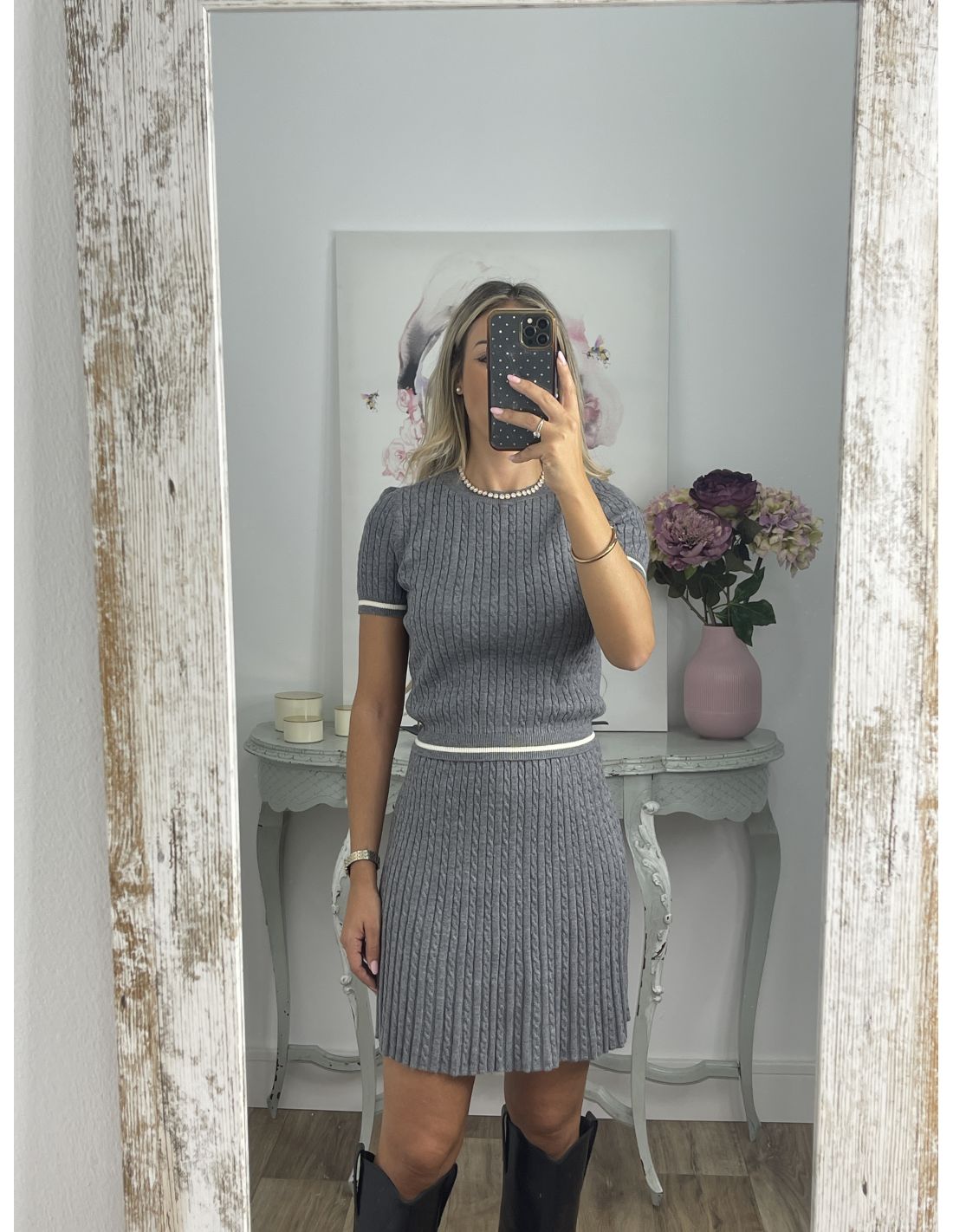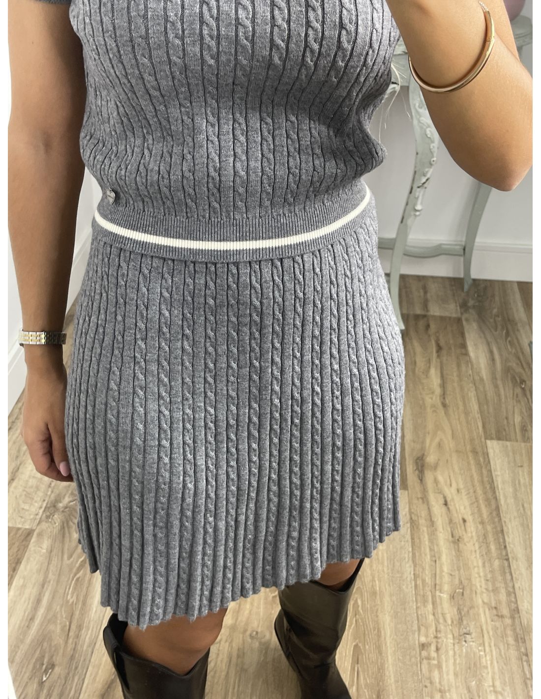 Conjunto de jersey y falda de punto trenzado. El jersey es de cuello a la caja y manga corta. La falda lleva goma en la cintura.