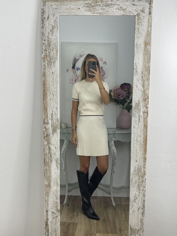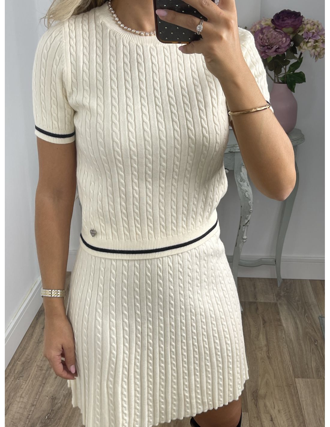 Conjunto de jersey y falda de punto trenzado. El jersey es de cuello a la caja y manga corta. La falda lleva goma en la cintura.