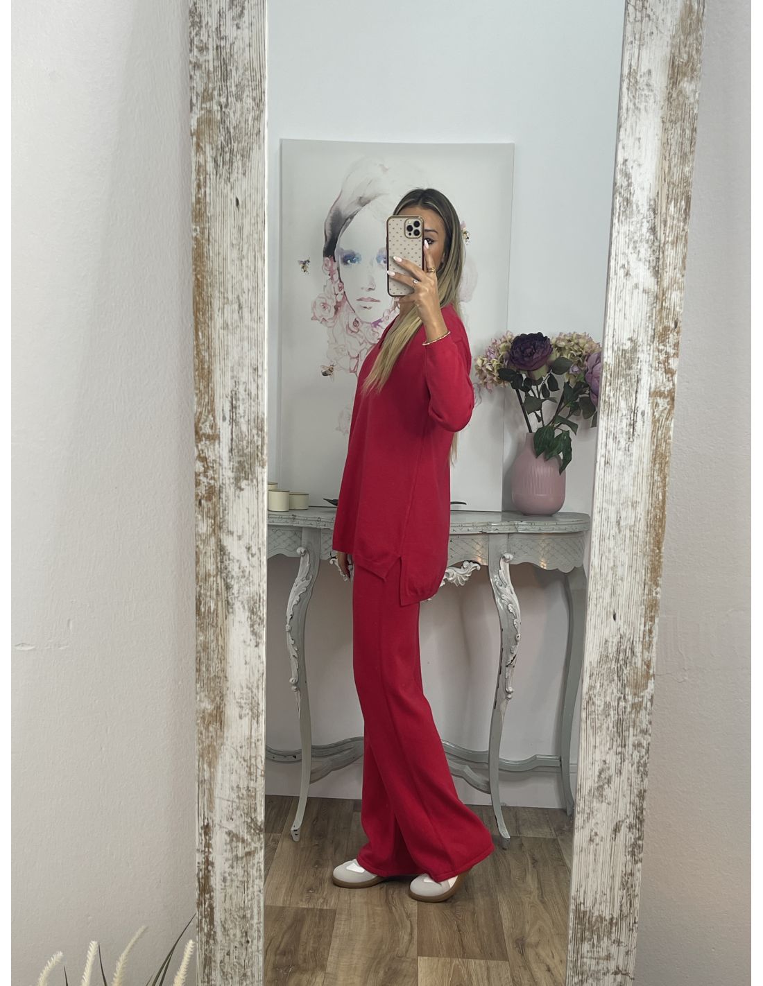Conjunto de jersey y pantalón de punto. El jersey es de corte flojito. El pantalón lleva goma en la cintura y es de corte recto.