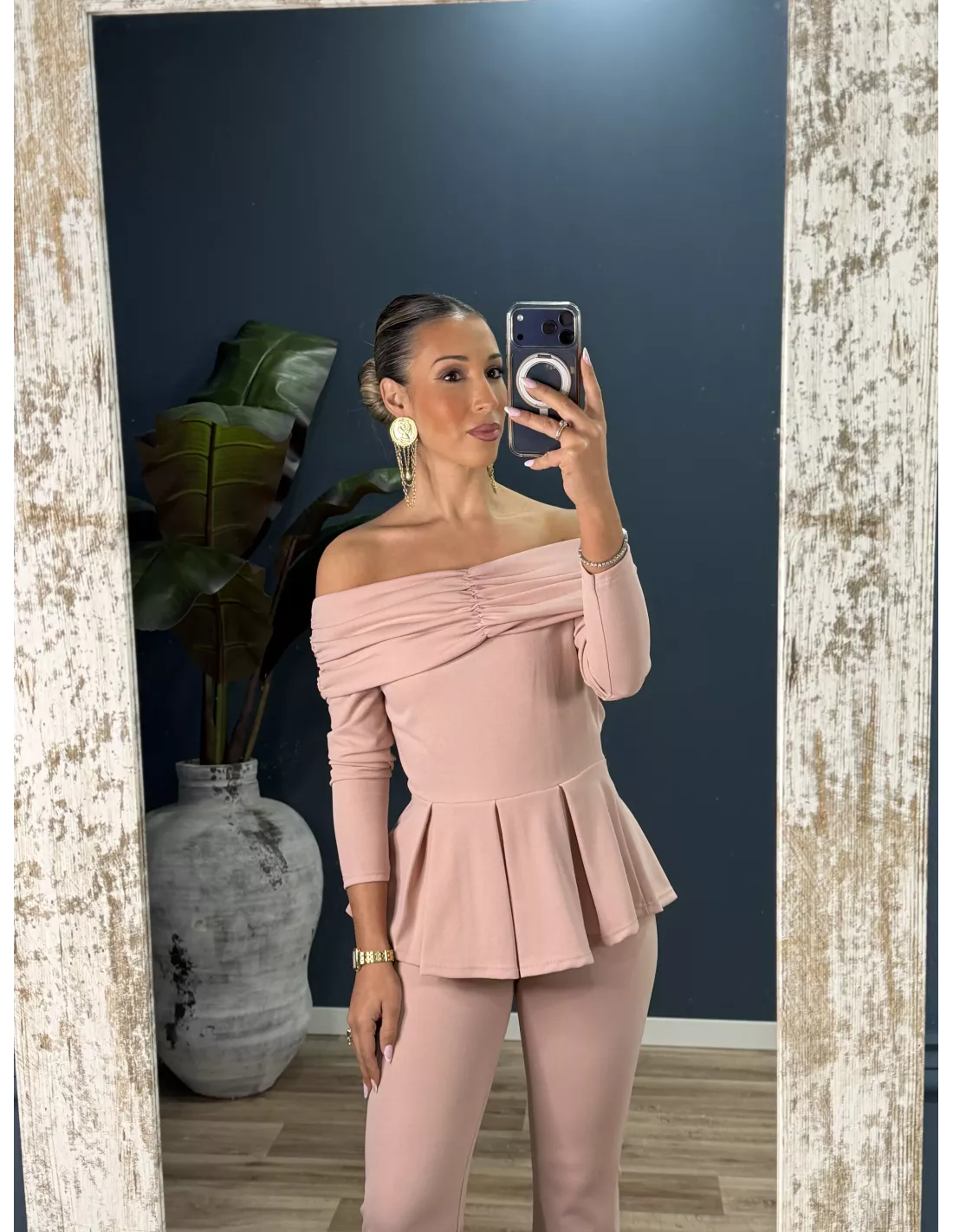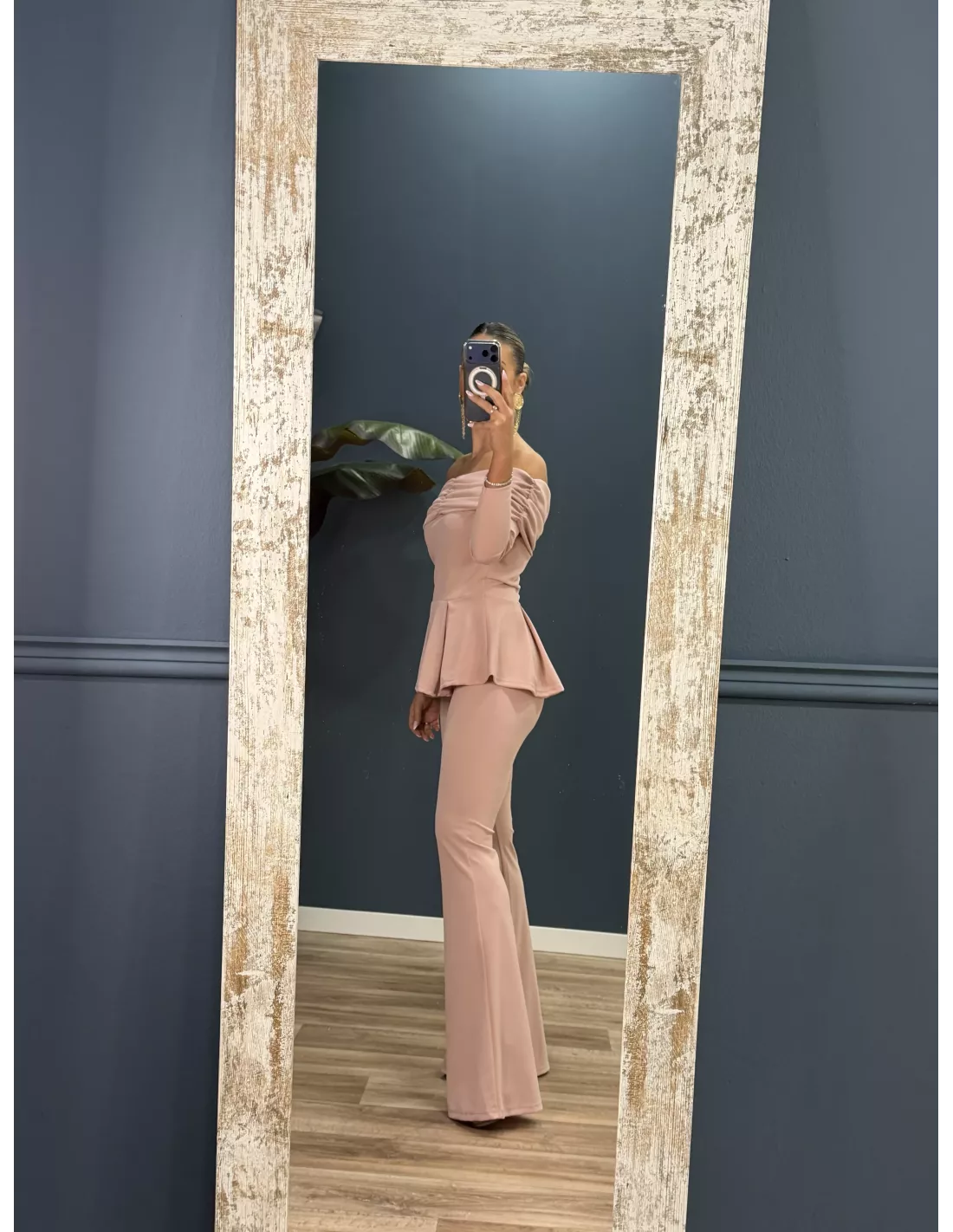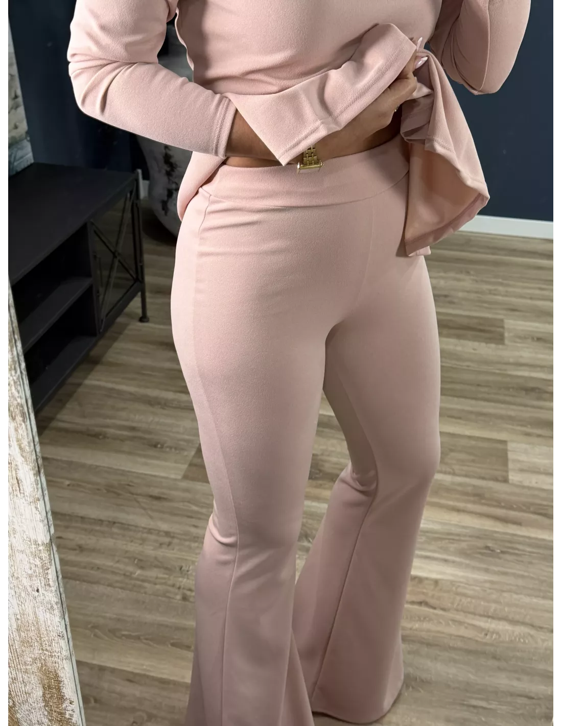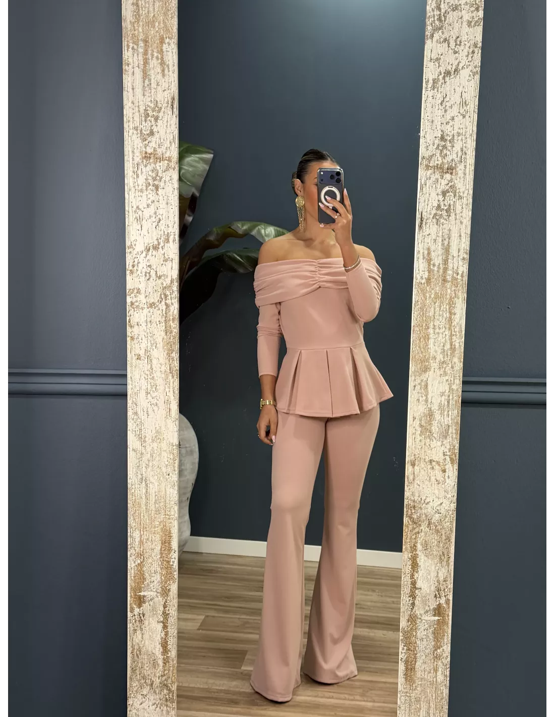Conjunto de top y pantalón de campana. El top es de escote tipo barco, con corte peplum de tablas. El pantalón es de corte acampanado con goma en la cintura.