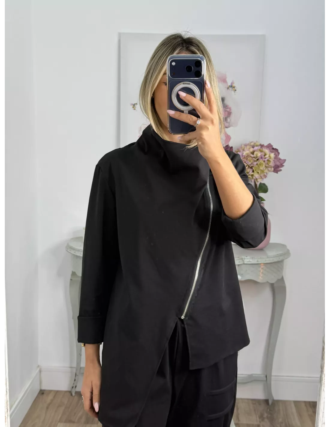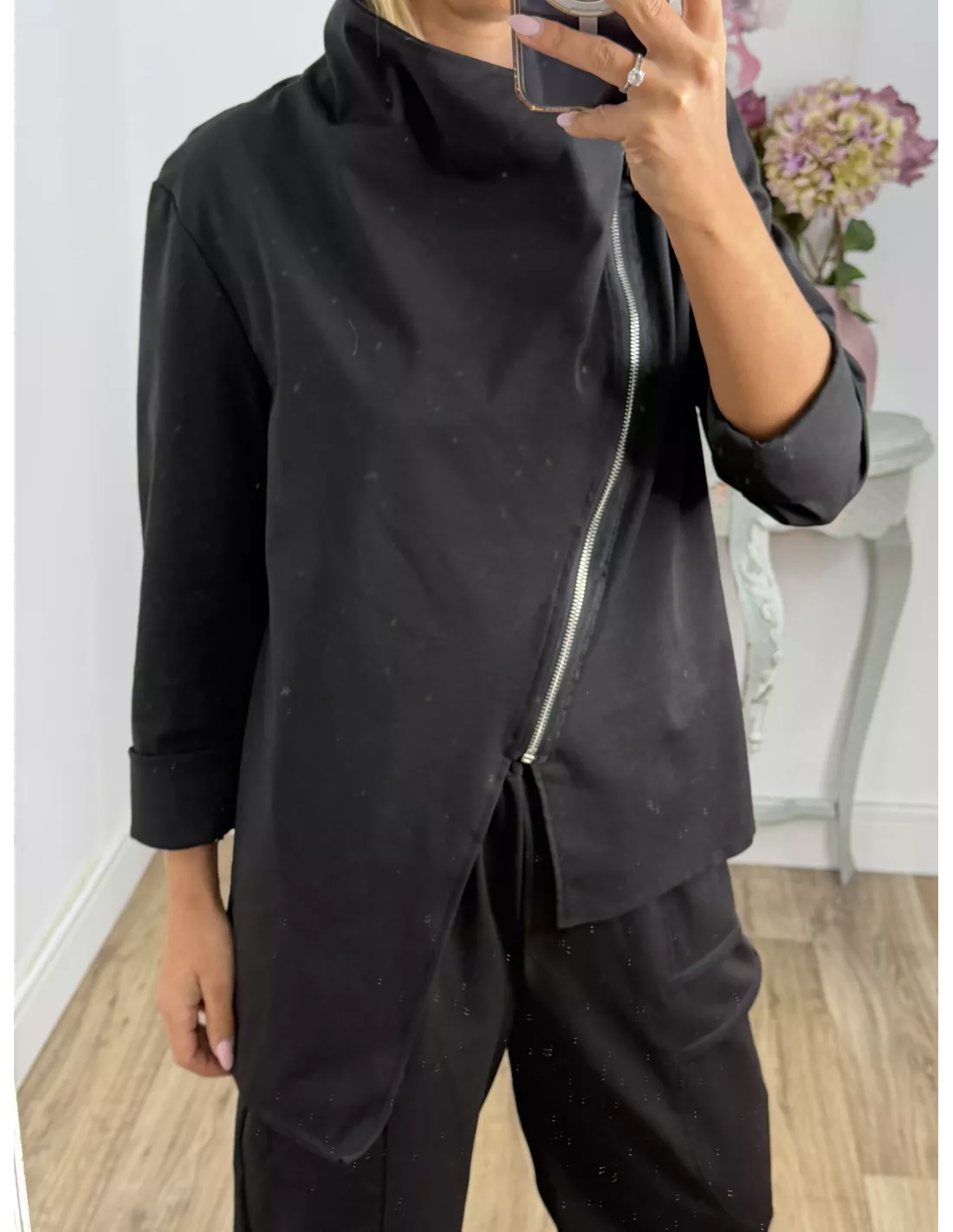 Conjunto de punto de chaqueta y pantalón. La chaqueta lleva cremallera en plateada de corte y transversal, No forrada. El pantalón lleva goma en la cintura, es tipo jogger.