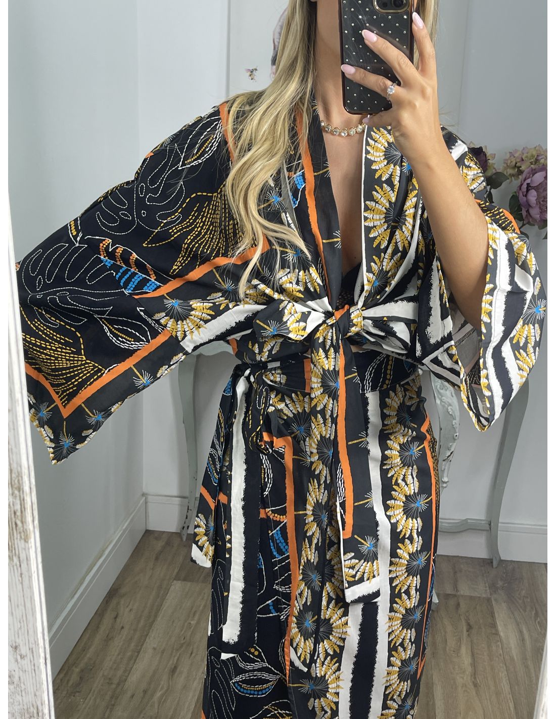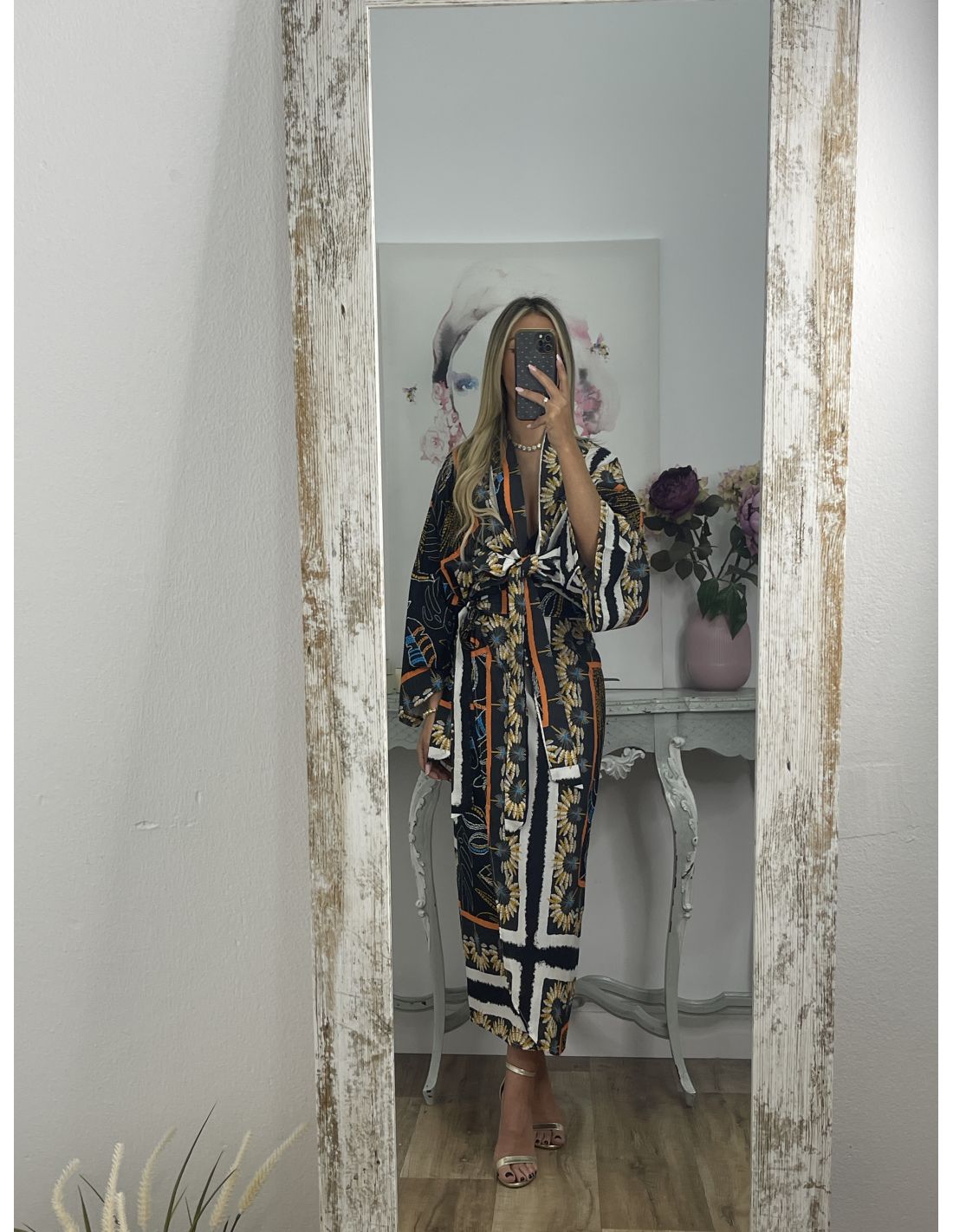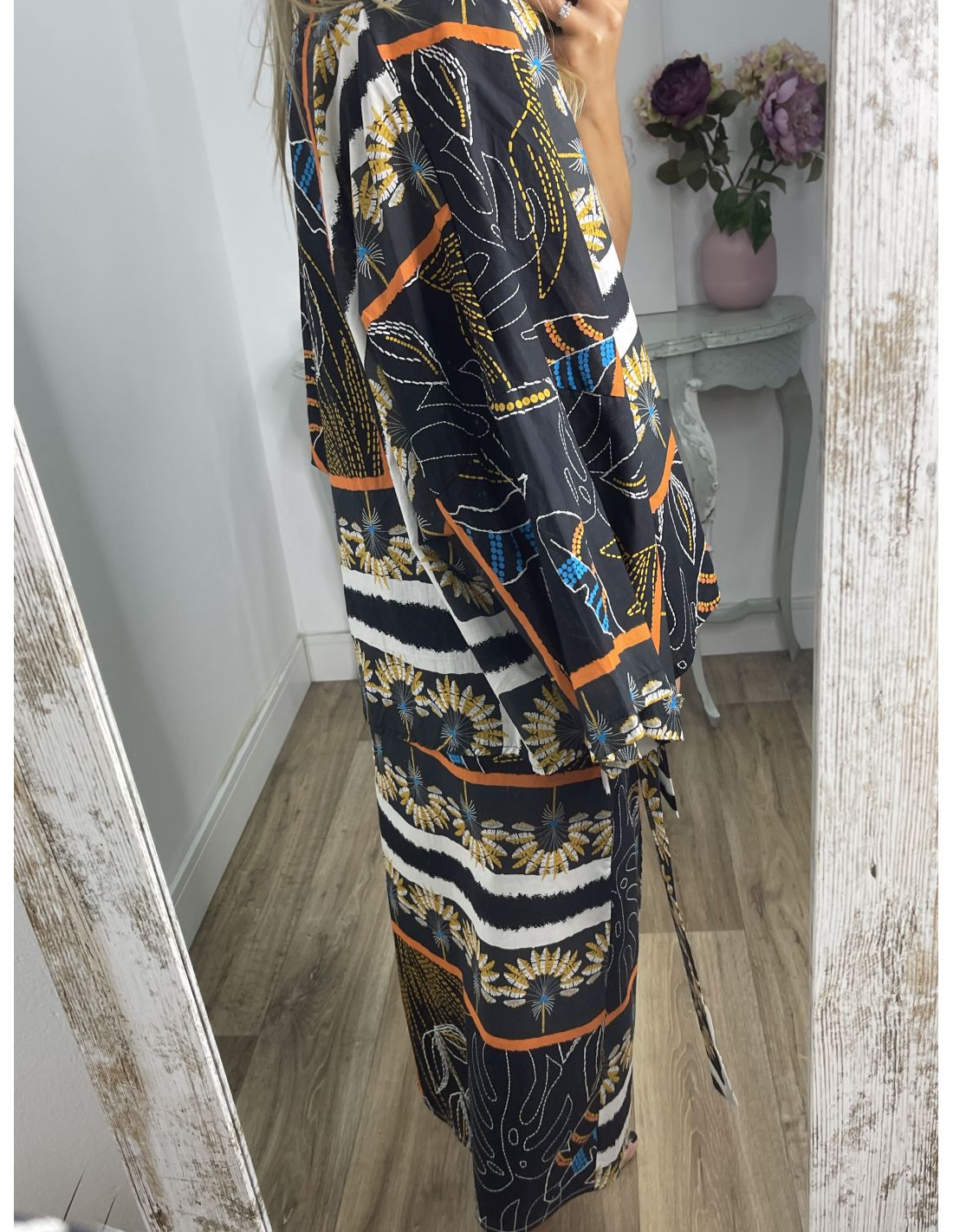Camisa tipo kimono y falda. La camisa tiene manga kimono y se puede anudar en la parte delantera o en la parte de atrás. La falda es tipo pareo.