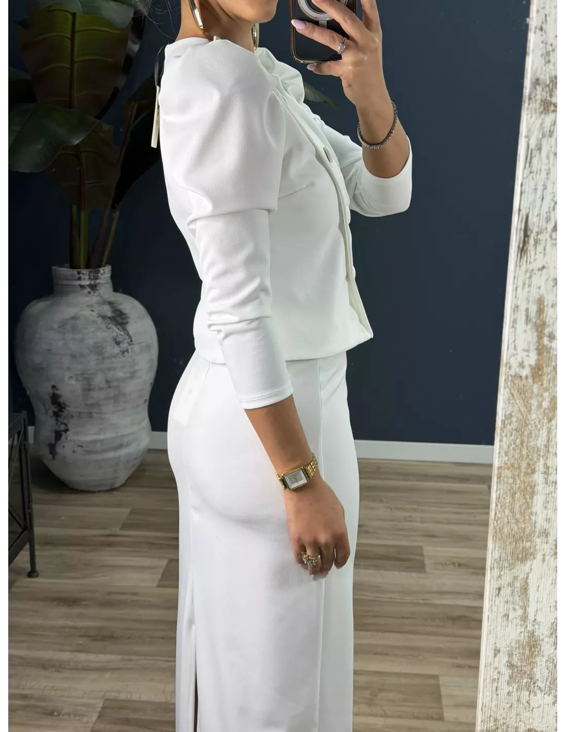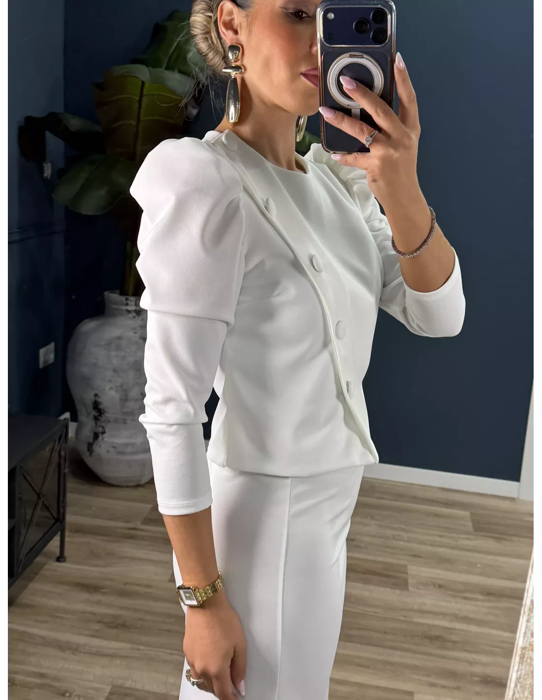 Conjunto de traje de chaqueta y falda. La chaqueta es de corte cruzado, lleva hombreras, con manga farol. La falda lleva goma en la cintura, de corte recto, no va forrada. El tejido es punto y no se arruga y es muy cómodo.