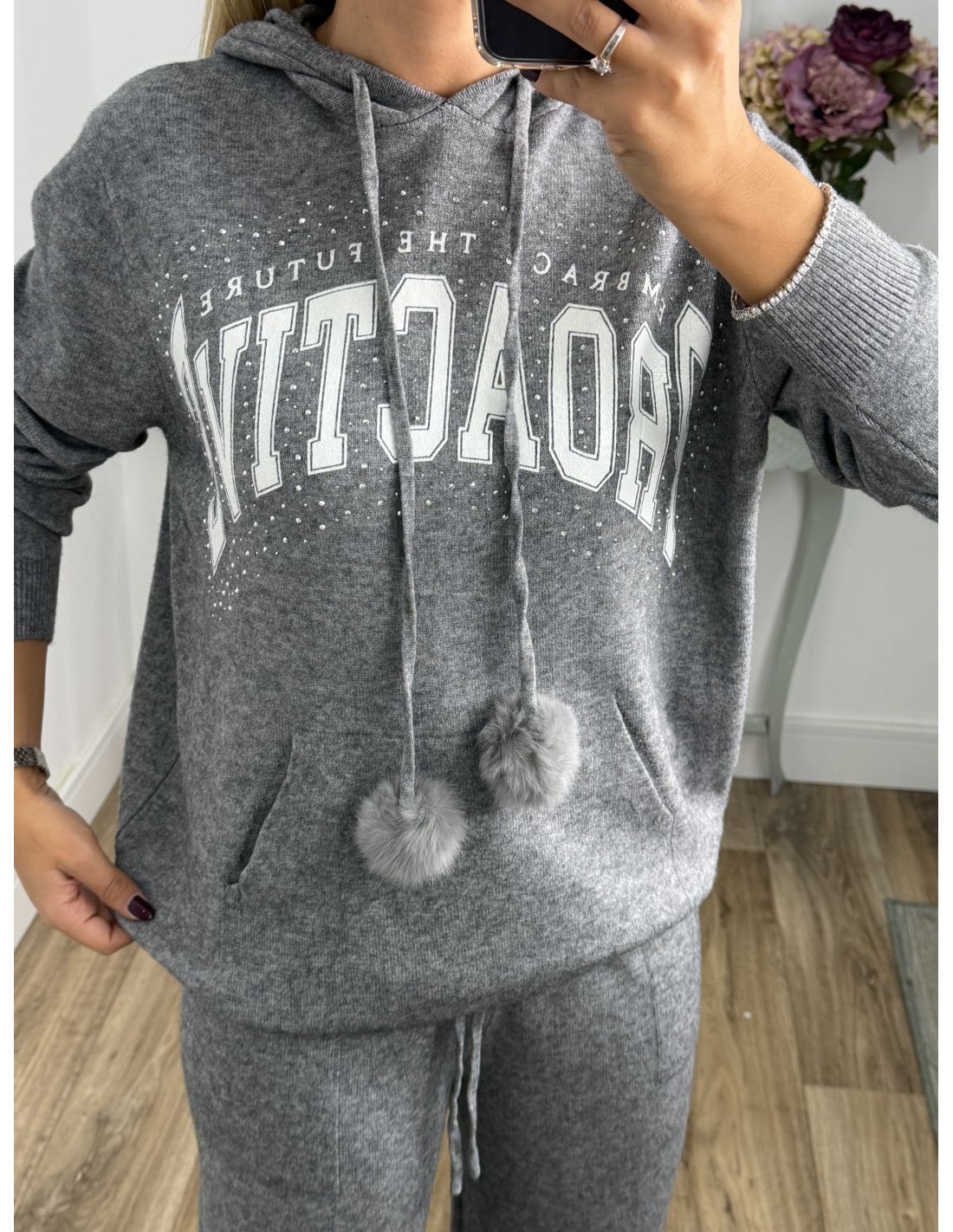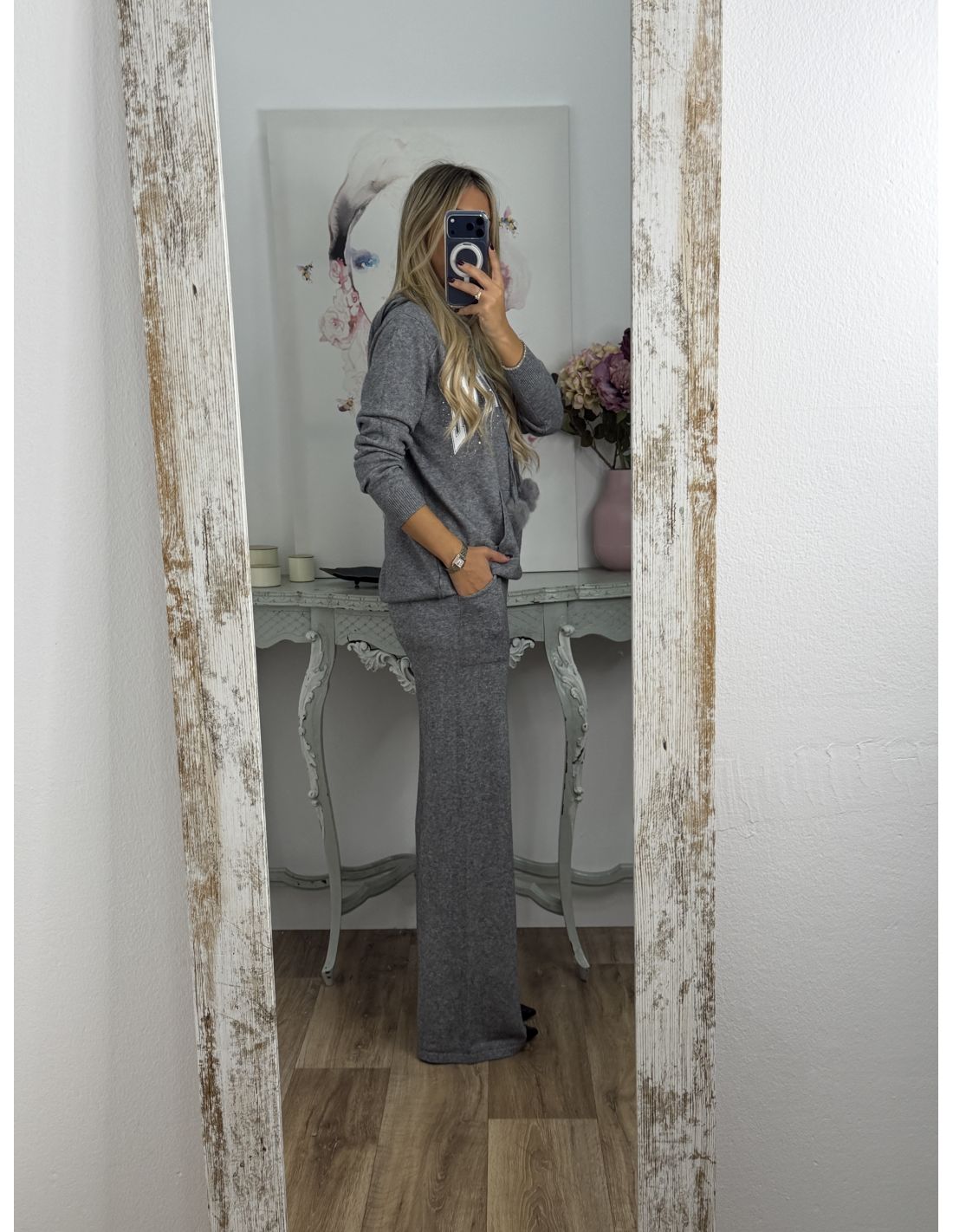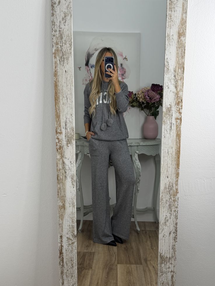 Conjunto de jersey y pantalón. Jersey con capucha lleva un brillo por la parte delantera. El pantalón es de corte recto con goma en la cintura, no tiene bolsillos, no se transparenta, el tejido es punto y no se arruga y es muy cómodo.