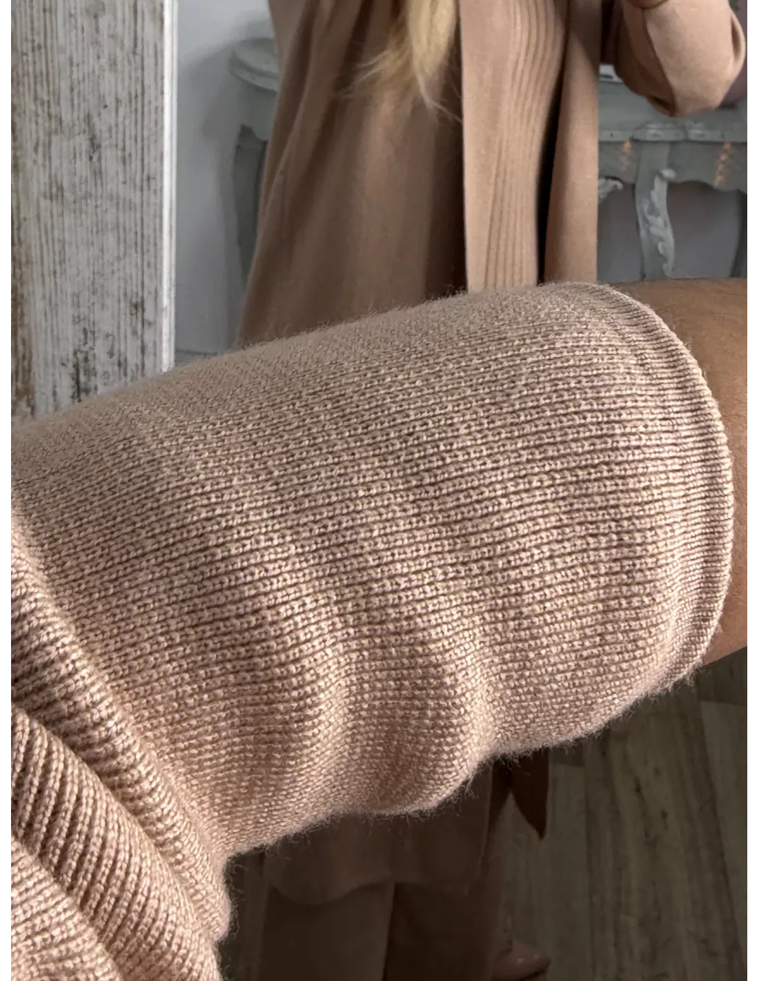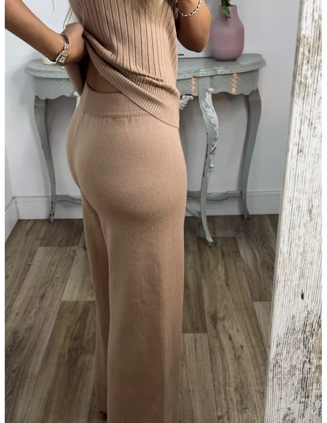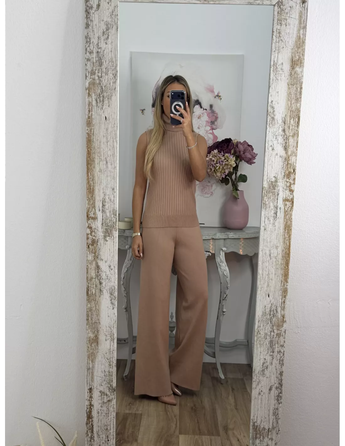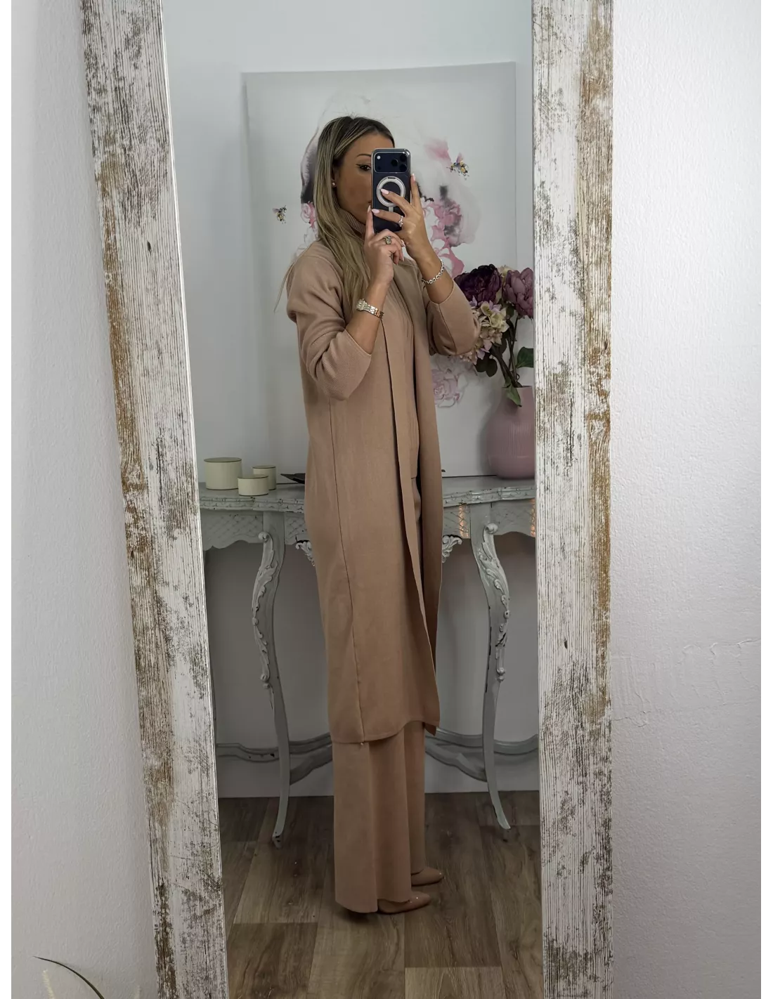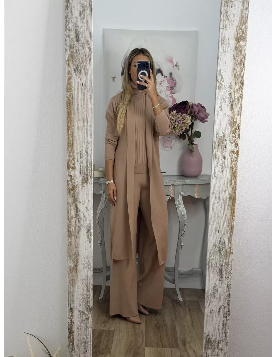 Conjunto, tres piezas de cárdigan, jersey y pantalón. El cárdigan, el Cortes a la caída y recto. El jersey es de cuello alto y de sisa. El pantalón de corte recto con goma en la cintura. El tejido es de punto muy gustoso.