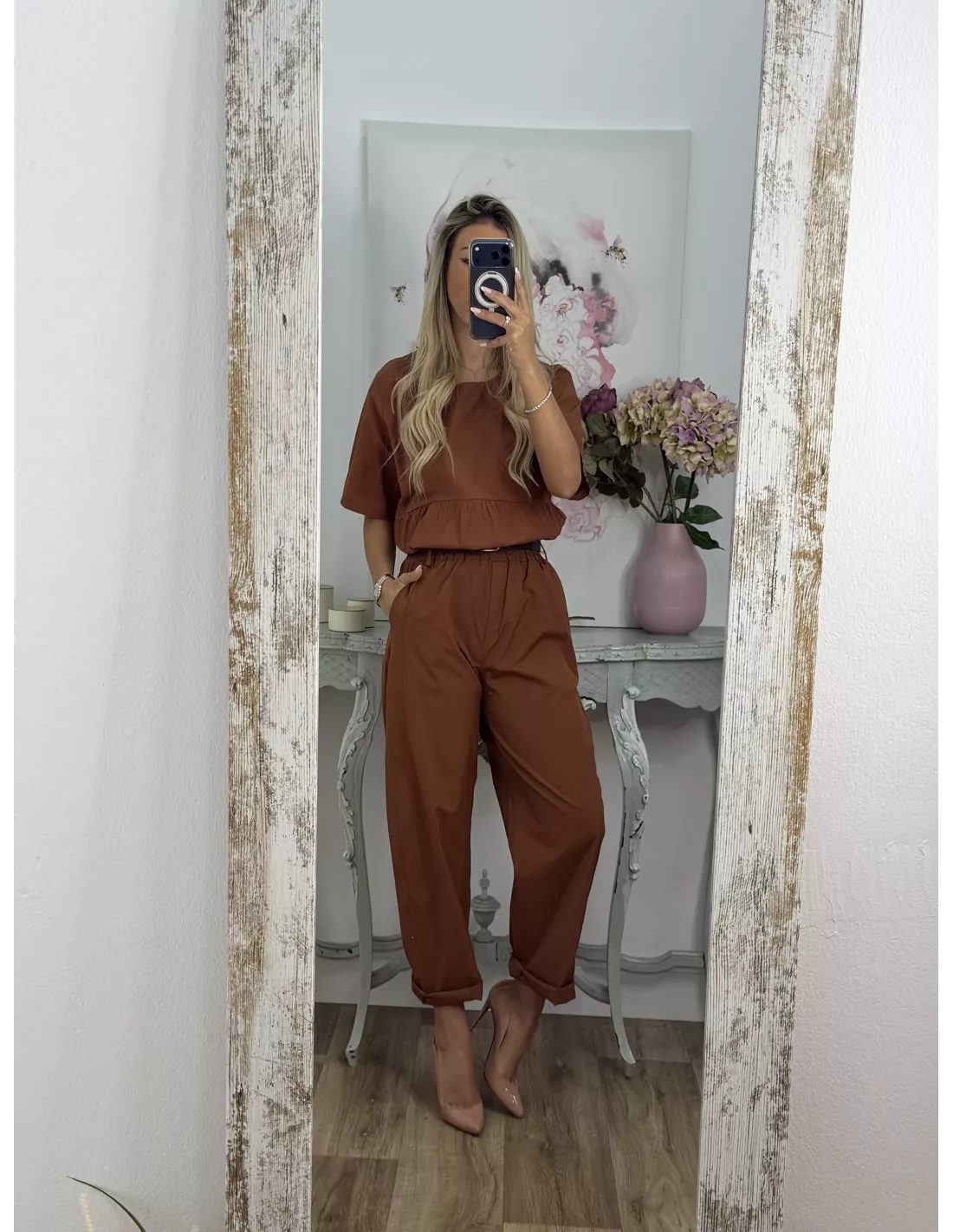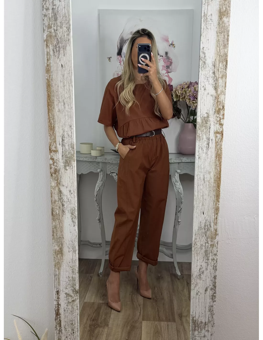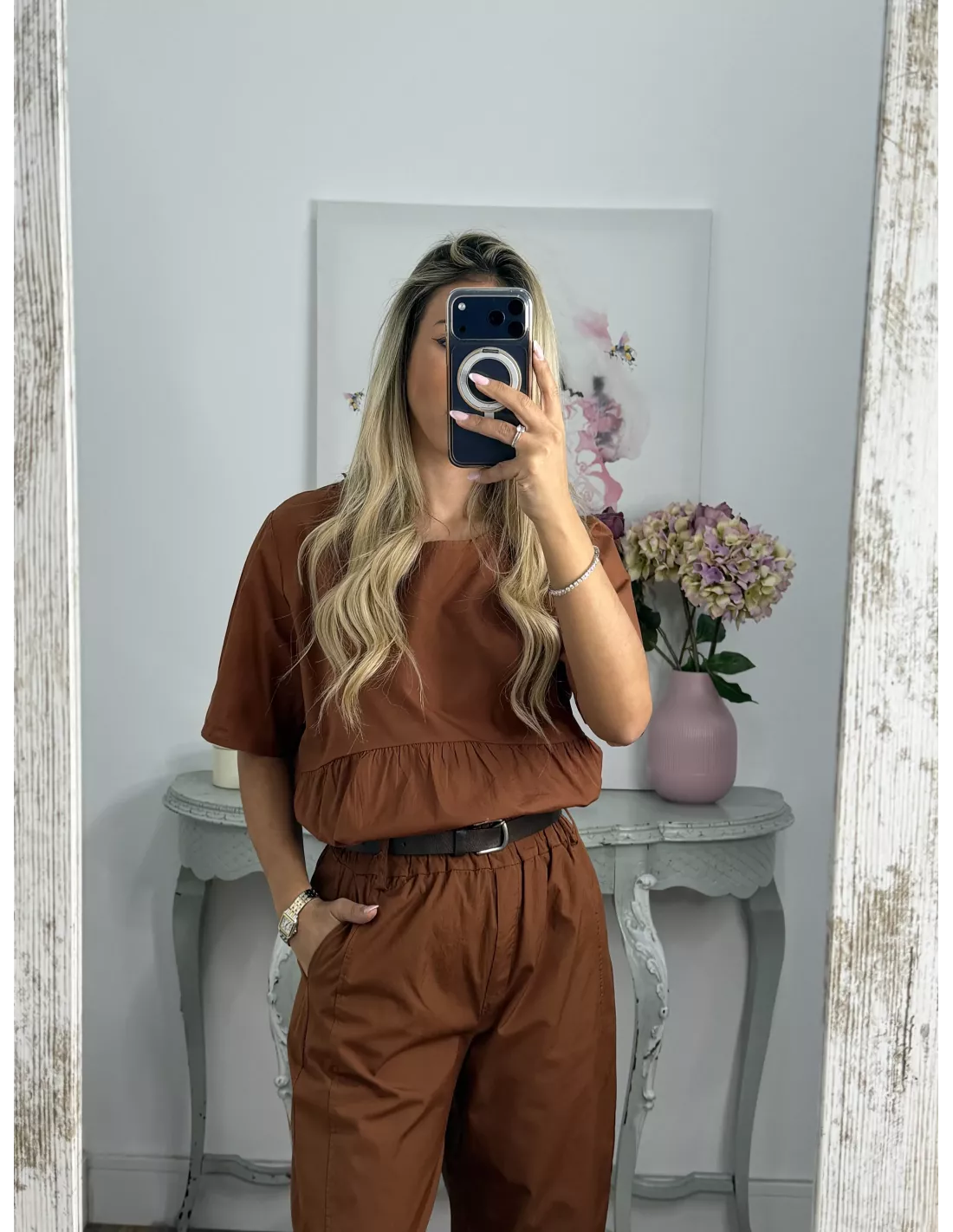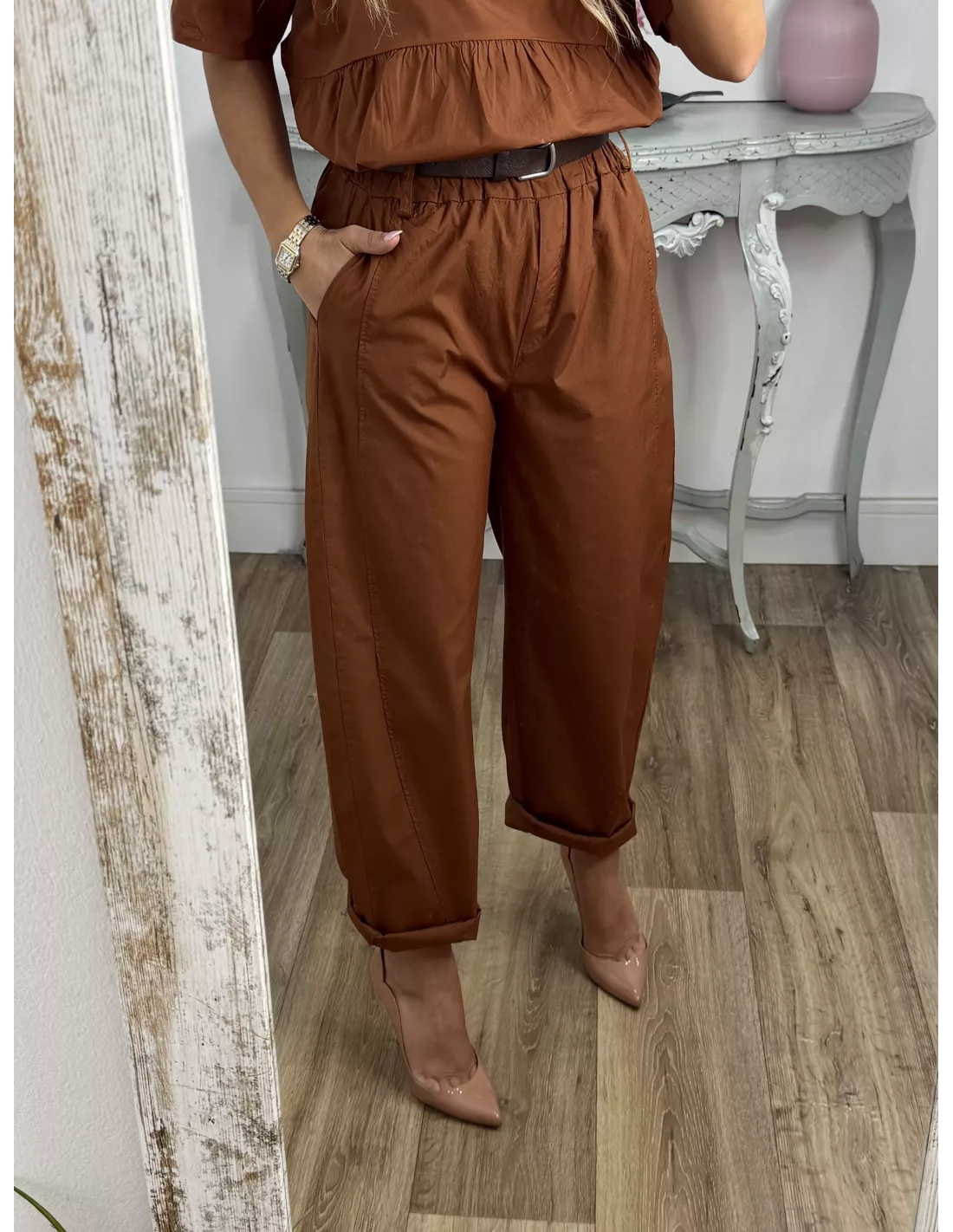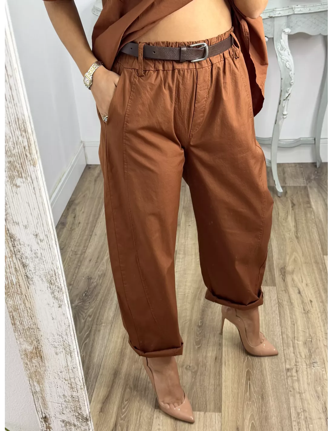 Conjunto de blusa y pantalón. Blusa de cuello a la caja de corte suelto. Pantalón de corte bombacho que incluye el cinturón en marrón.