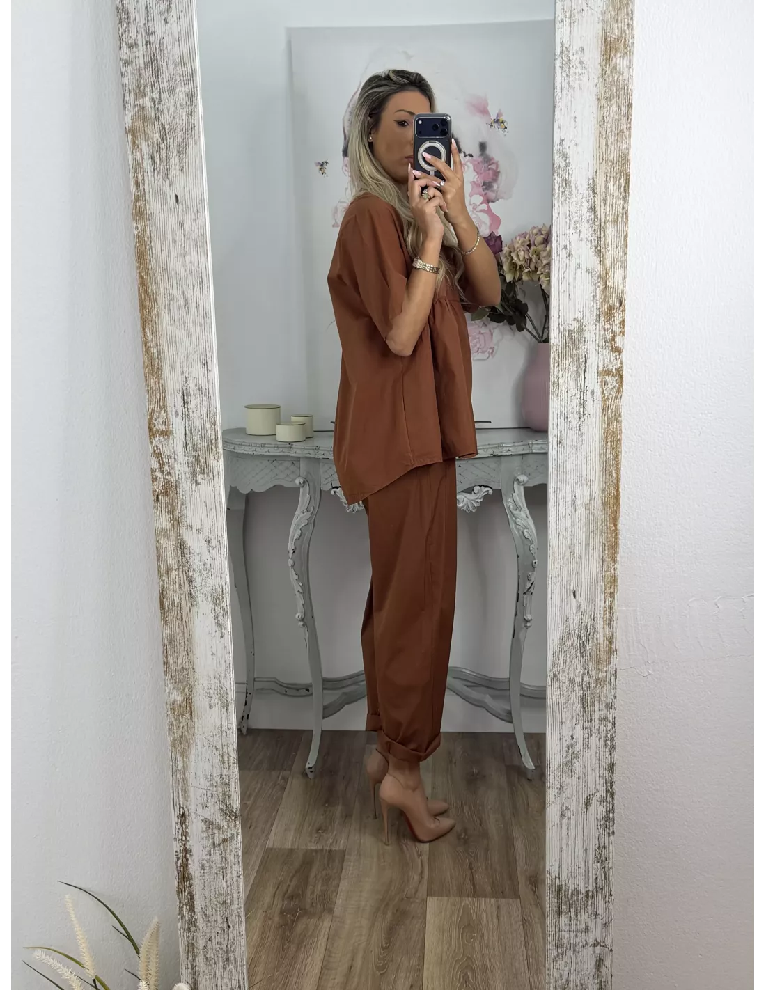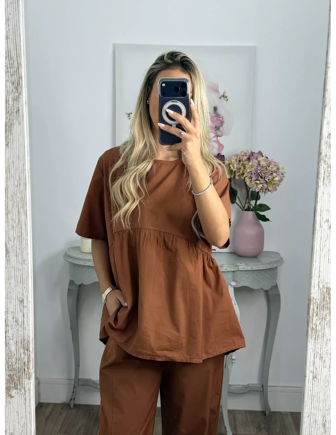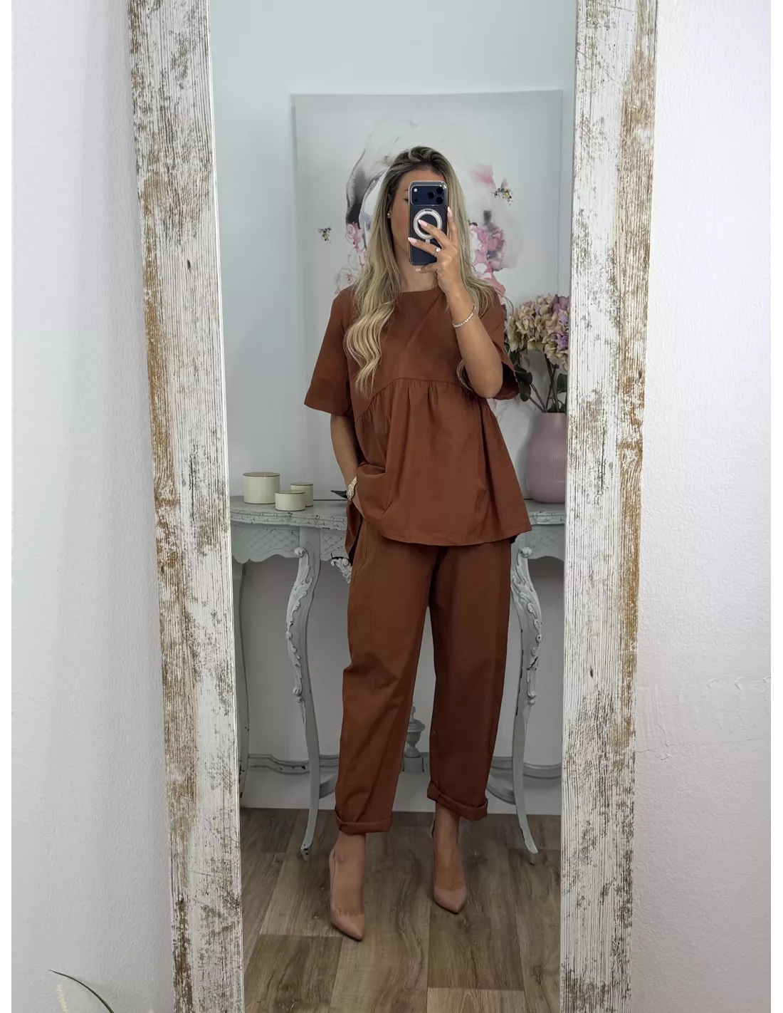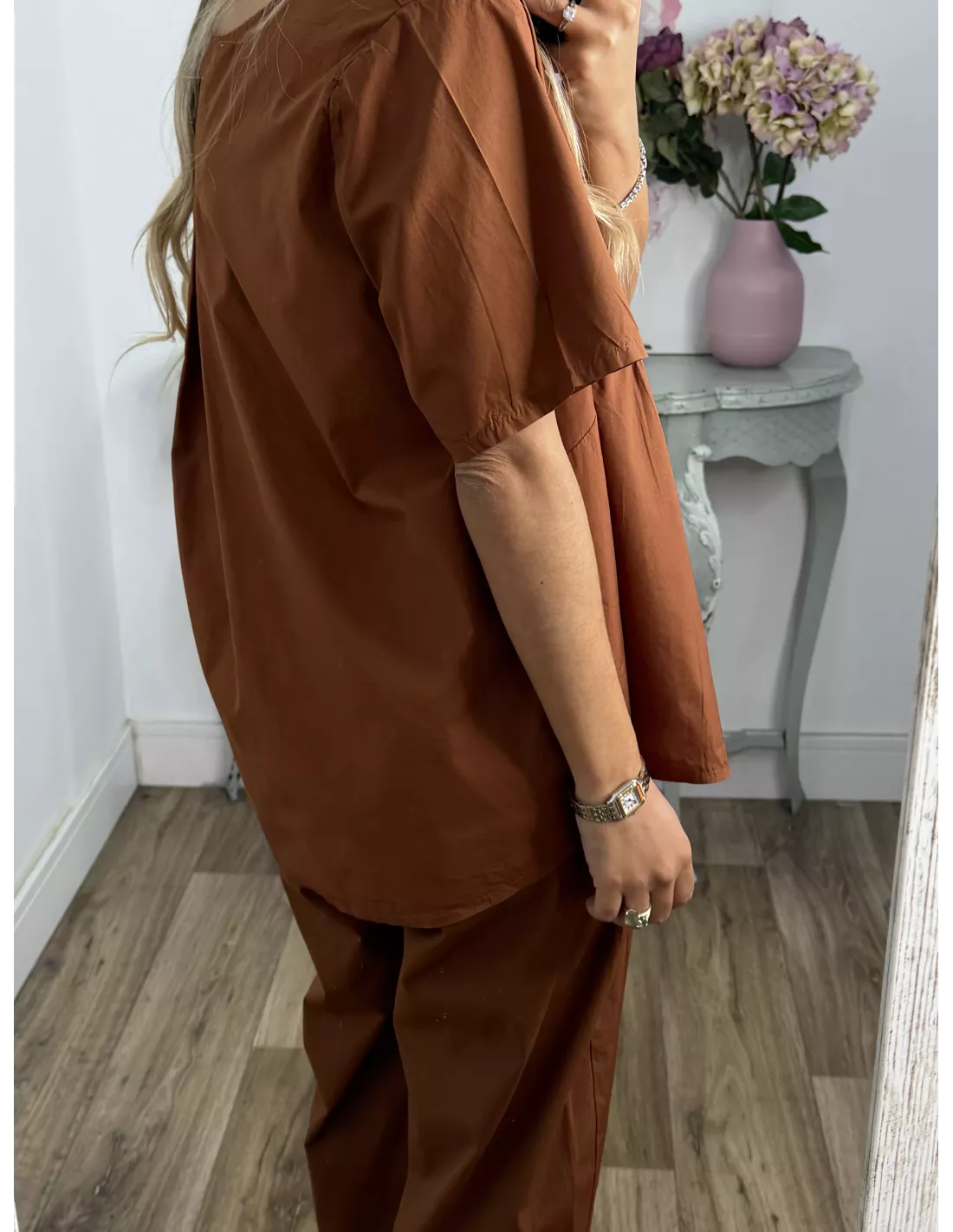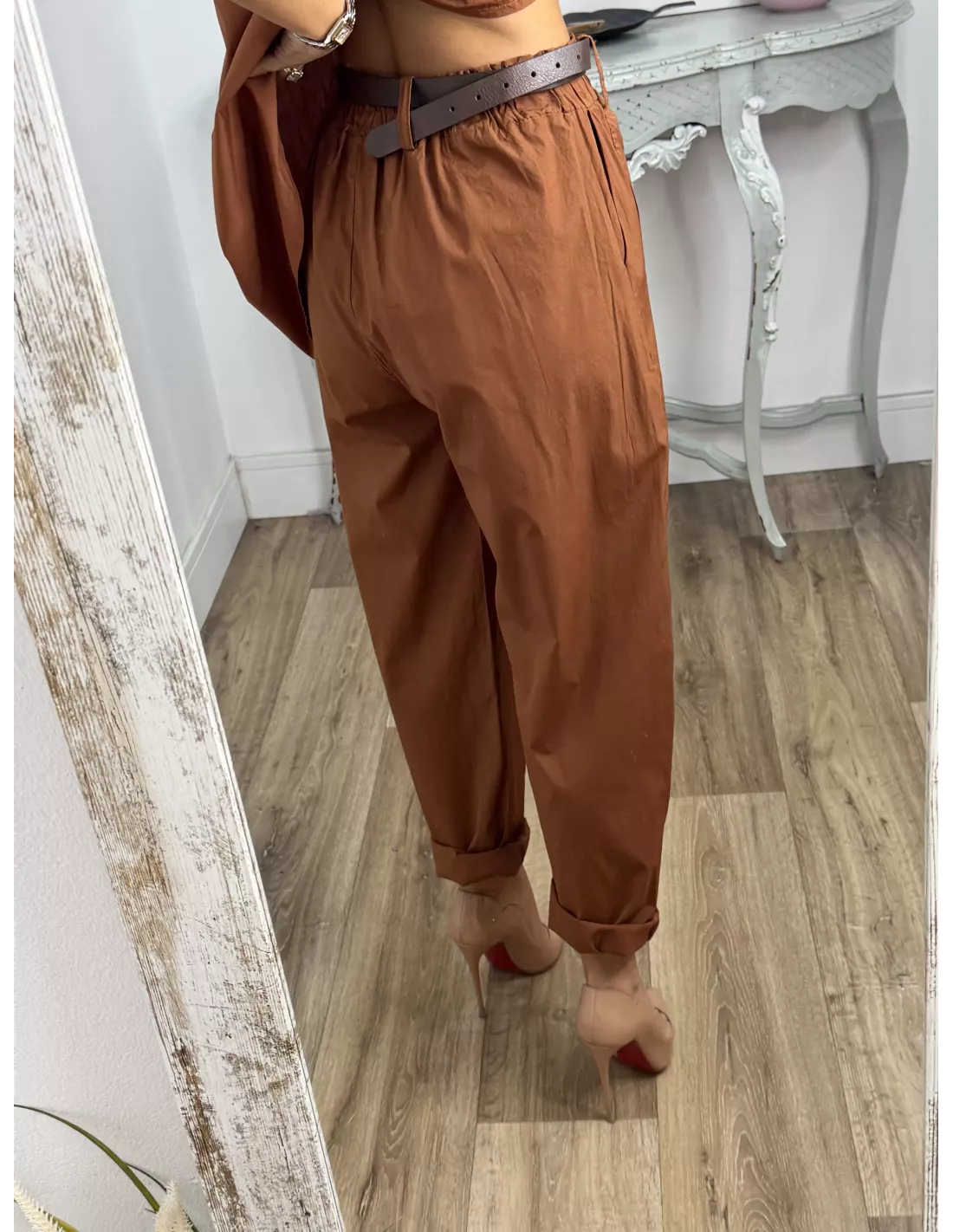 Conjunto de blusa y pantalón. Blusa de cuello a la caja de corte suelto. Pantalón de corte bombacho que incluye el cinturón en marrón.