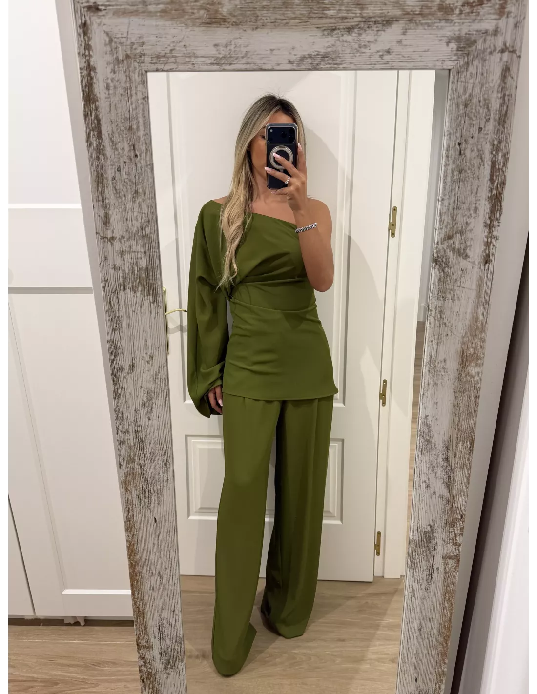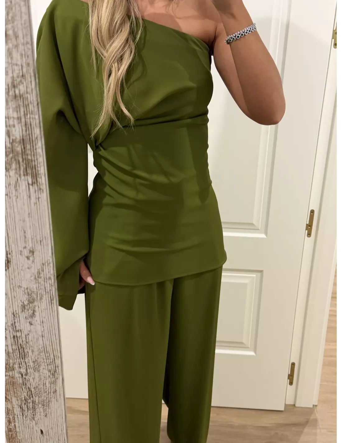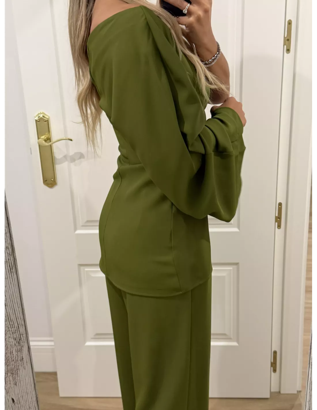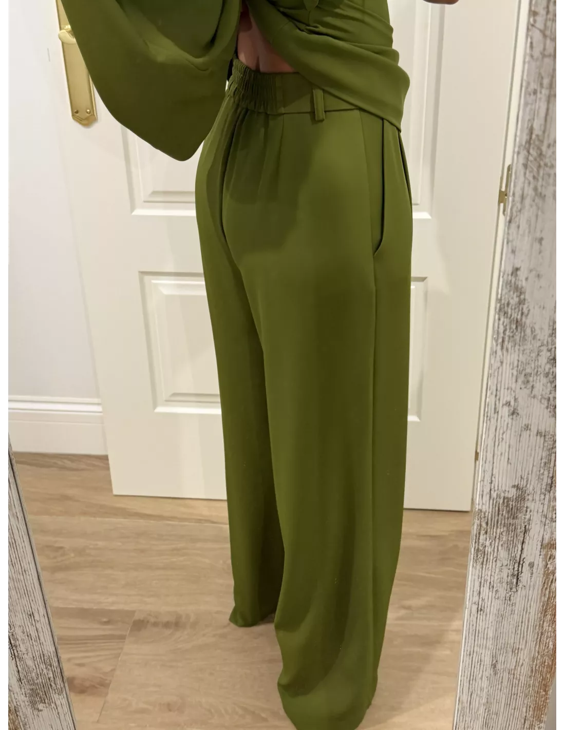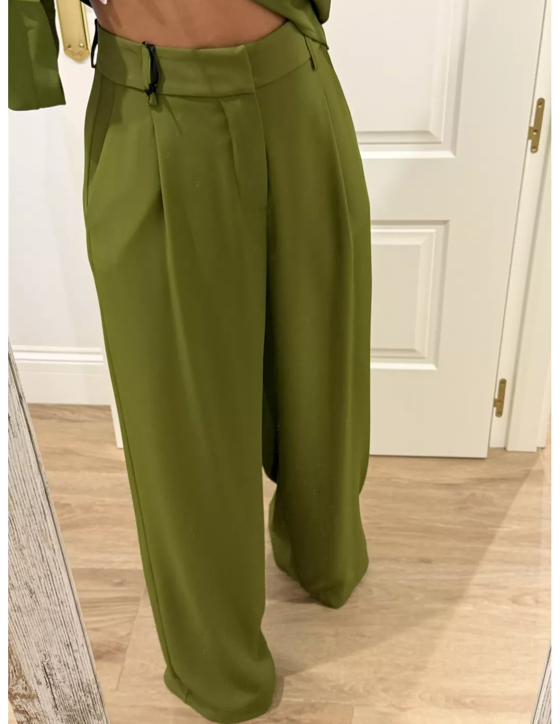 Conjunto de blusa y pantalón. El tejido tiene mucha caída. La blusa es de corta simétrico se cierra con cremallera invisible. En la costura lateral tiene manga acampanada y en la zona de la cintura tiene pliegues. El pantalón es de corte masculino con pinzas.