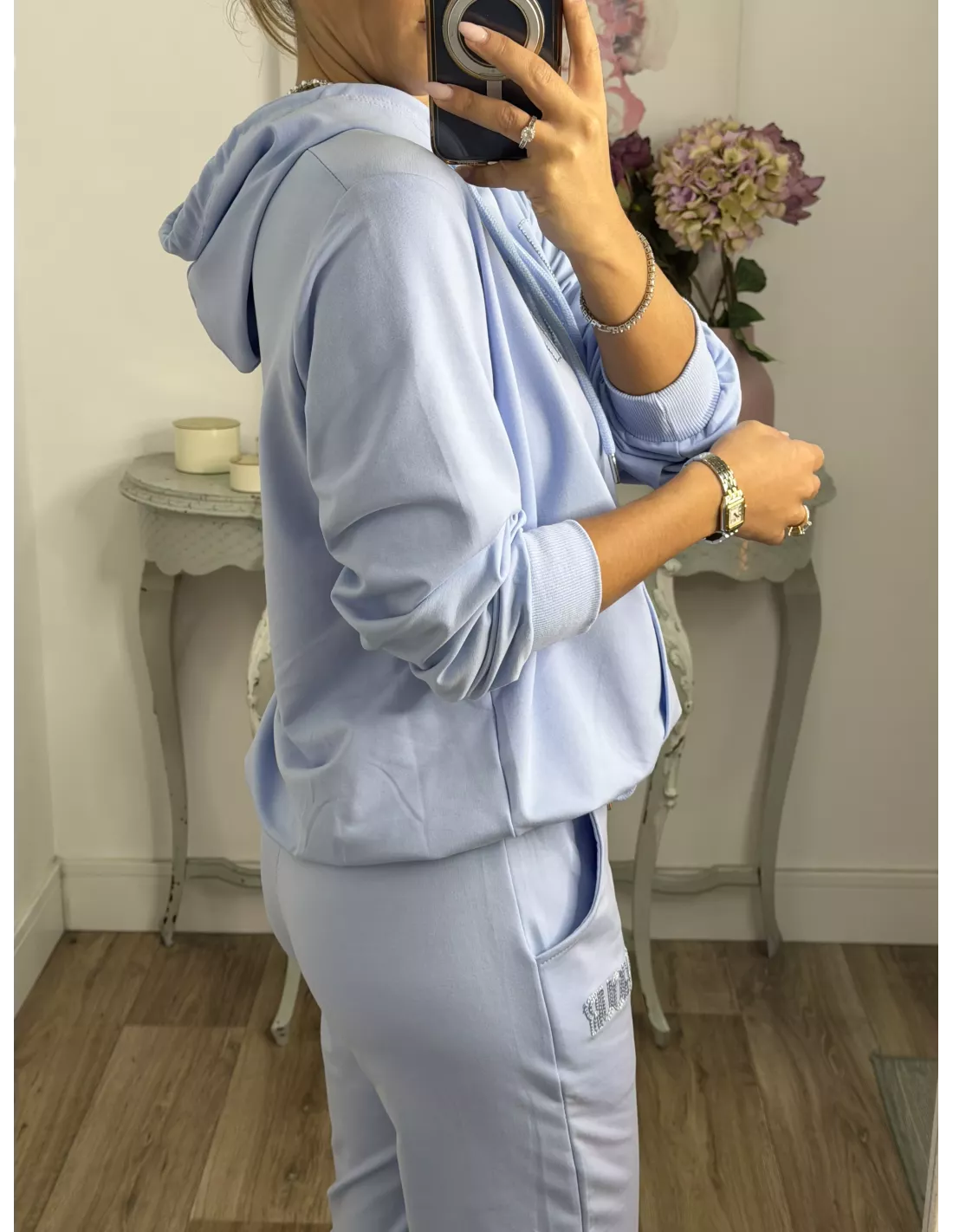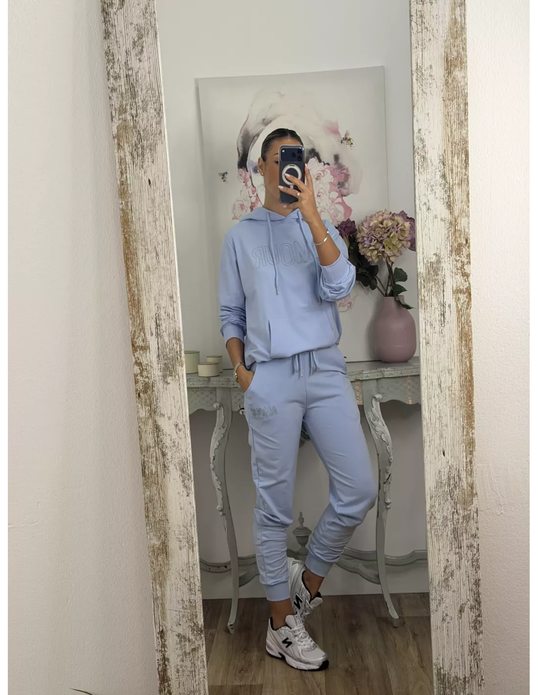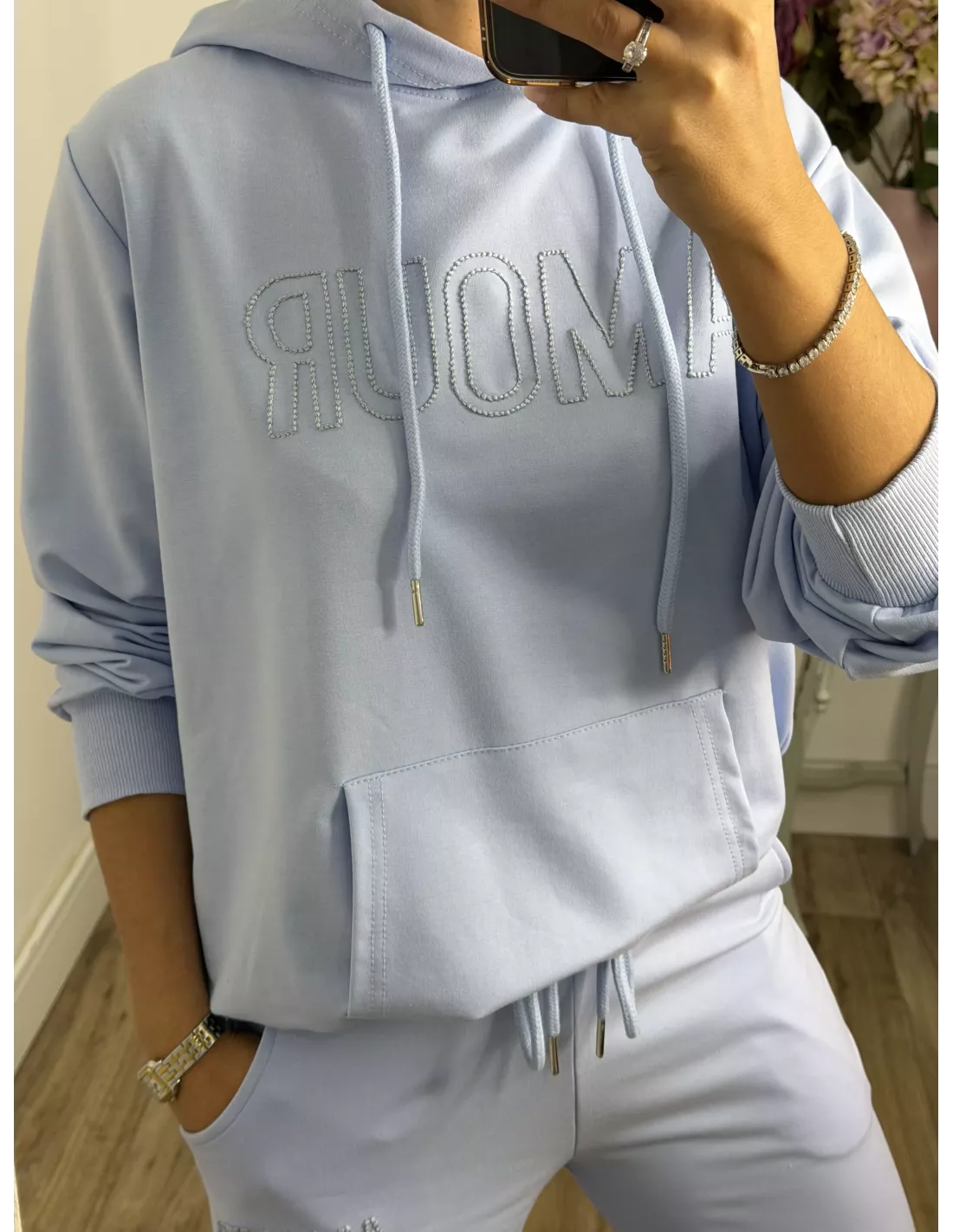 Conjunto de sudadera y pantalón. La sudadera lleva gorro y tiene una letras bordadas que pone "Amour". El pantalón lleva goma en la cintura y trae un cordón. El tejido no se arruga.