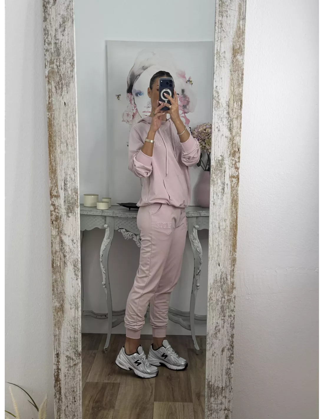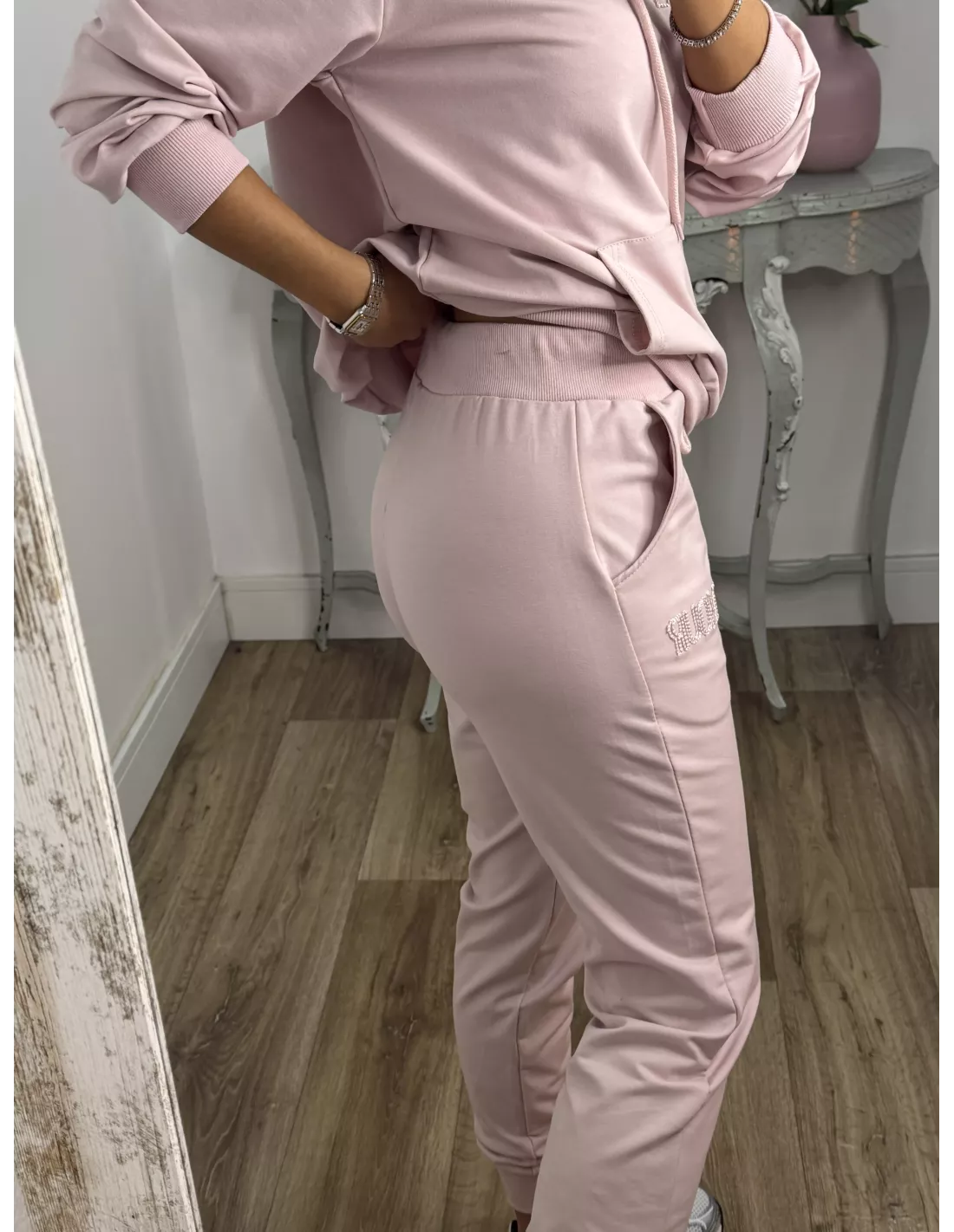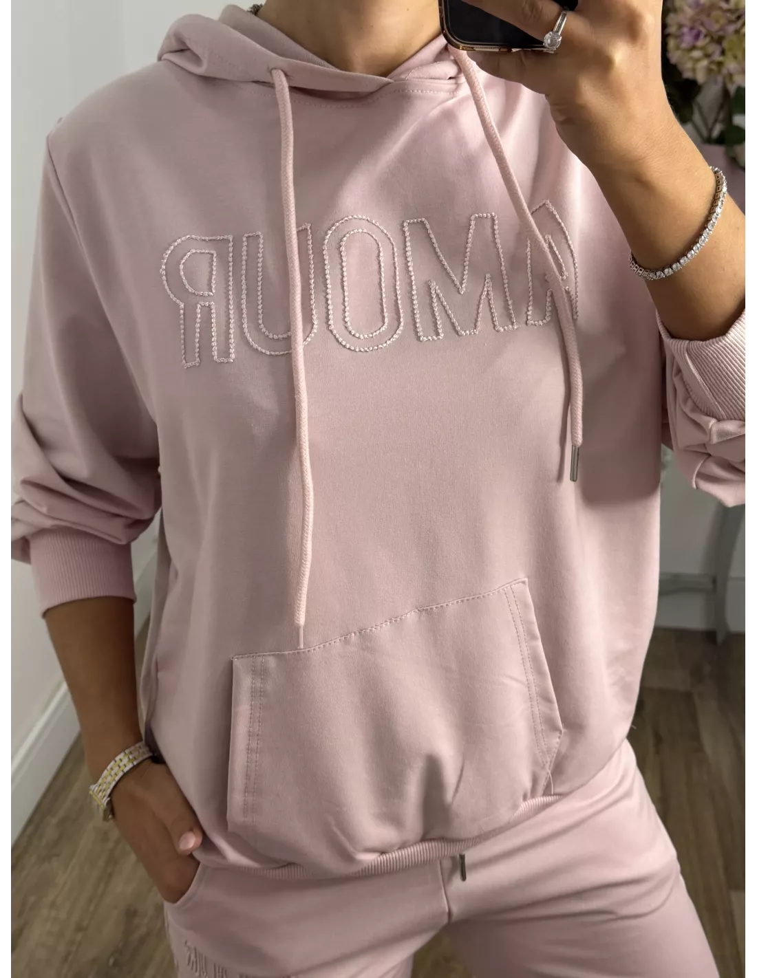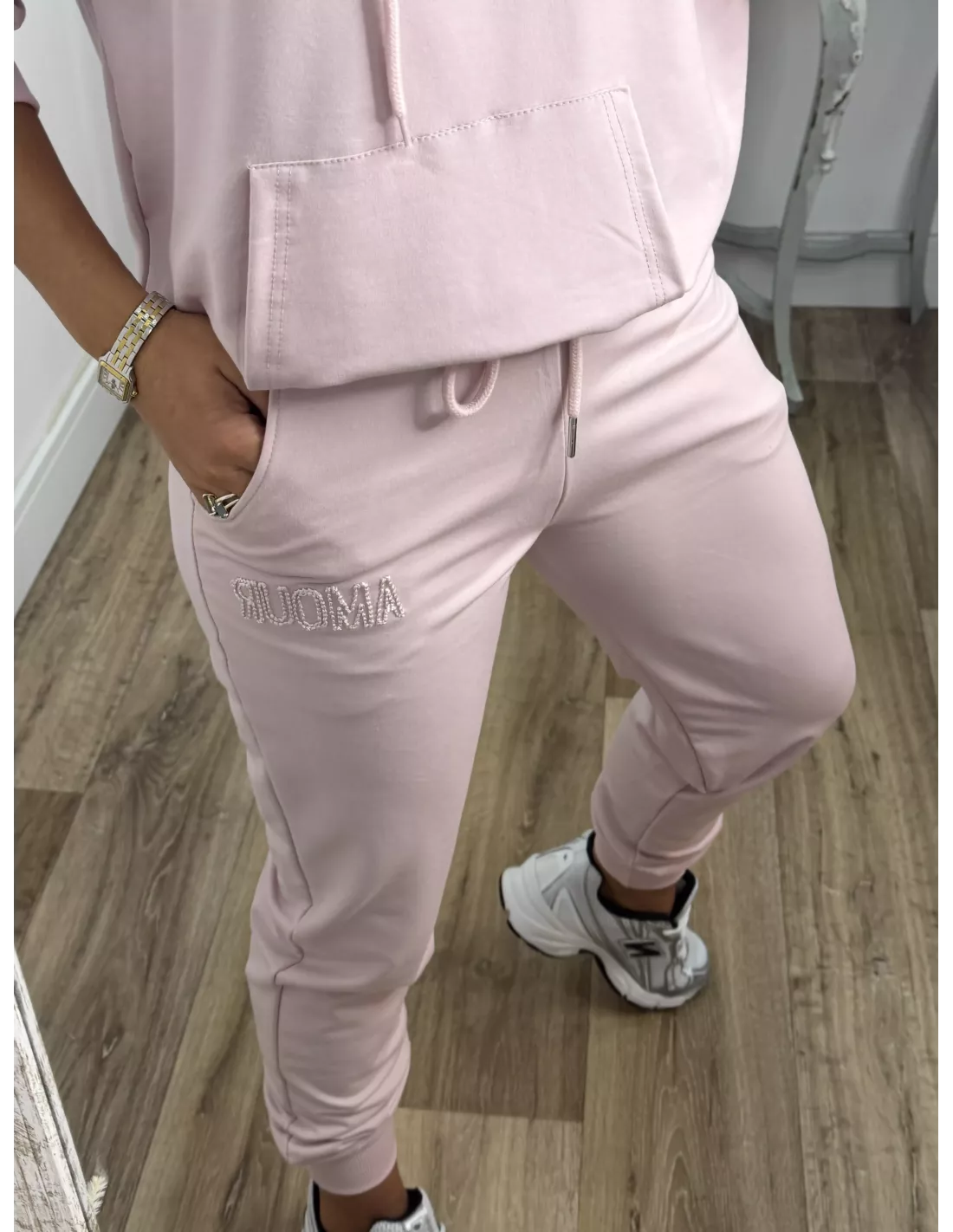 Conjunto de sudadera y pantalón. La sudadera lleva gorro y tiene una letras bordadas que pone "Amour". El pantalón lleva goma en la cintura y trae un cordón. El tejido no se arruga.