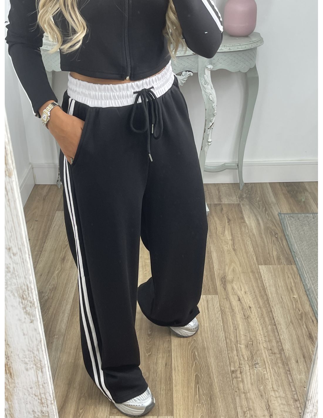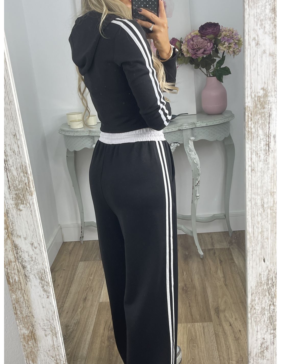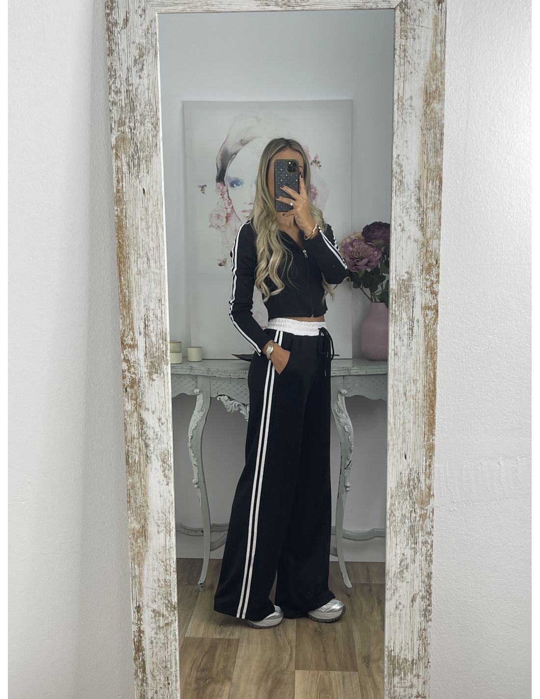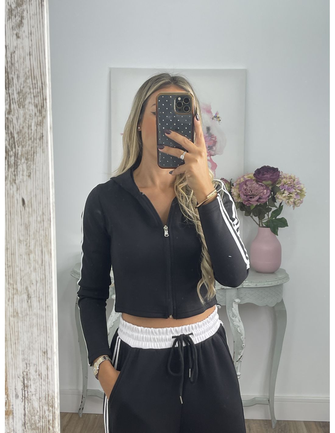Conjunto de sudadera y pantalón. La sudadera es de corte ajustado con cremallera y tiene capucha, Queda cortita. El pantalón lleva goma en la cintura y se puede ajustar con un cordon , es de corte recto.