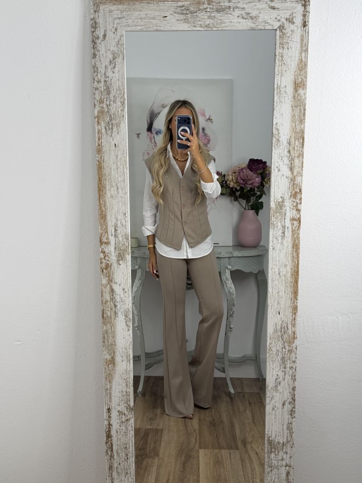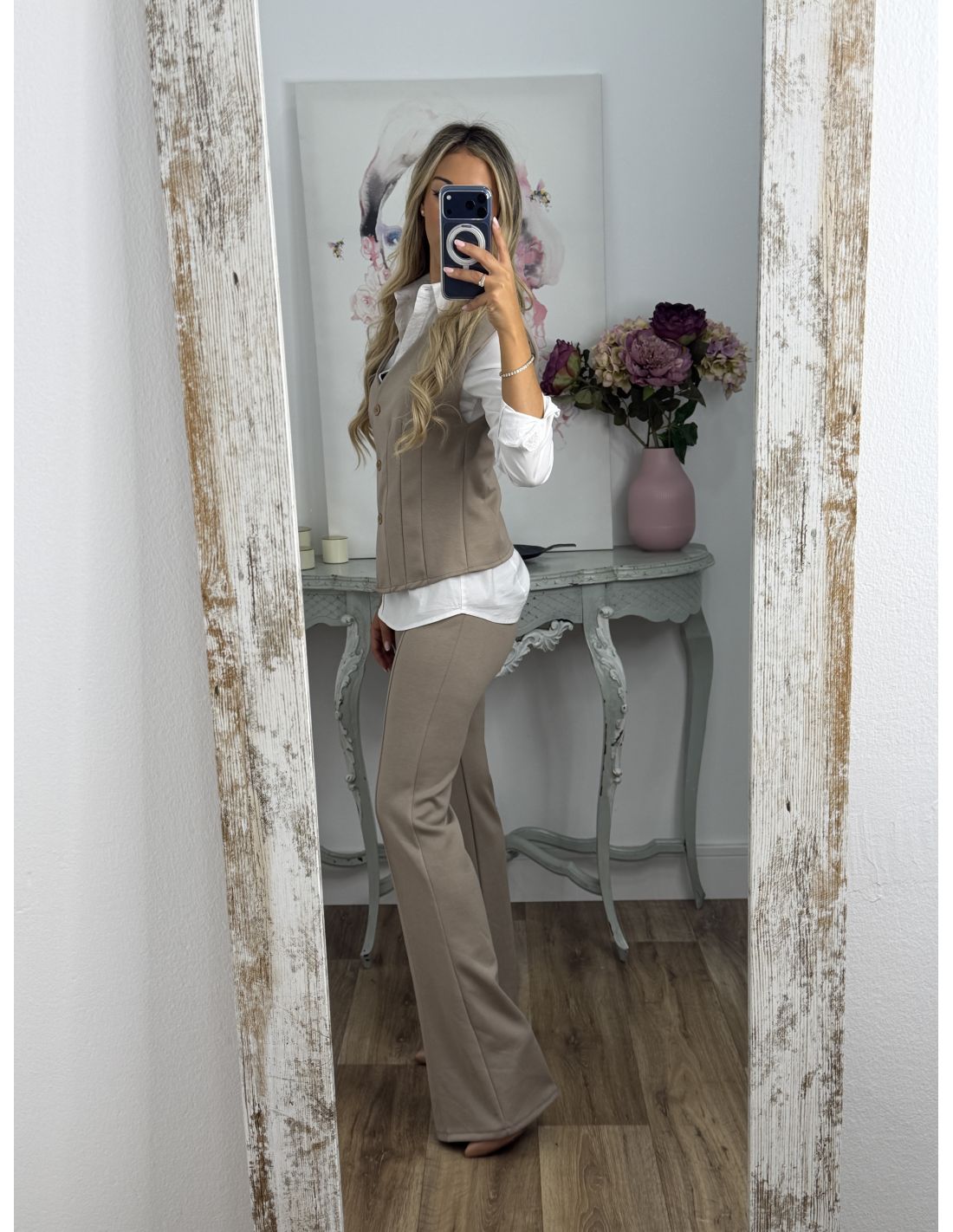 Conjunto de chaleco y pantalón. El chaleco se abotonado y se puede abrir, no va forrado y no tiene bolsillos. El pantalón es de corte acampanado y lleva goma en la cintura. El tejido es de punto grueso.