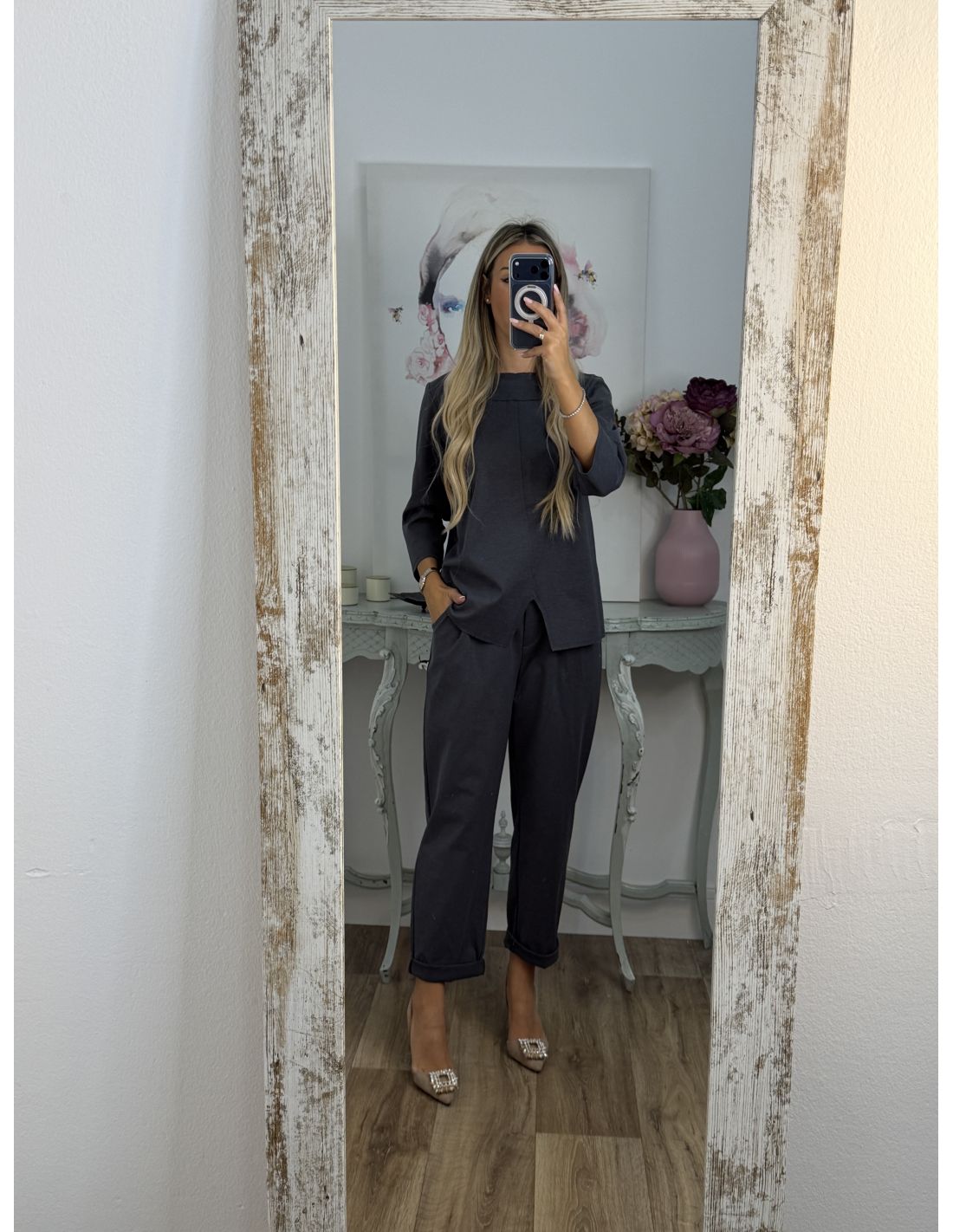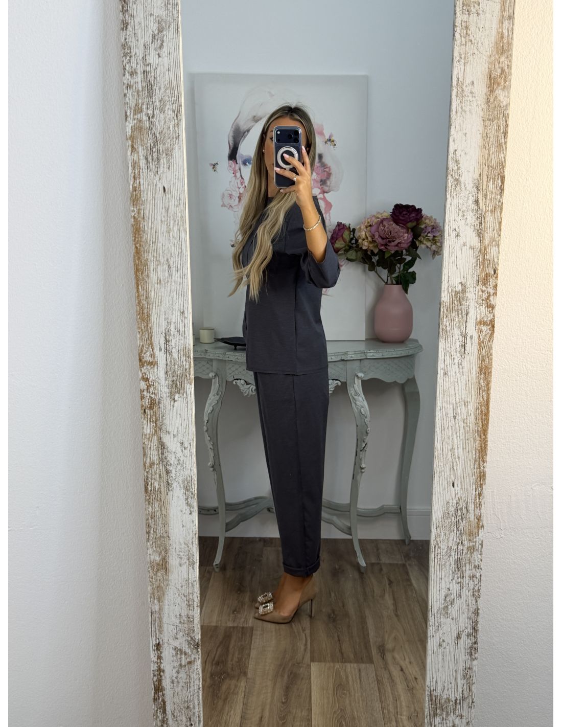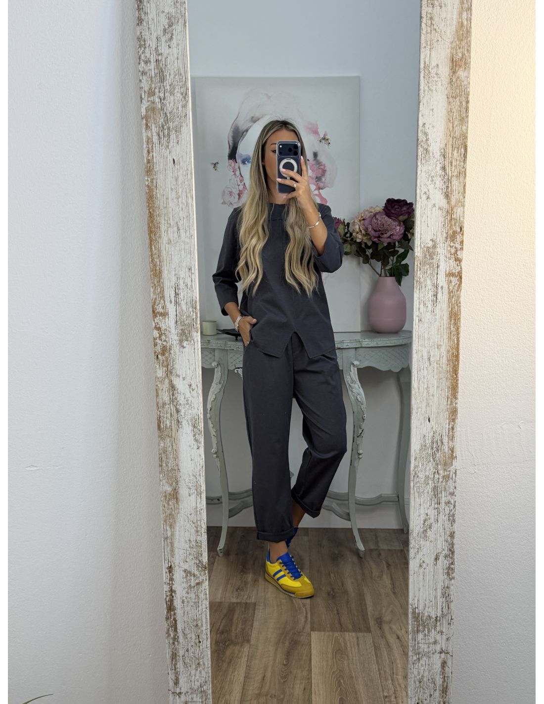 Conjuro de camiseta y pantalón. Camiseta de cuello a la caja de corte suelto. El pantalón es de corte jogger Con goma en la cintura, trae villas y bolsillos tipo chino, El bajo del pantalón es recto normal no lleva la vuelta. El tejido es de punto muy cómodo.