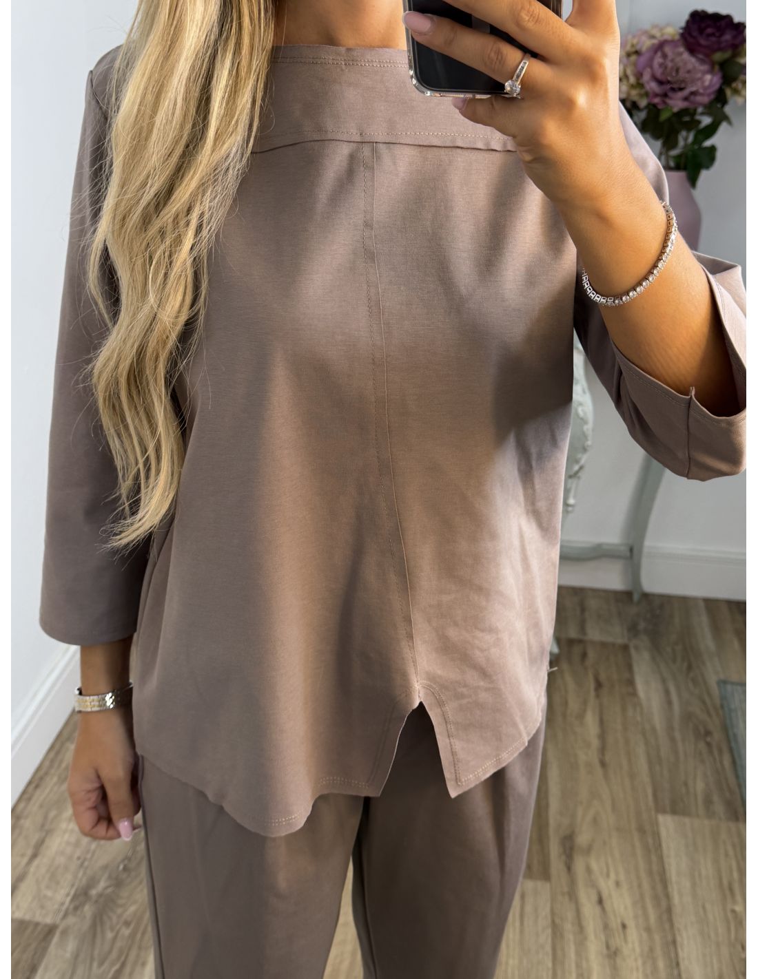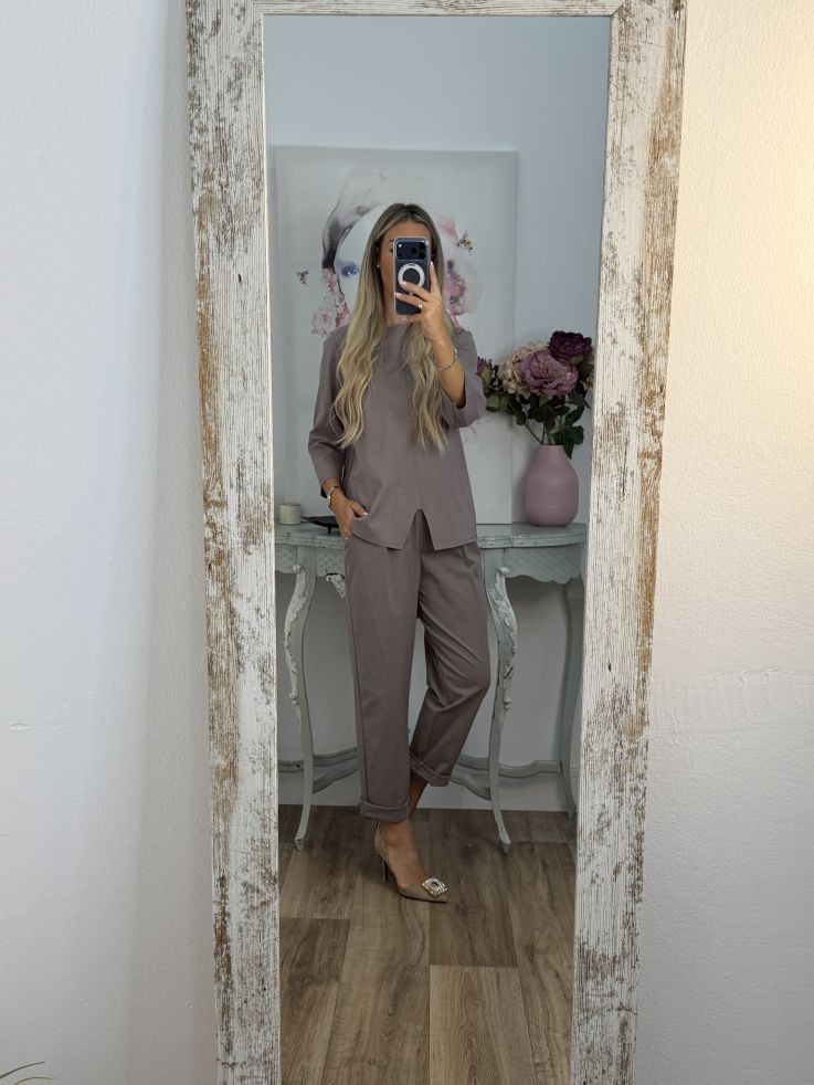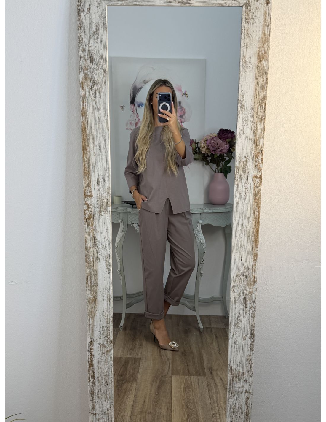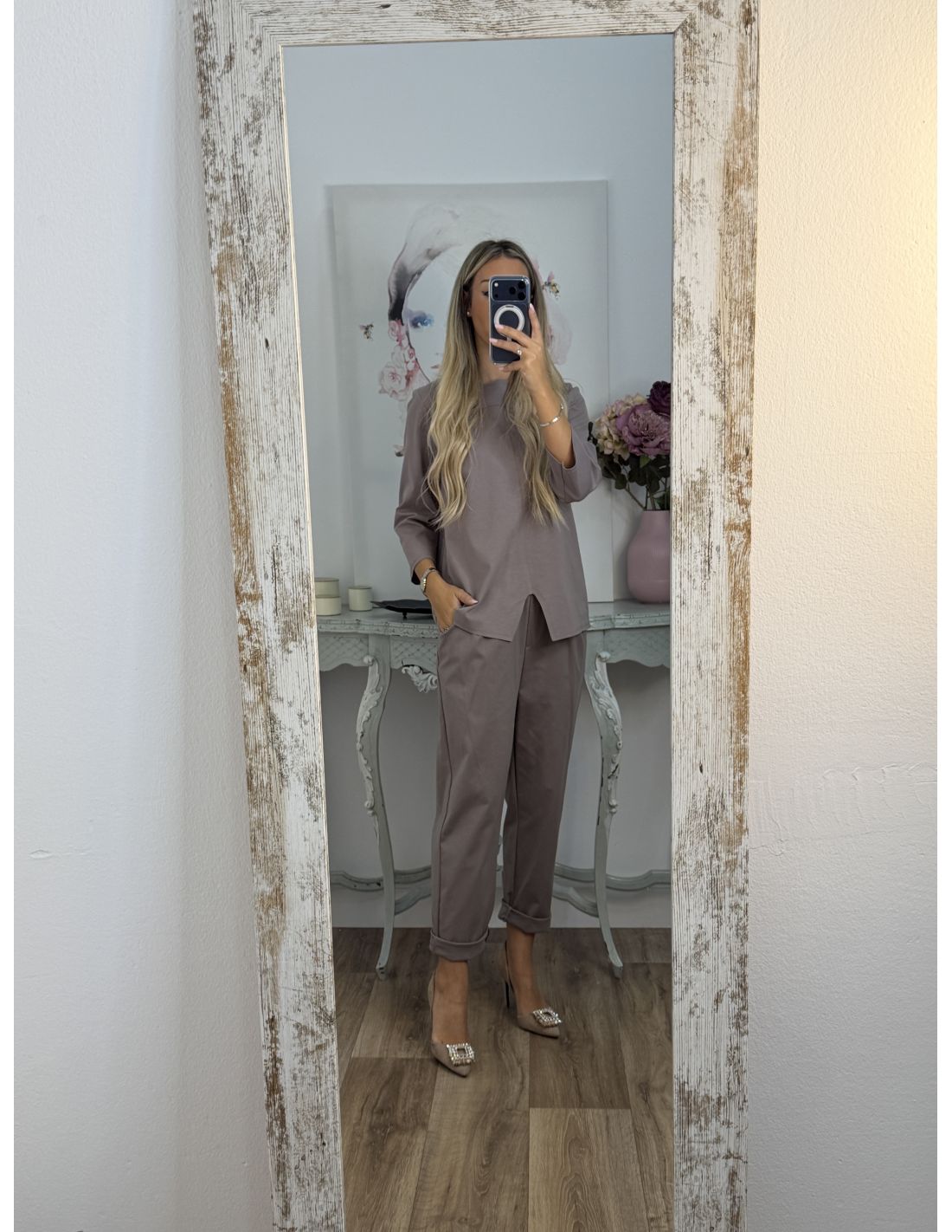 Conjuro de camiseta y pantalón. Camiseta de cuello a la caja de corte suelto. El pantalón es de corte jogger Con goma en la cintura, trae villas y bolsillos tipo chino, El bajo del pantalón es recto normal no lleva la vuelta. El tejido es de punto muy cómodo.