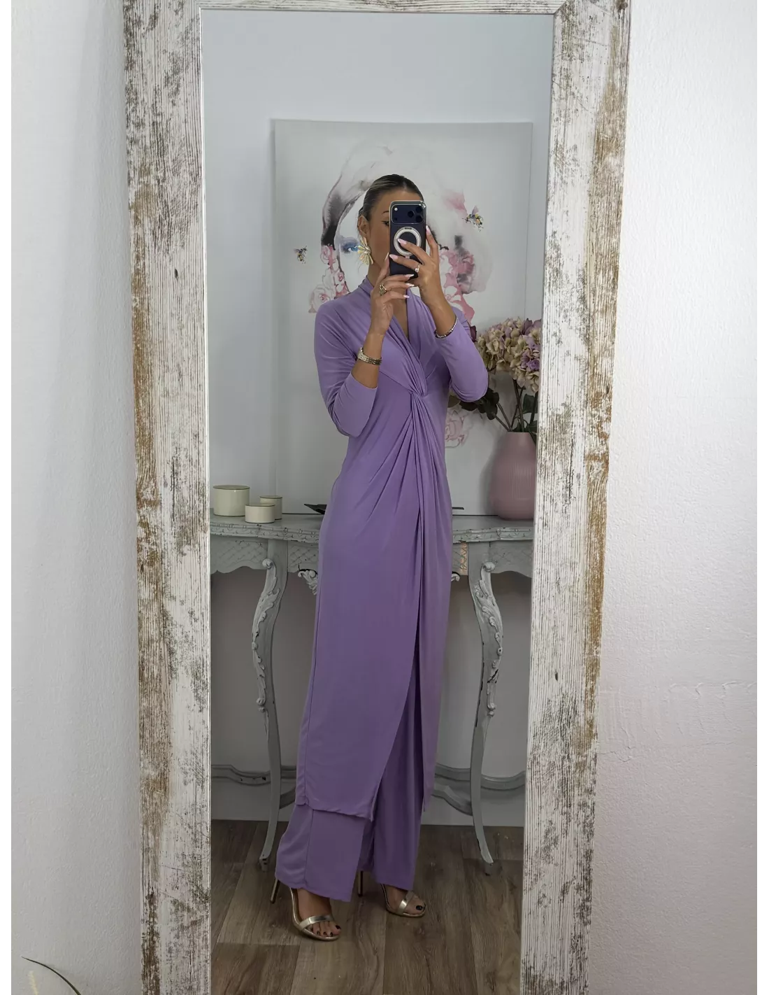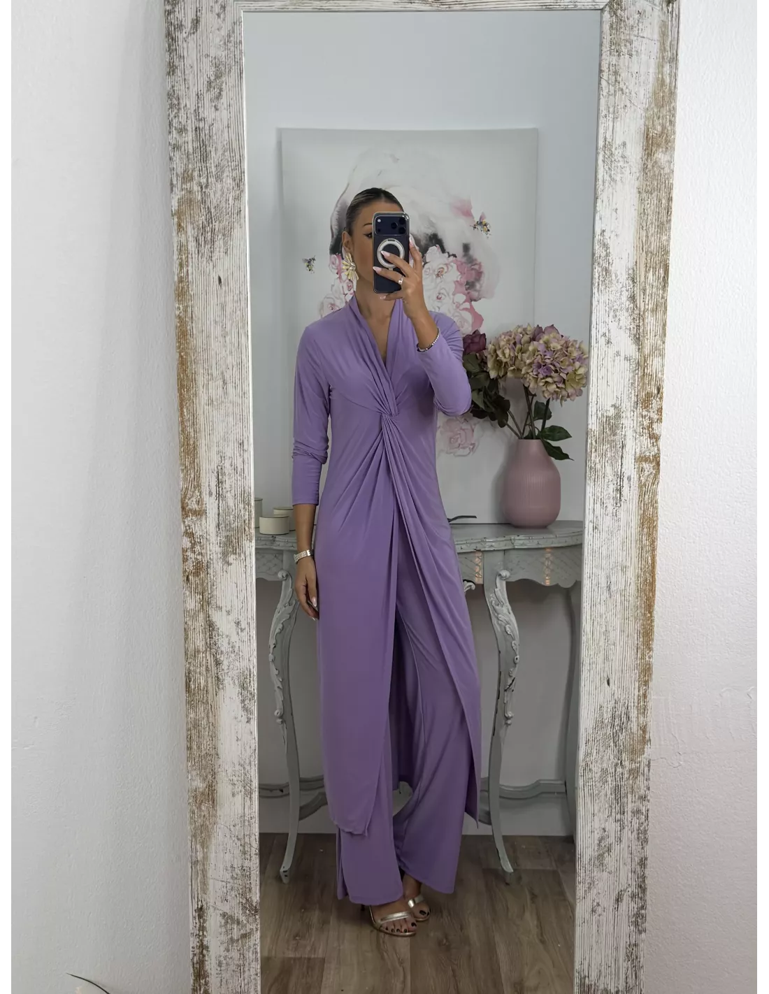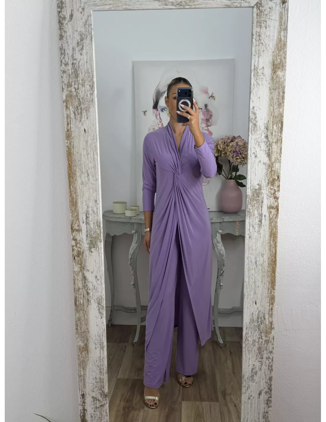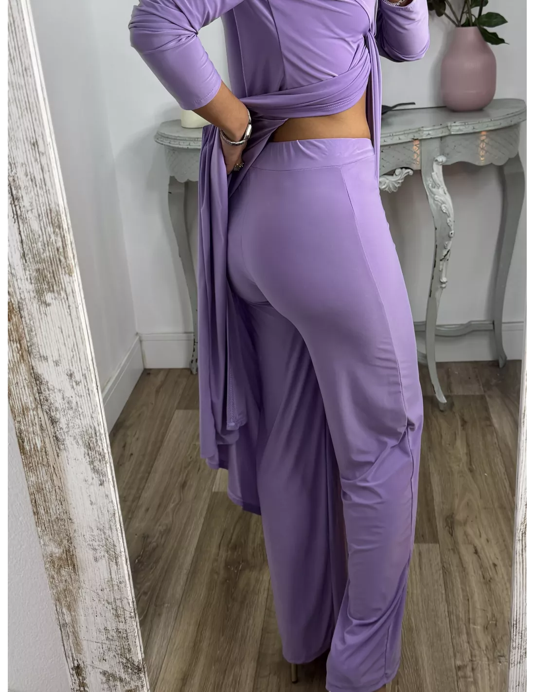 Conjunto de blusón y pantalón de punto de seda. El blusón lleva tipo nudo en la zona del pecho y luego está abierto. Pantalón, con goma en la cintura y de corte recto, no tapa el zapato.