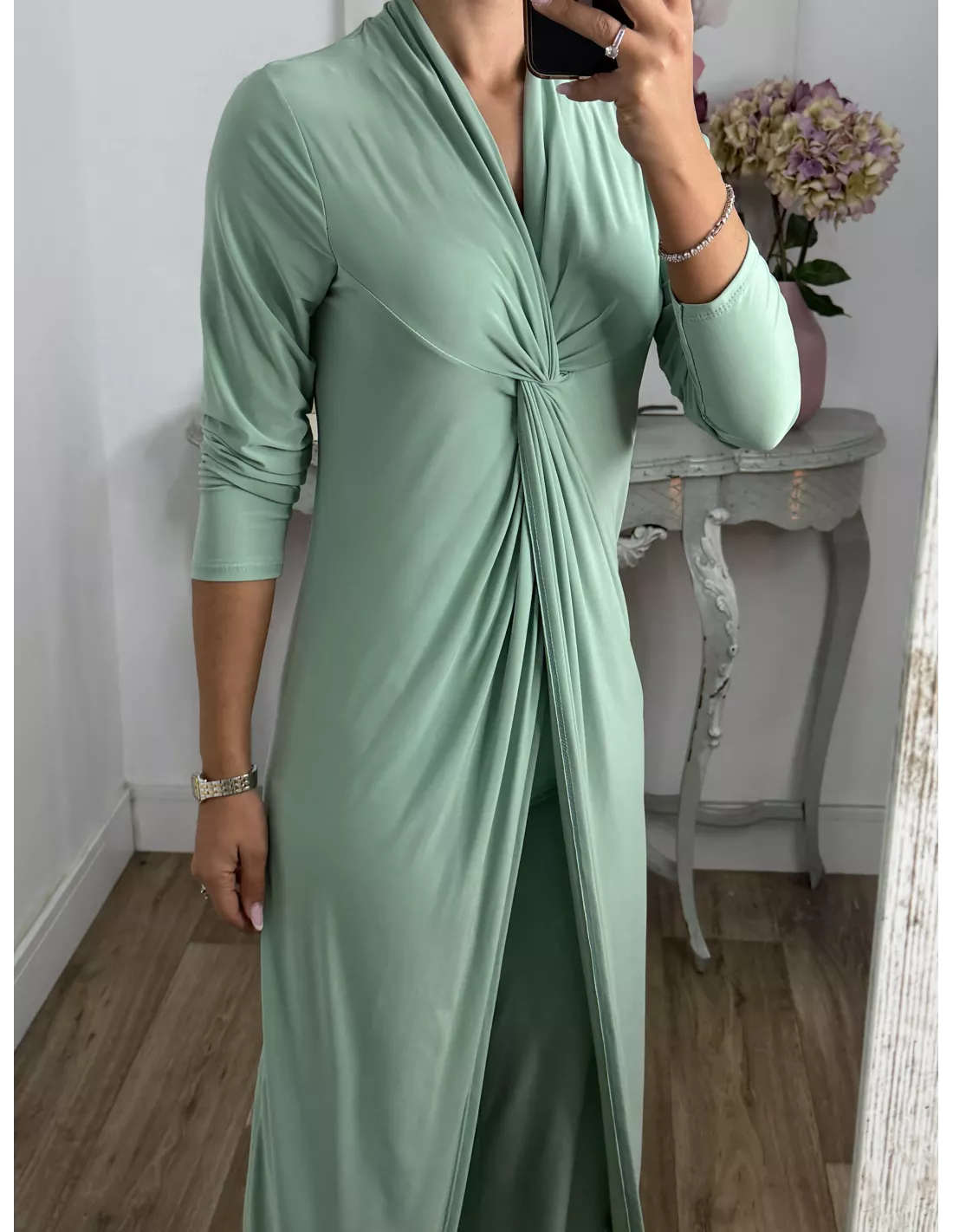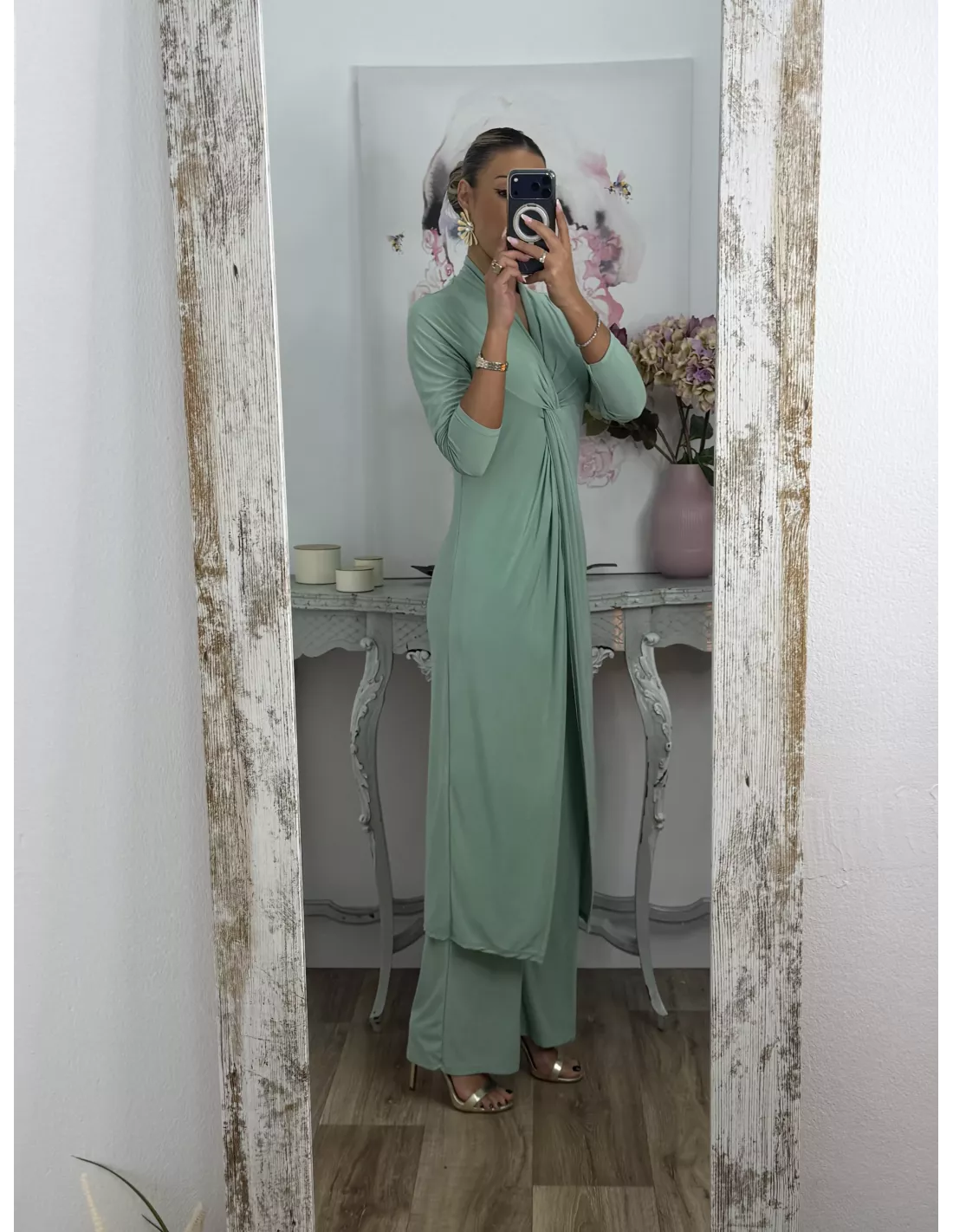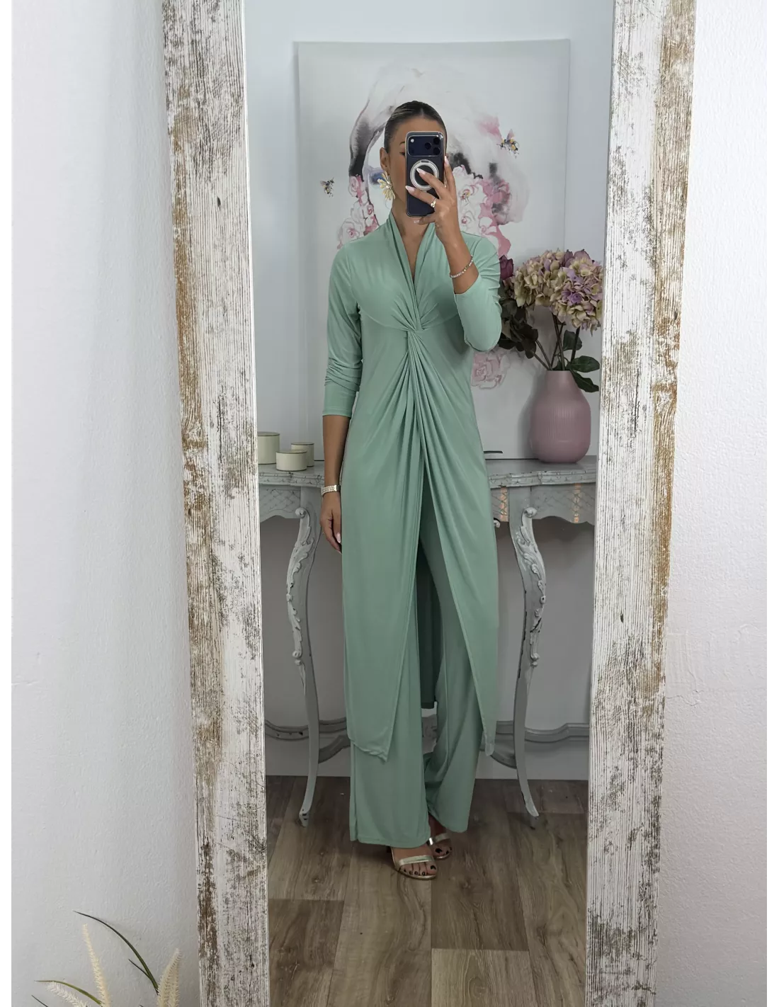 Conjunto de blusón y pantalón de punto de seda. El blusón lleva tipo nudo en la zona del pecho y luego está abierto. Pantalón, con goma en la cintura y de corte recto, no tapa el zapato.