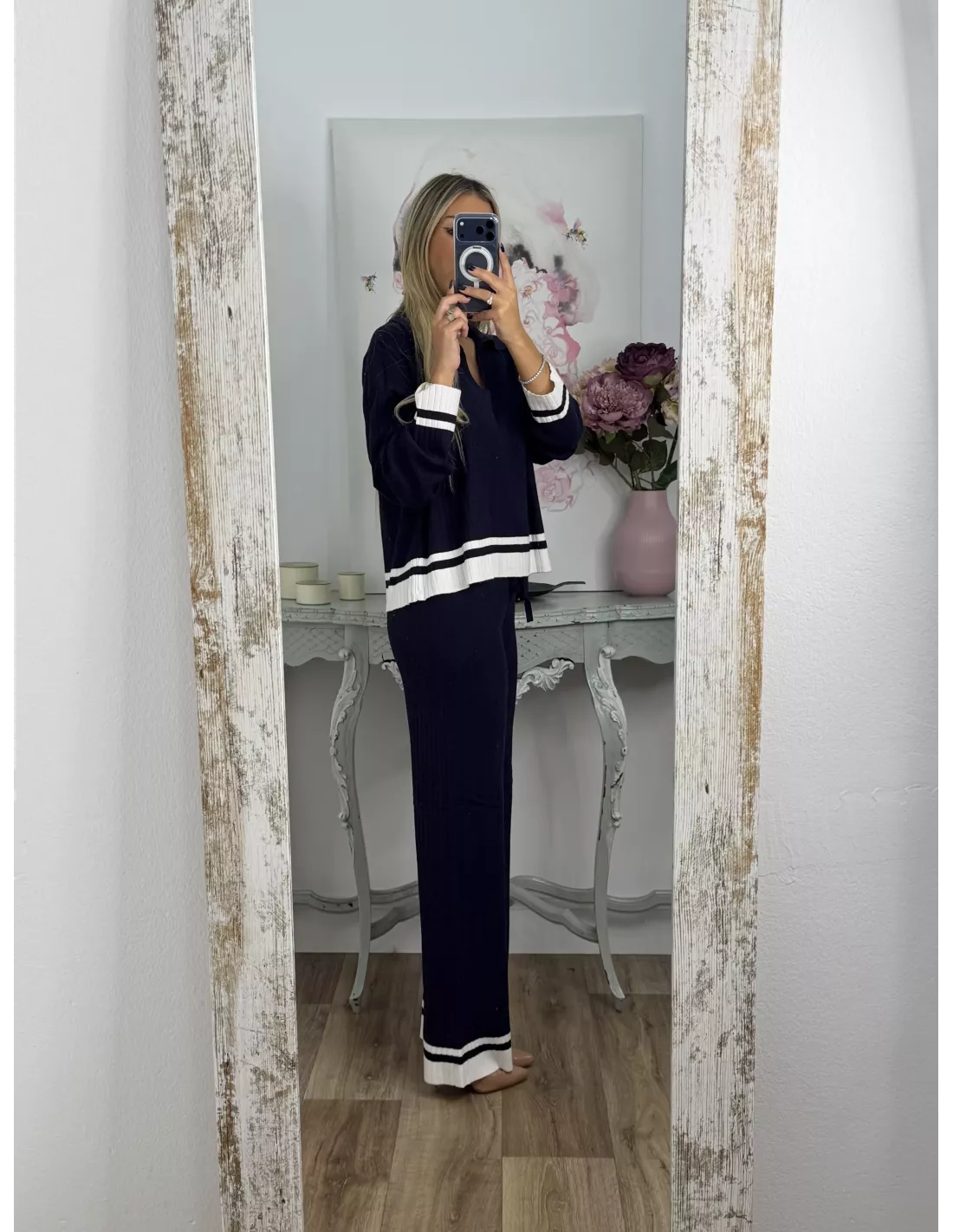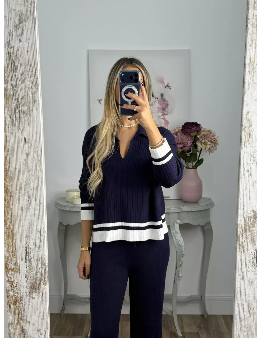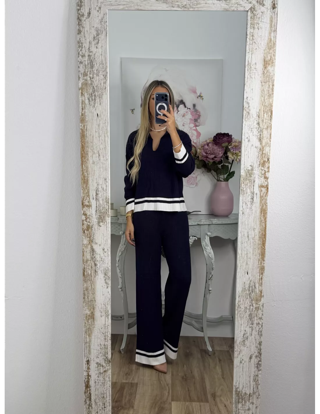 Conjunto de jersey pantalón. El jersey es tipo polo y la parte de abajo lleva una franja en otro color. El pantalón es de corte recto con goma en la cintura, no tiene bolsillos, no se transparenta, el tejido es de punto muy suave.