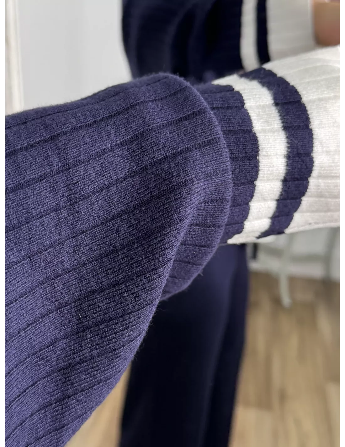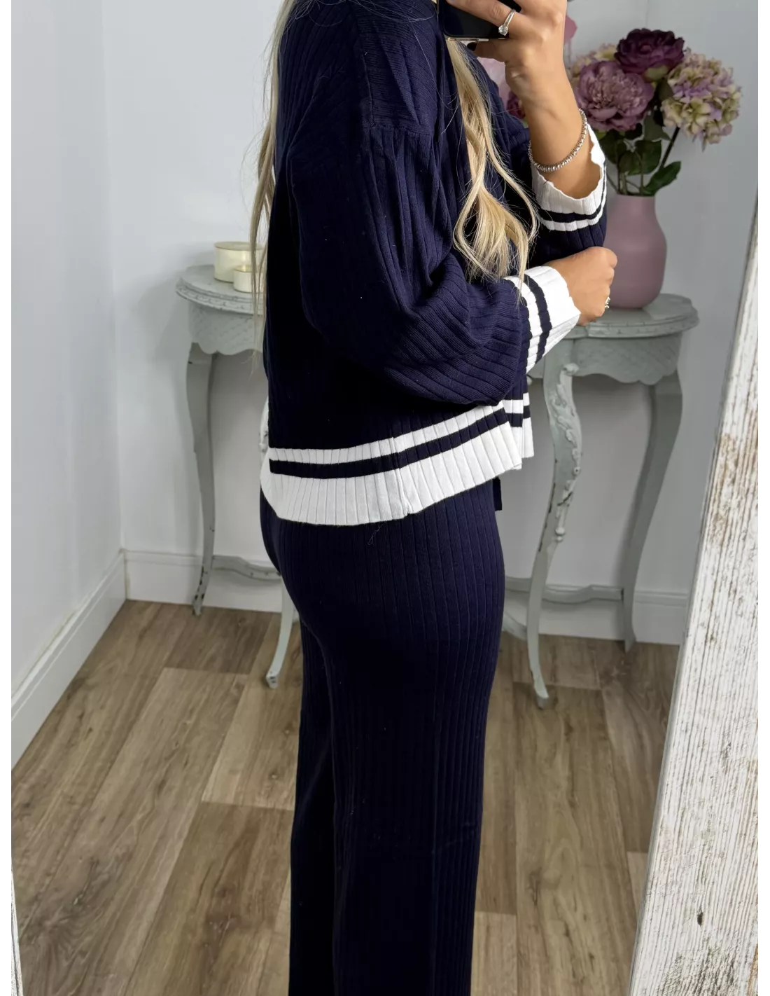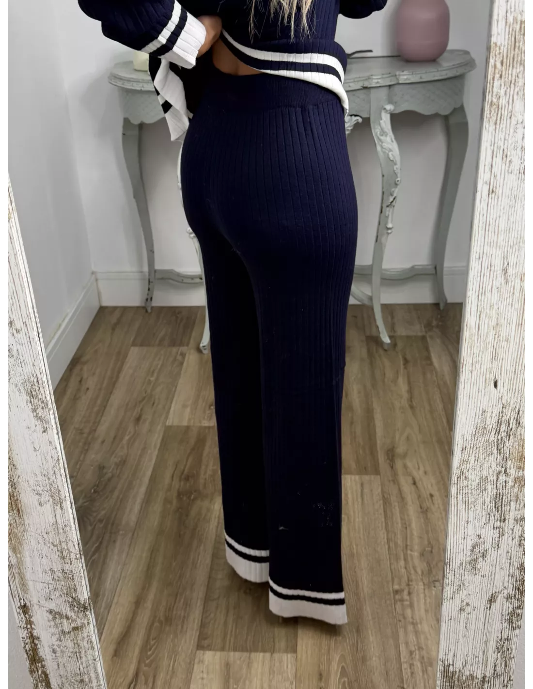 Conjunto de jersey pantalón. El jersey es tipo polo y la parte de abajo lleva una franja en otro color. El pantalón es de corte recto con goma en la cintura, no tiene bolsillos, no se transparenta, el tejido es de punto muy suave.