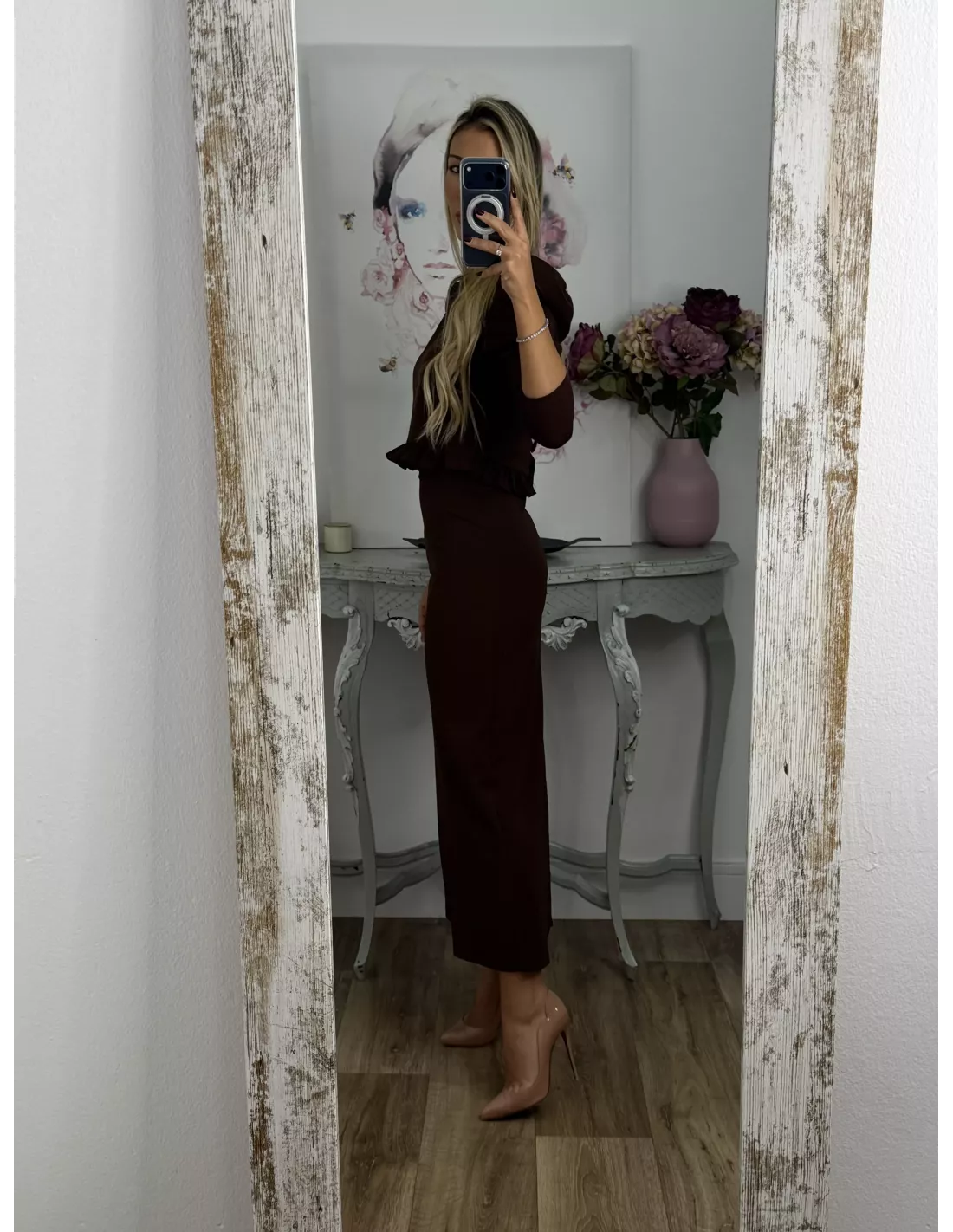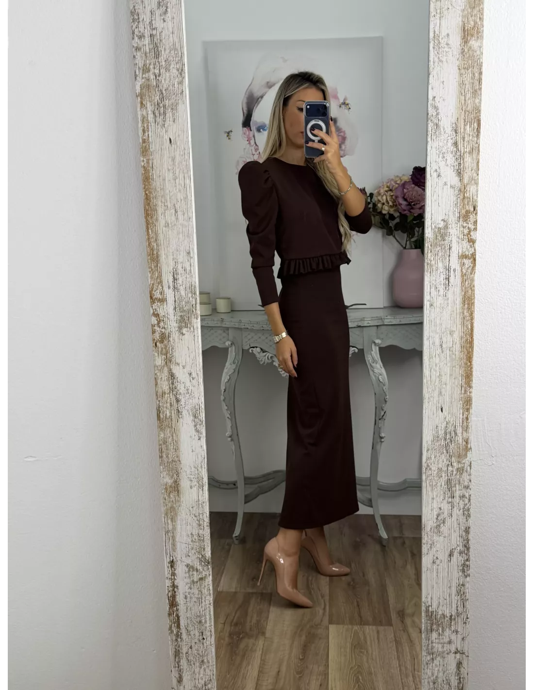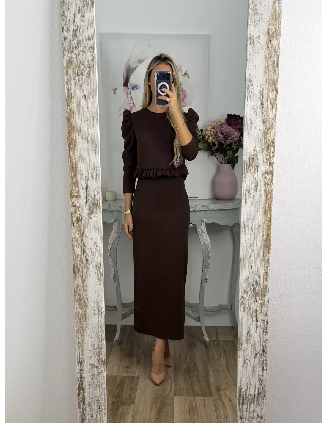 Conjunto de chaqueta/ Blusa abotonada y falda. La chaqueta/ Blusa va abotonada y lleva hombreras y la manga es tipo farol. La chaqueta/Blusa te la puedes poner los botones tanto hacia delante como hacia atrás. La falda lleva goma en la cintura y es de corte tipo lápiz lleva una raja en la parte de atrás y permite caminar bien. El tejido es de punto no marca ni se transparenta.