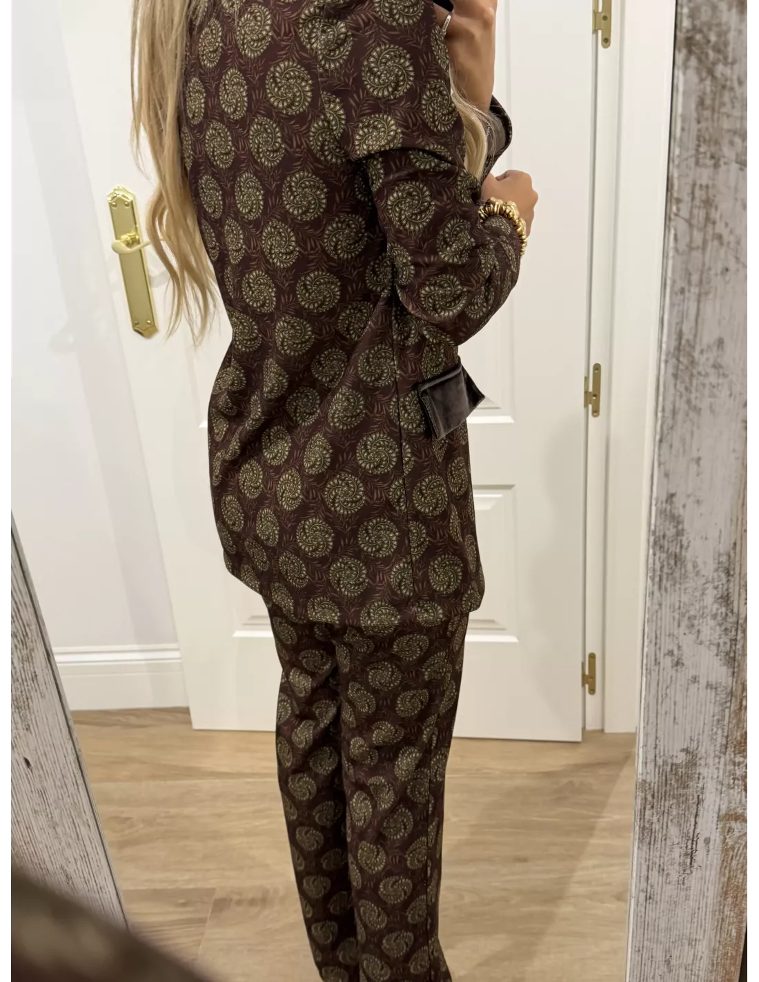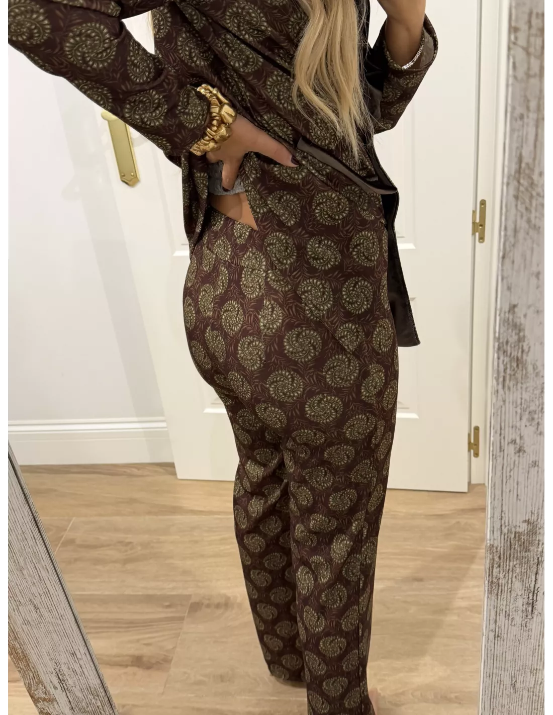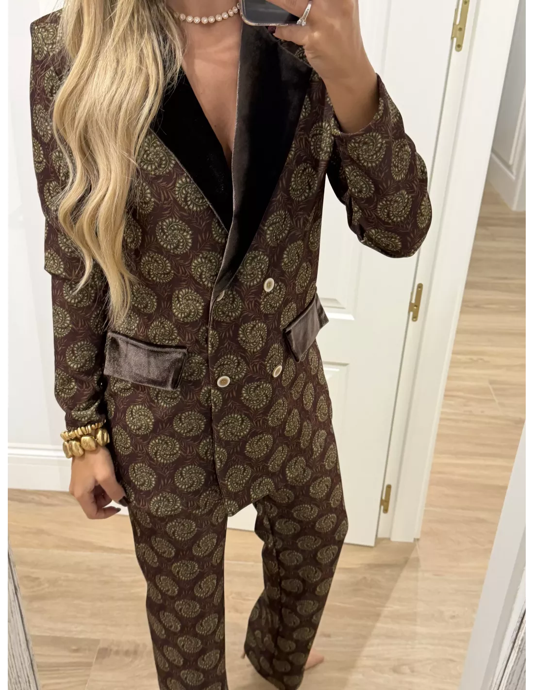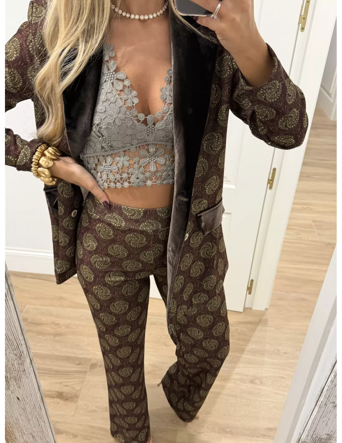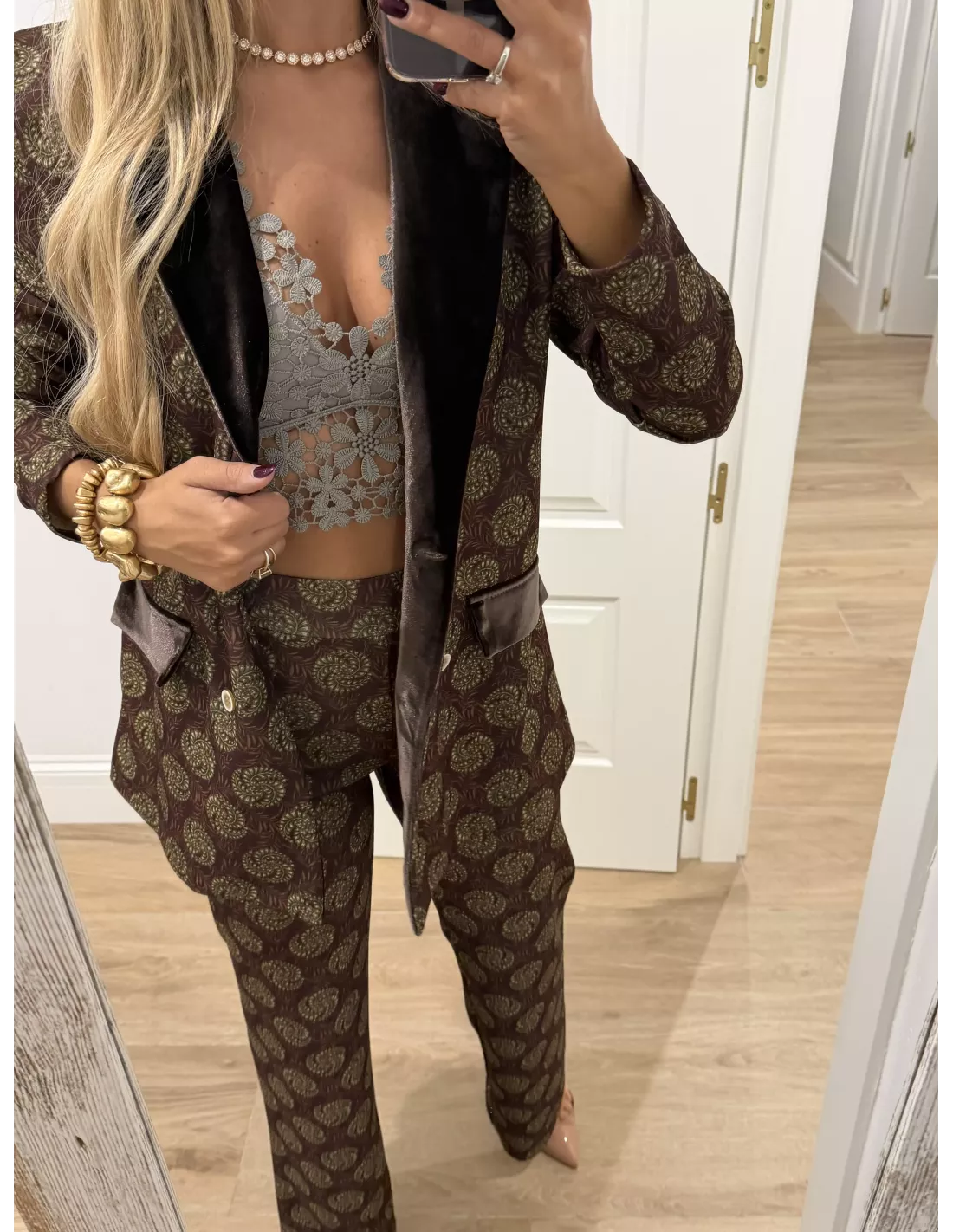Traje de chaqueta estampado. La chaqueta, el corte es montado y lleva la solapa de terciopelo. Al igual que las tapetes del bolsillo, no tiene bolsillos la chaqueta lleva hombreras. El pantalón lleva goma en la cintura y es de corte recto. El bralett está disponible en la web en la sección de lencería.