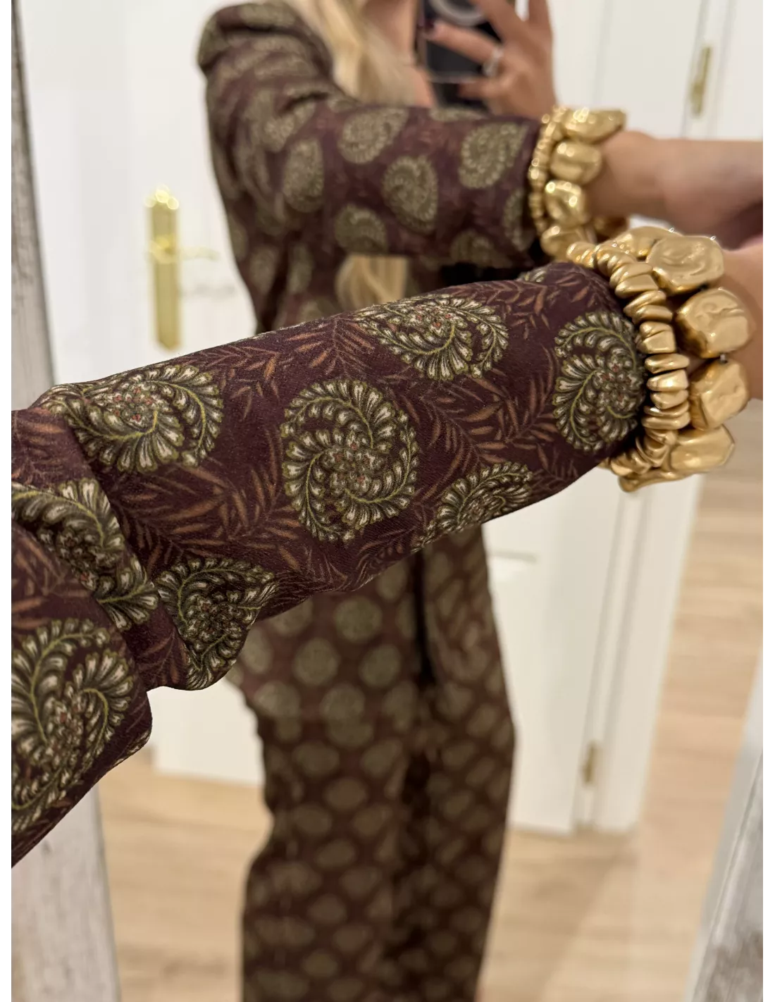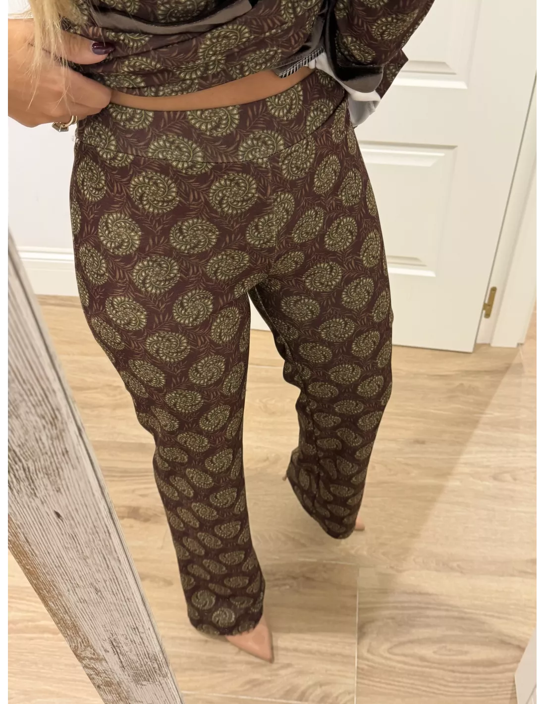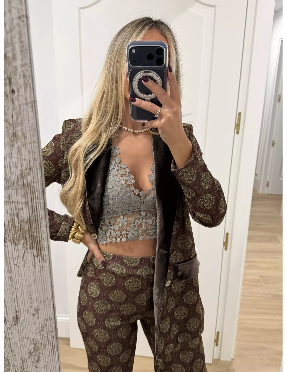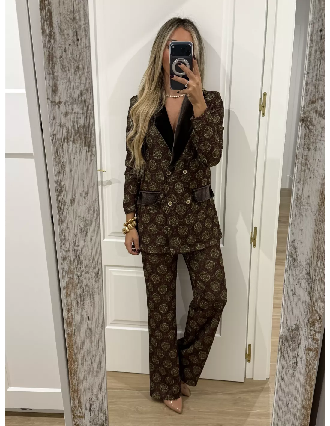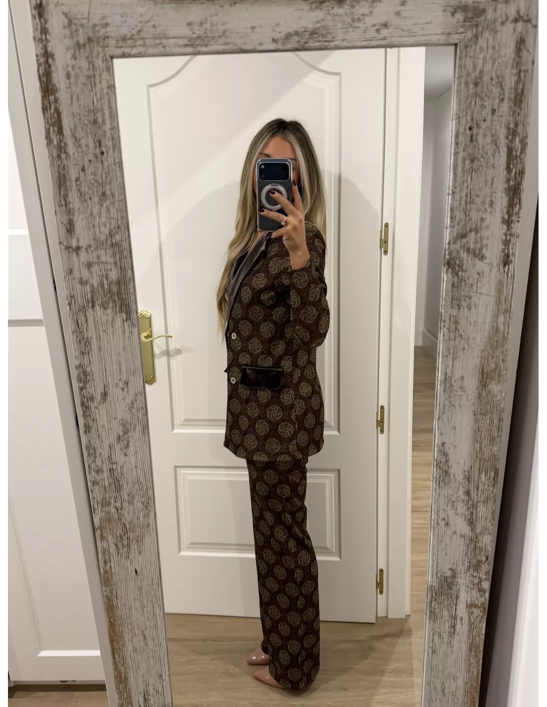 Traje de chaqueta estampado. La chaqueta, el corte es montado y lleva la solapa de terciopelo. Al igual que las tapetes del bolsillo, no tiene bolsillos la chaqueta lleva hombreras. El pantalón lleva goma en la cintura y es de corte recto. El bralett está disponible en la web en la sección de lencería.