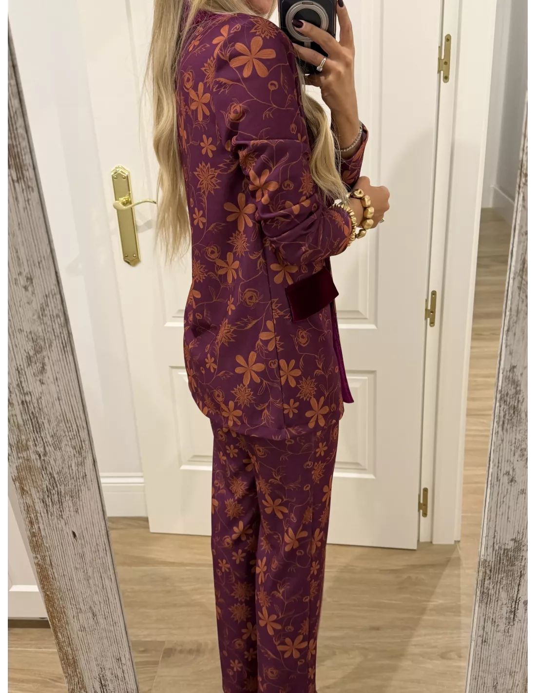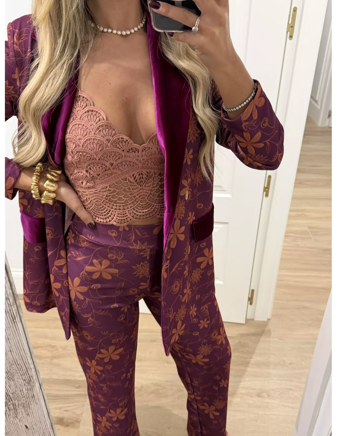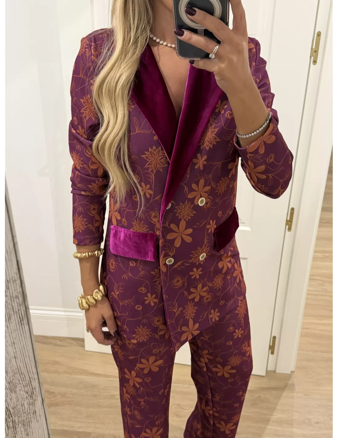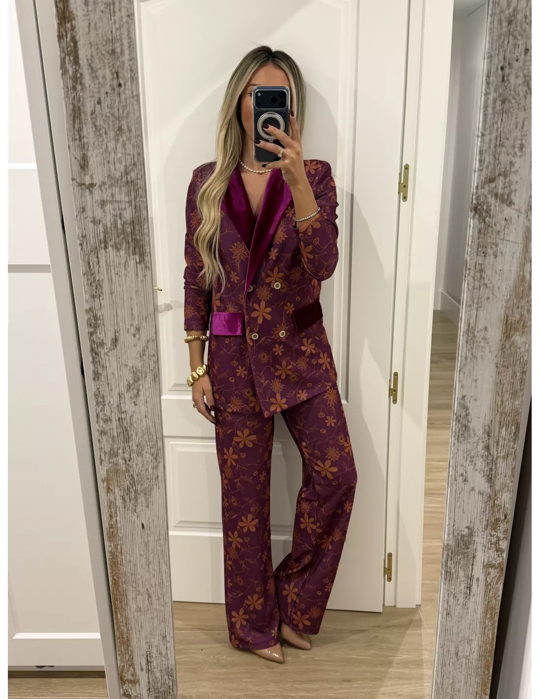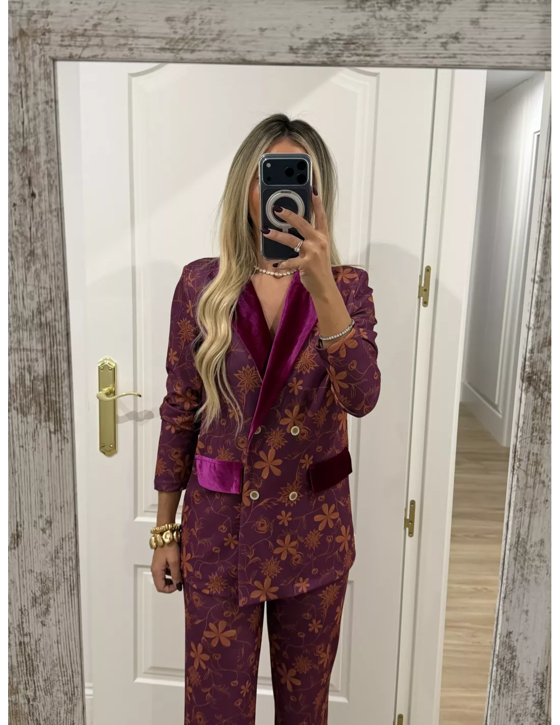 Traje de chaqueta estampado. La chaqueta, el corte es montado y lleva la solapa de terciopelo. Al igual que las tapetes del bolsillo, no tiene bolsillos la chaqueta lleva hombreras. El pantalón lleva goma en la cintura y es de corte recto. El bralett está disponible en la web en la sección de lencería.
