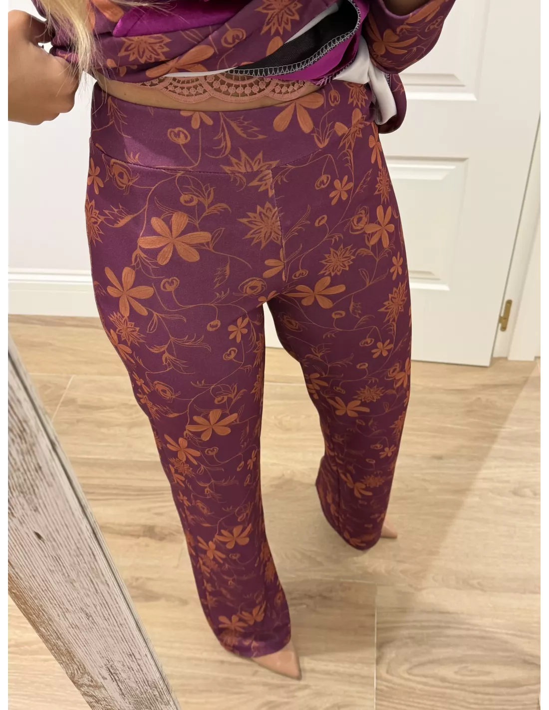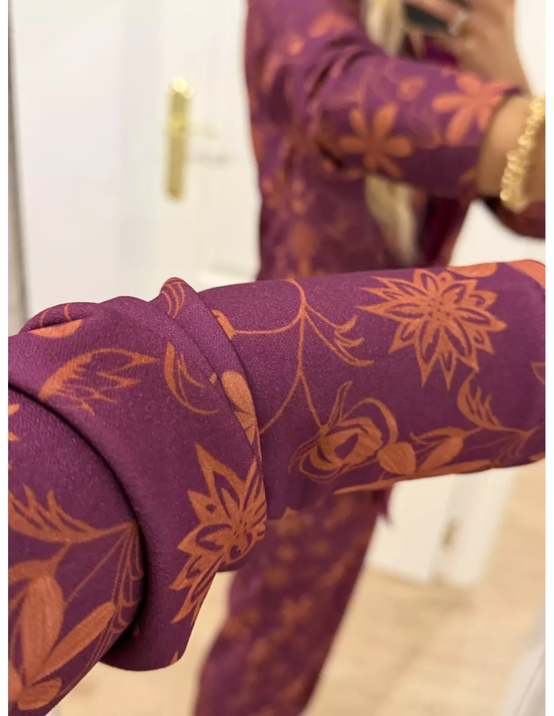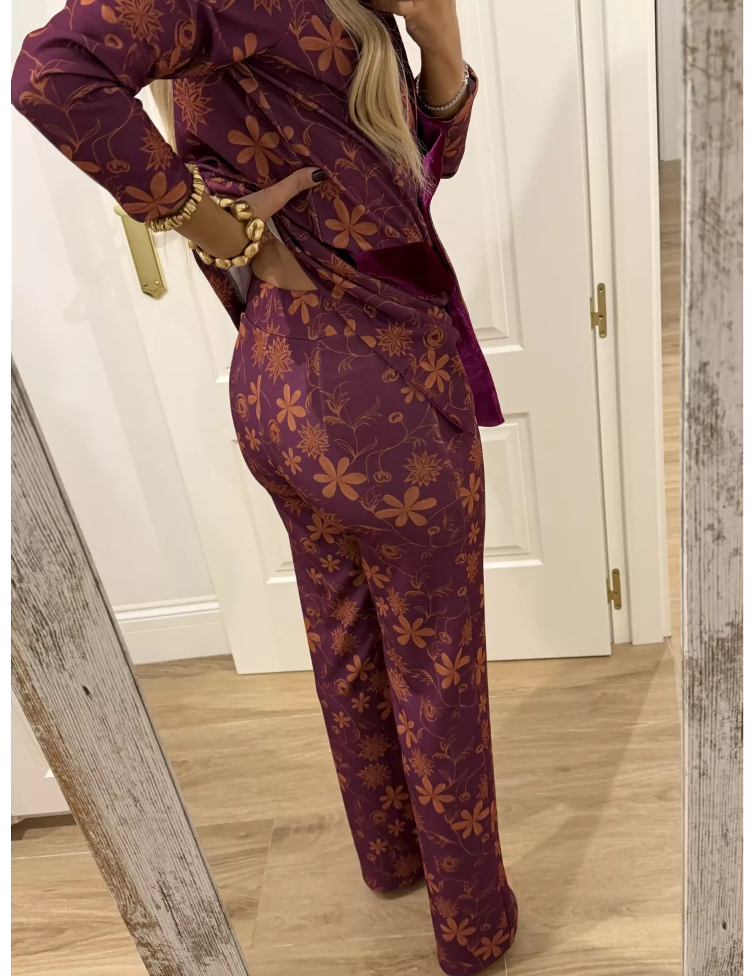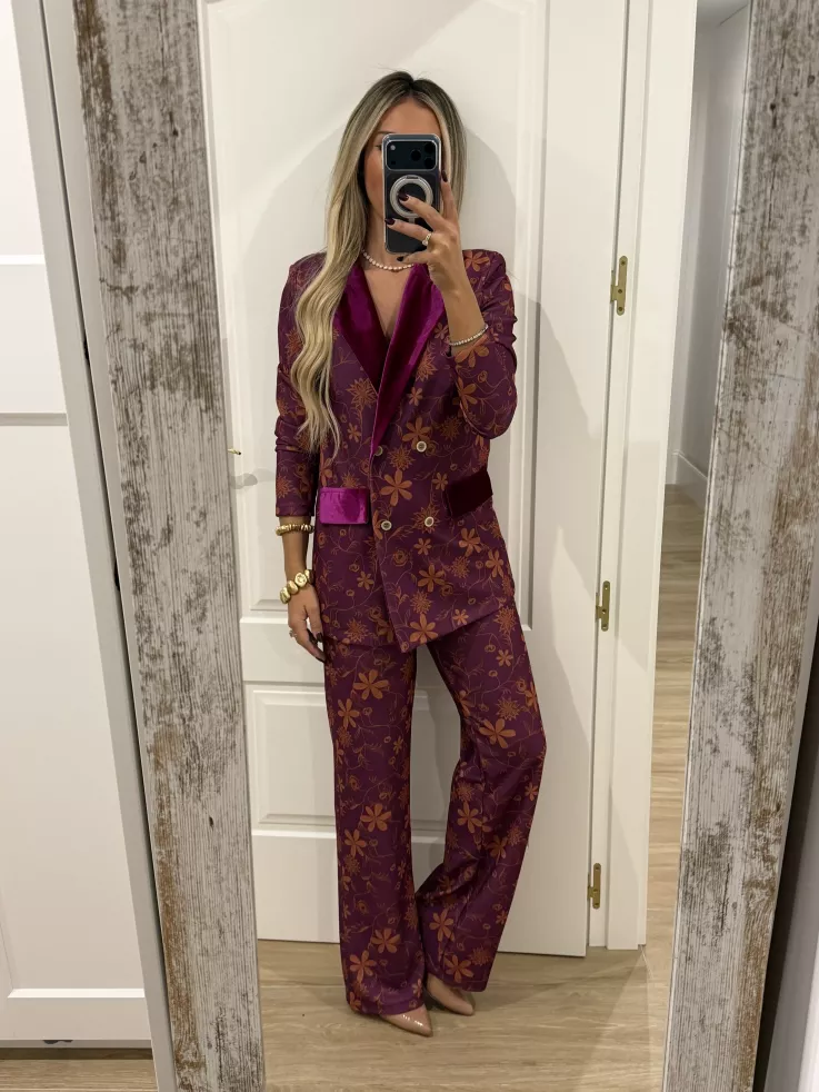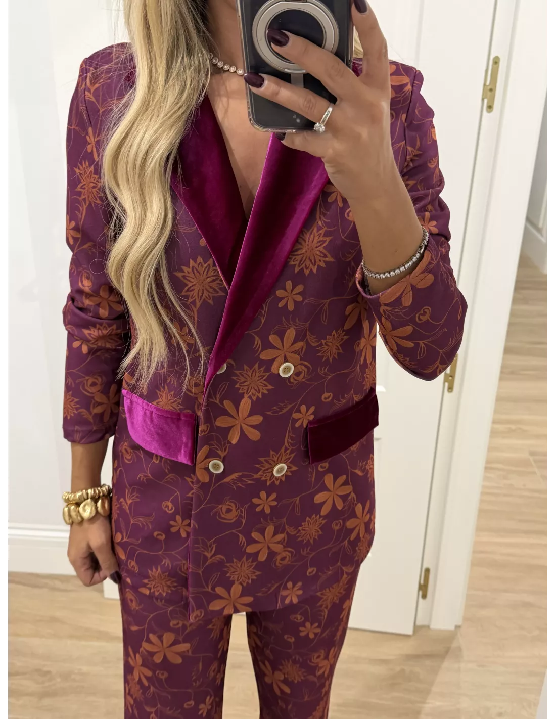 Traje de chaqueta estampado. La chaqueta, el corte es montado y lleva la solapa de terciopelo. Al igual que las tapetes del bolsillo, no tiene bolsillos la chaqueta lleva hombreras. El pantalón lleva goma en la cintura y es de corte recto. El bralett está disponible en la web en la sección de lencería.