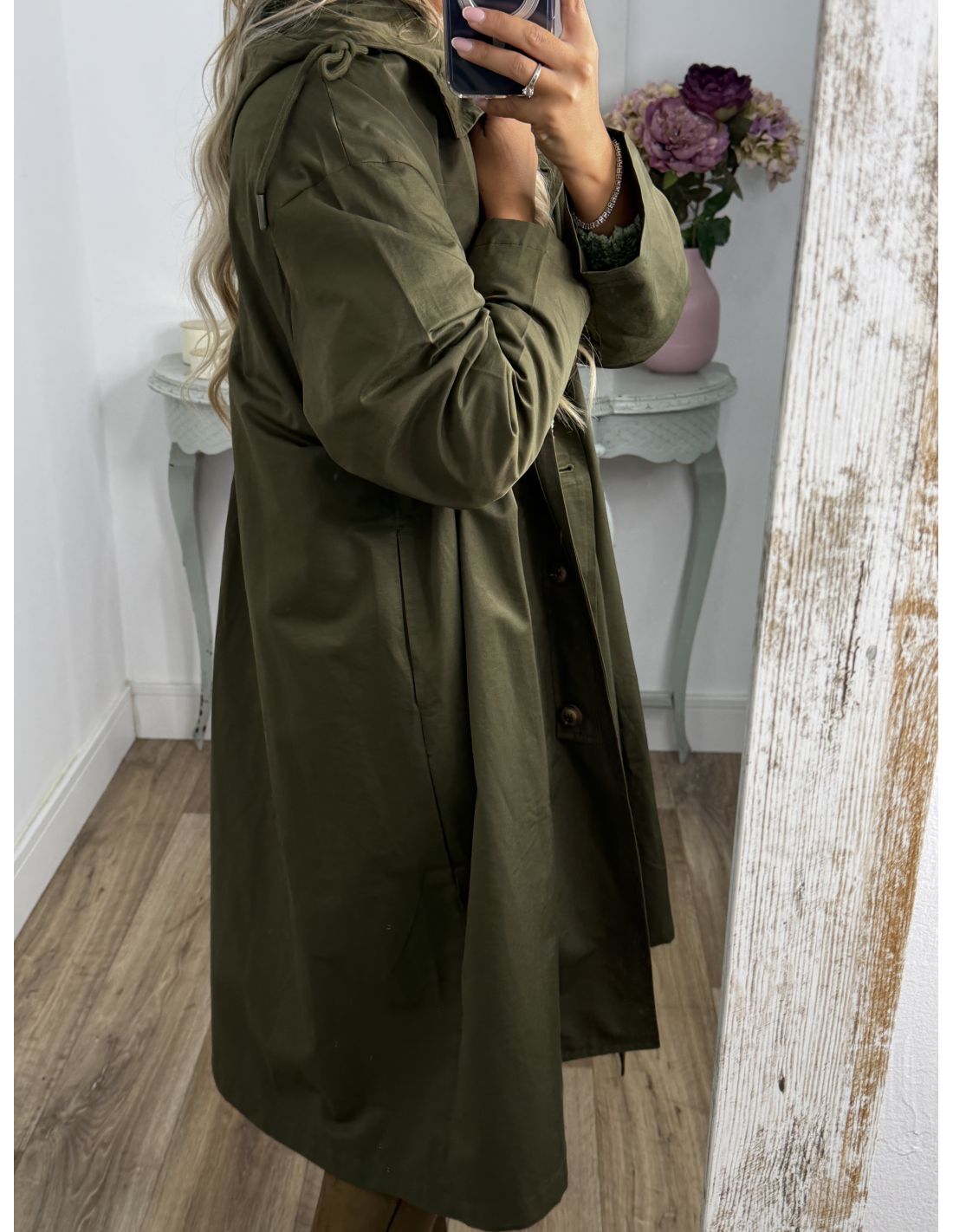Cortavientos largo. No va forrada. Lleva bolsillos y tiene capucha