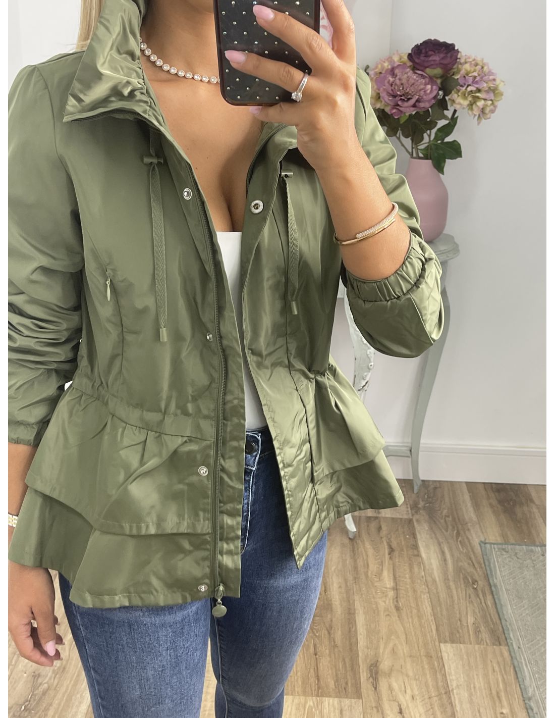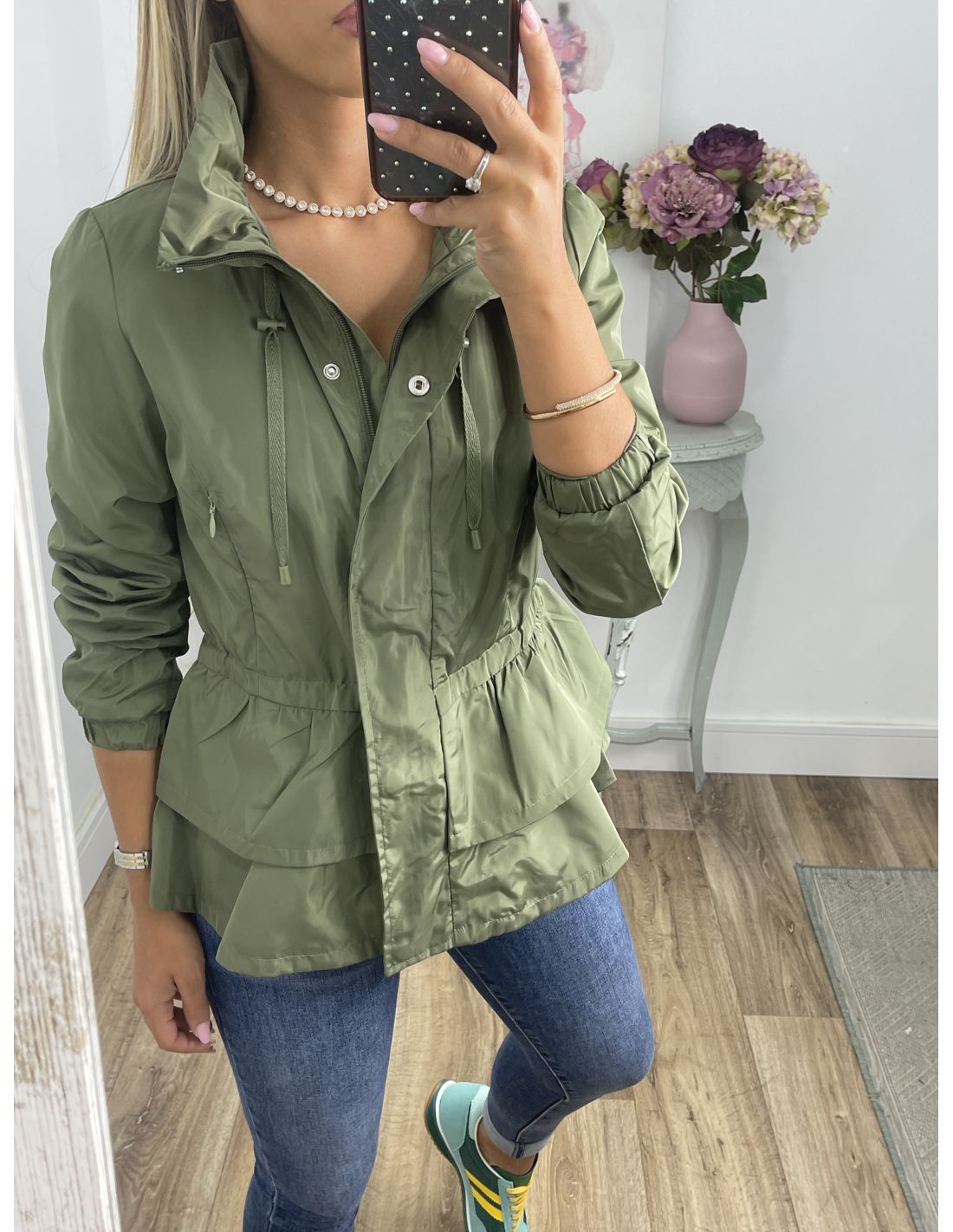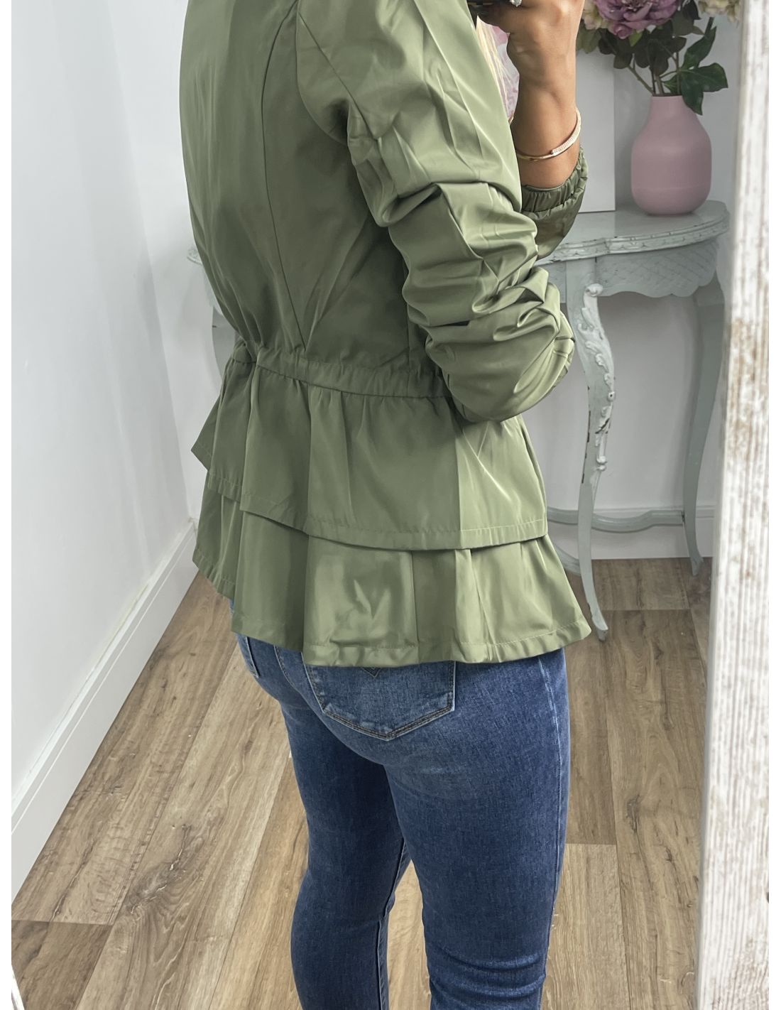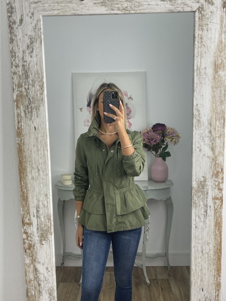 Cortavientos que se cierra con cremallera, va forrado y tiene corte Peplum,