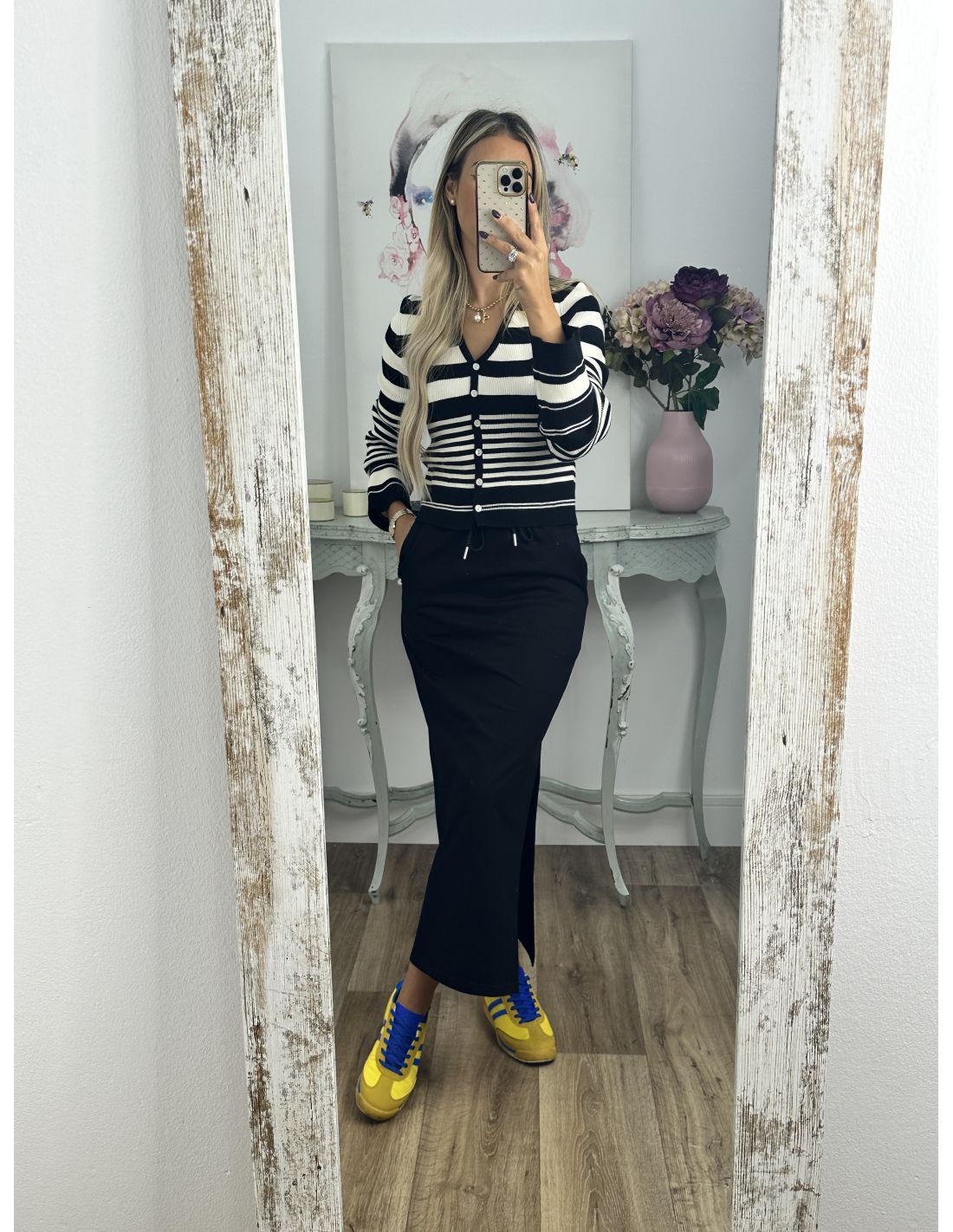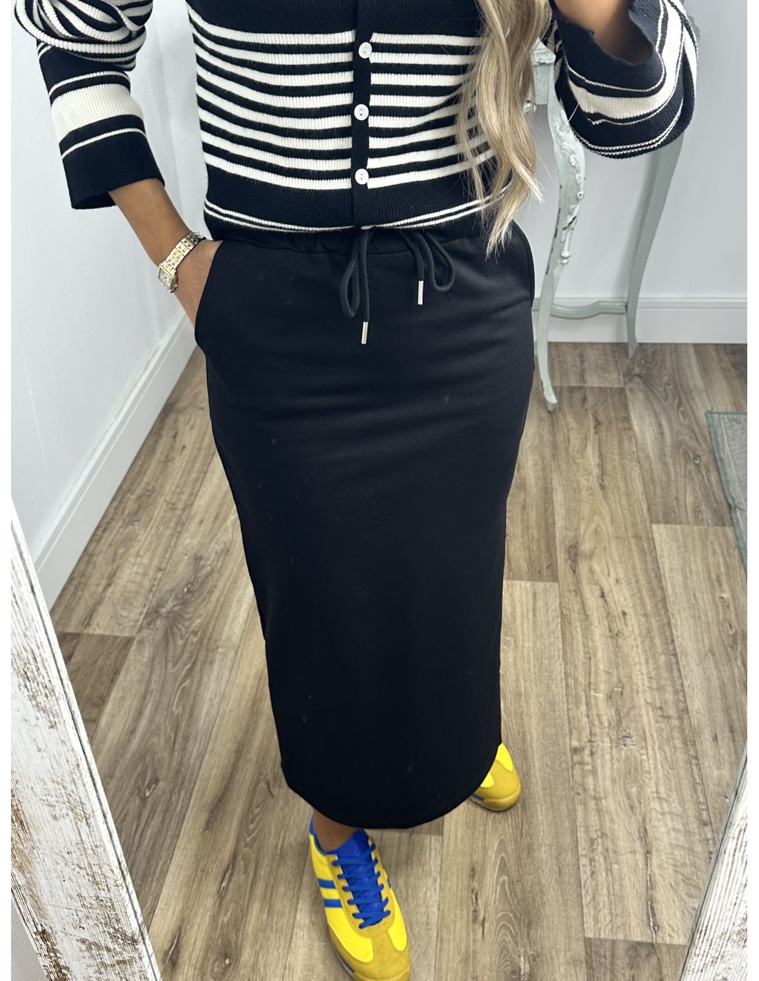 Falda de algodón con goma en la cintura, de corte recto. Tiene bolsillos tipo chino y en la parte de abajo en un lado lleva una raja.