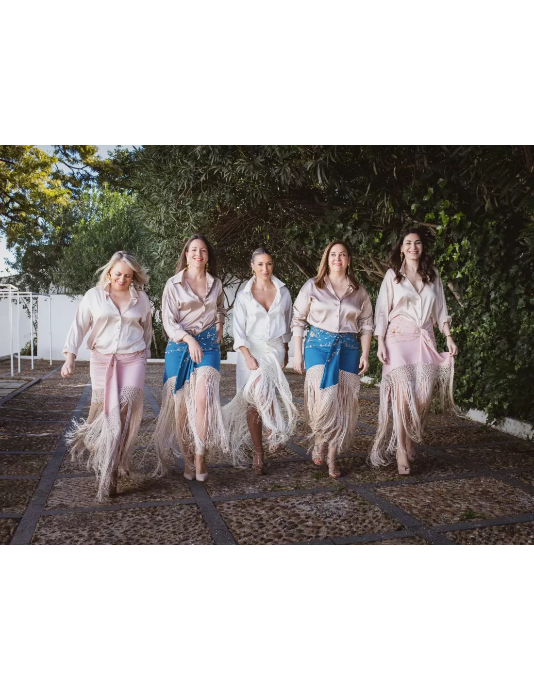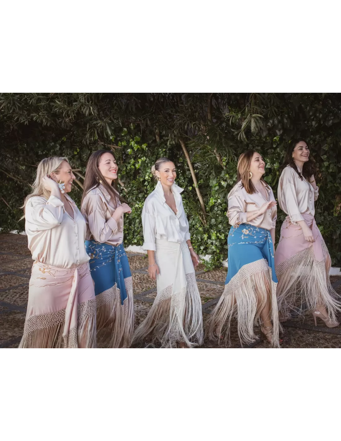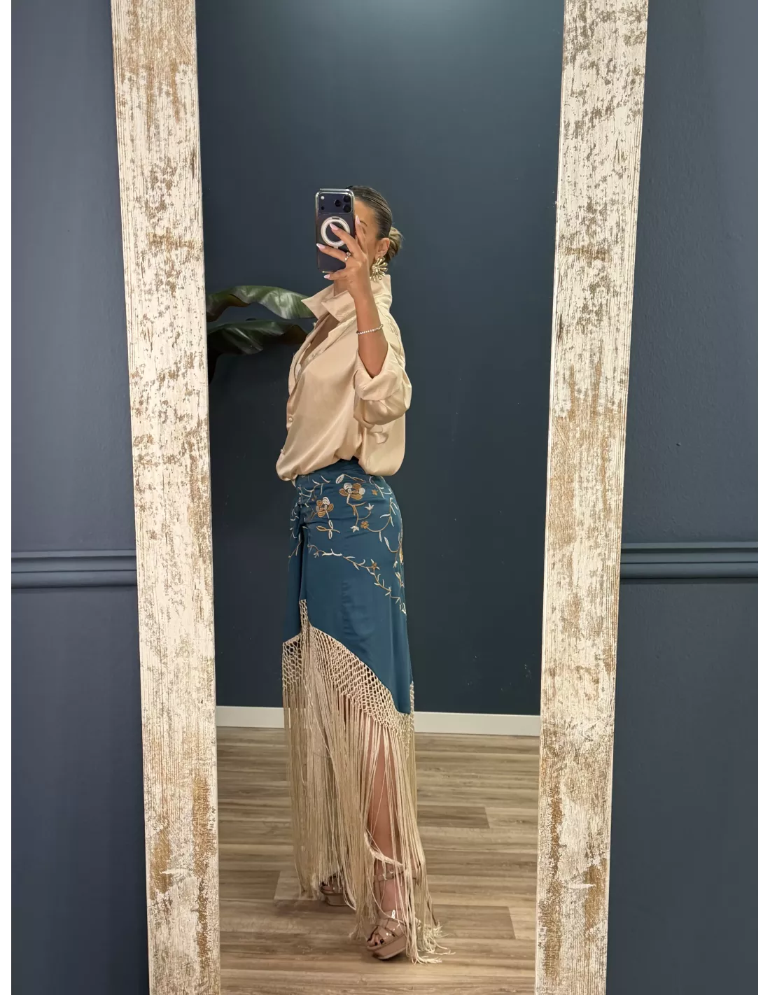 Falda bordada que lleva flecos. Tiene tipo nudo en el centro. Lleva cremallera invisible. Talla amplia. Es una falda que el corte es a la cadera, no a la cintura.