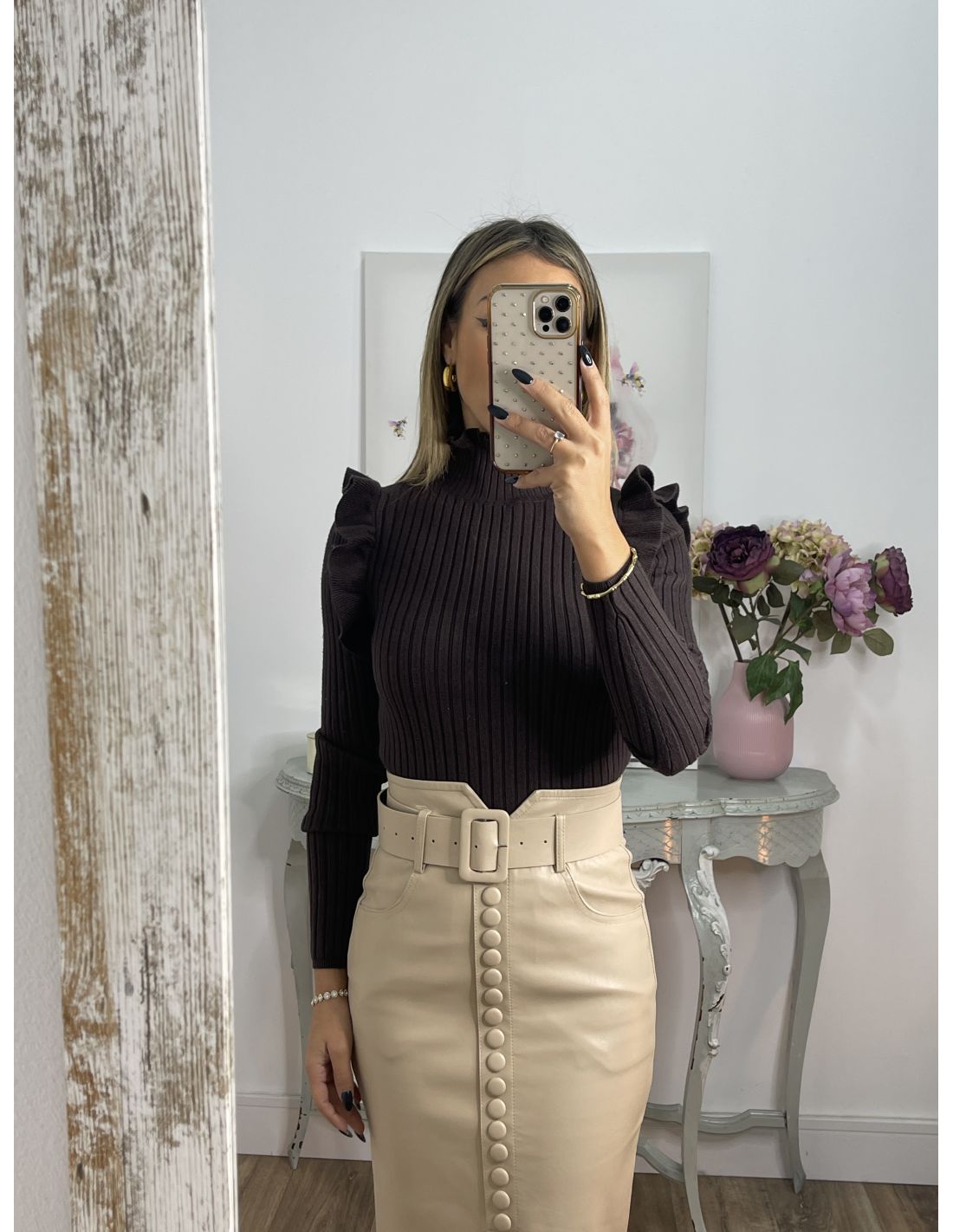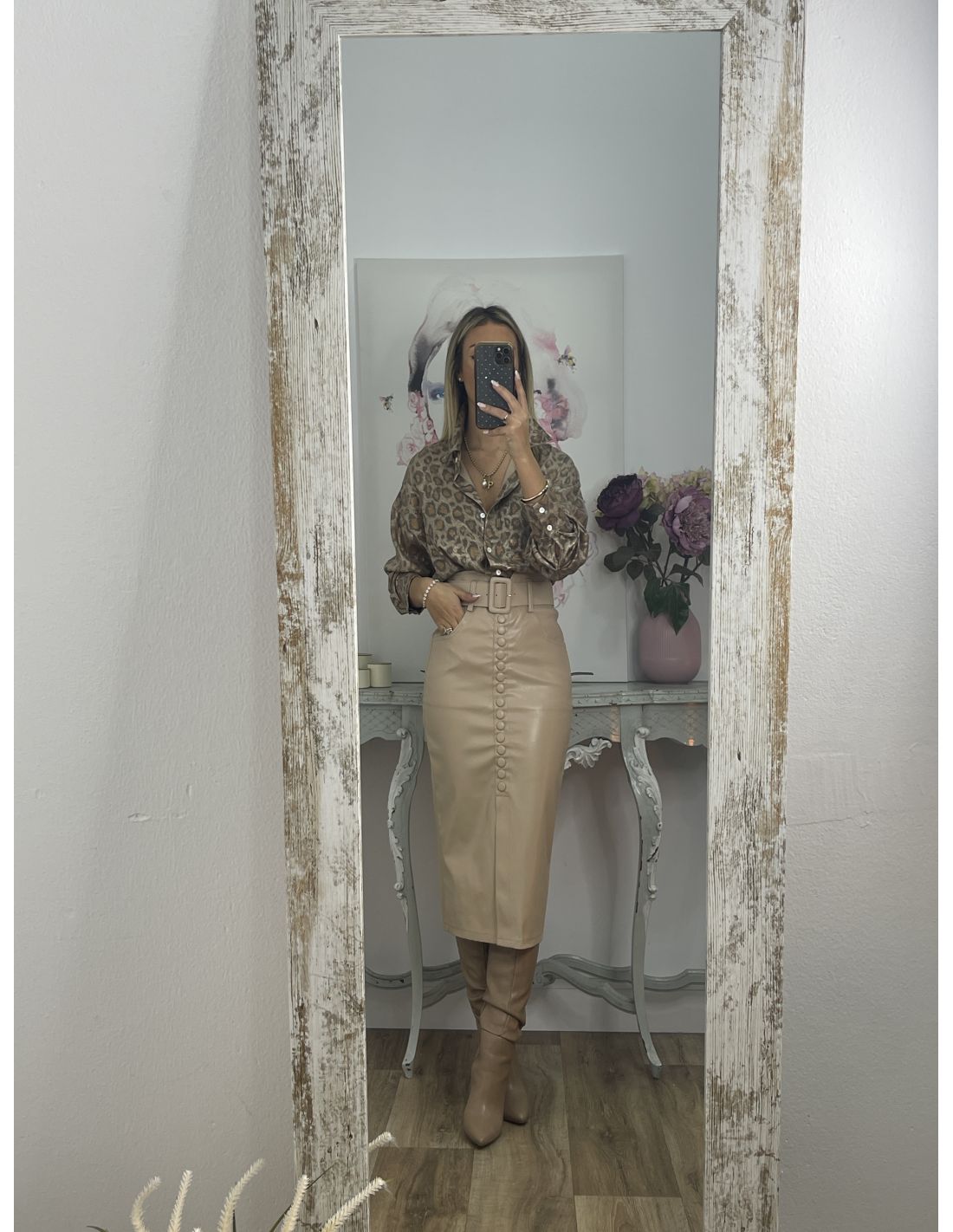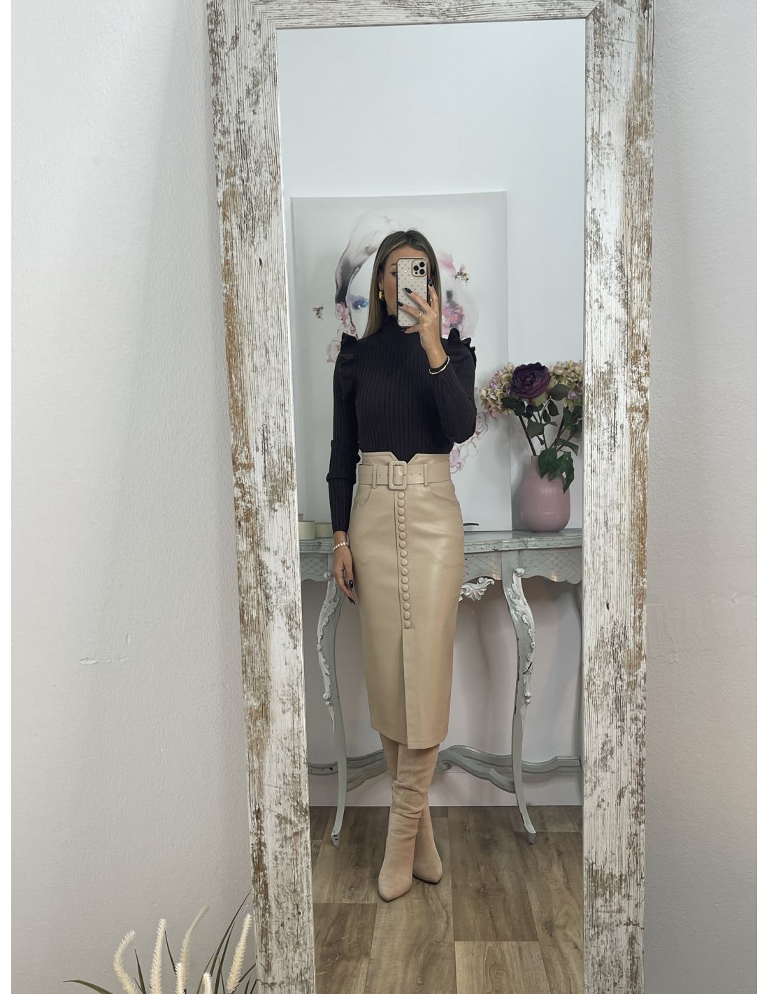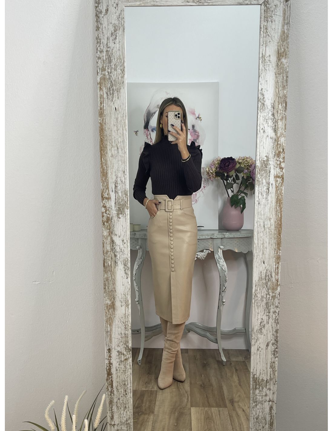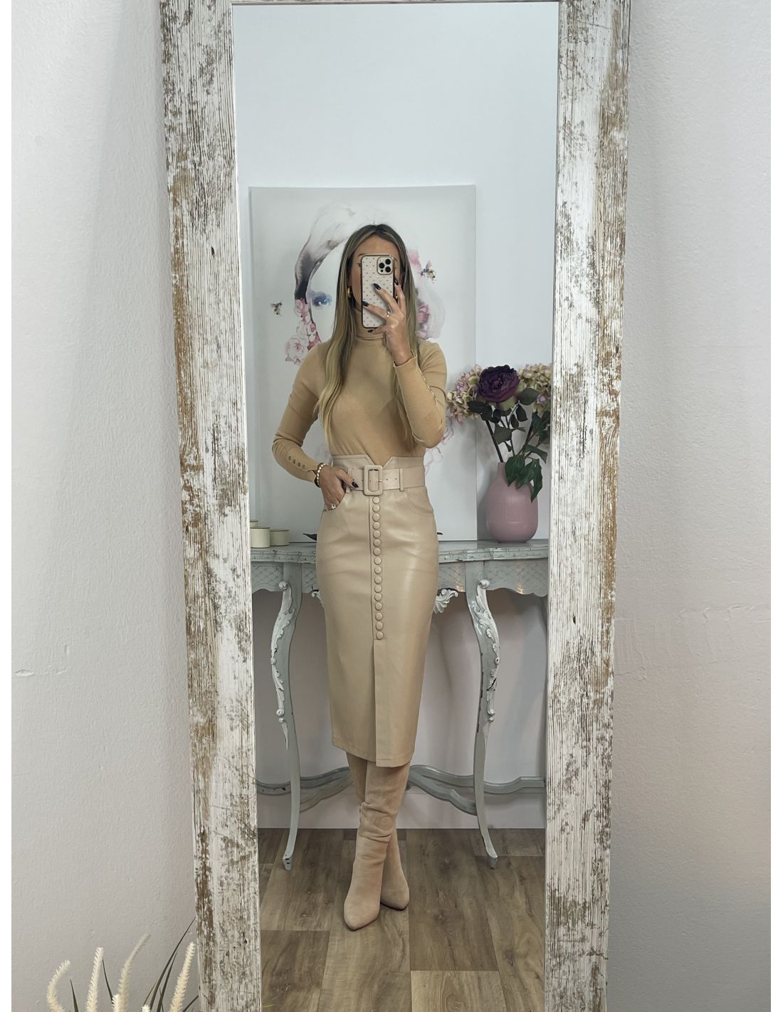 Falda de polipiel, de corte ajustado. Lleva botones de adorno en la parte delantera. Se cierra con cremallera invisible, tiene bolsillos y trae el cinturón.
