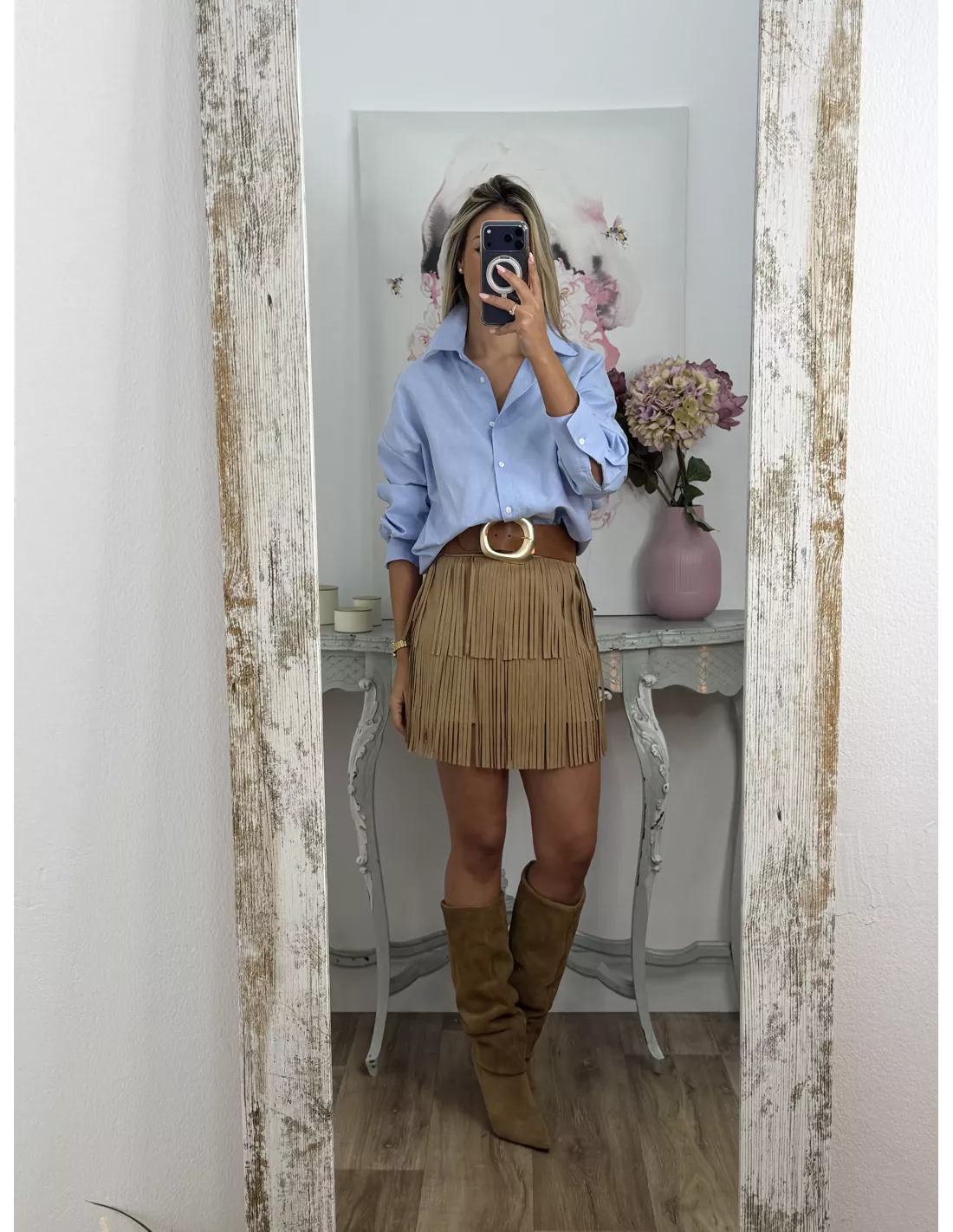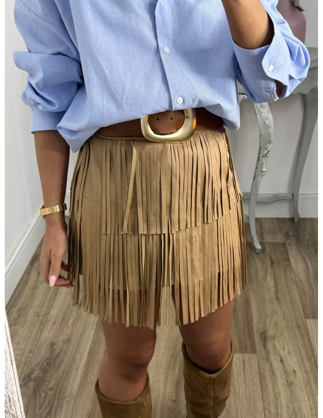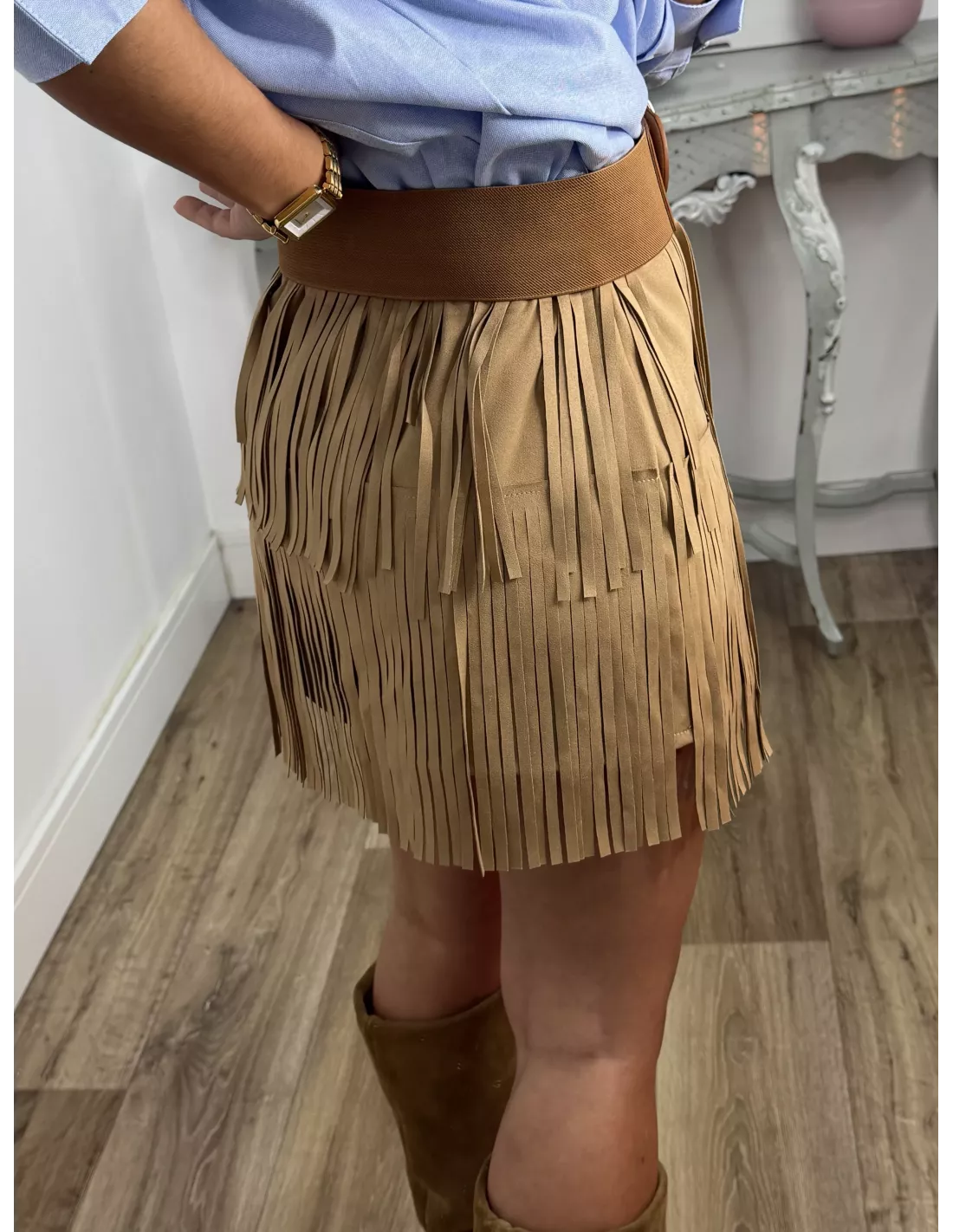 Falda de antelina con flecos. Se cierra con cremallera invisible en el lateral. Es de corte recto.